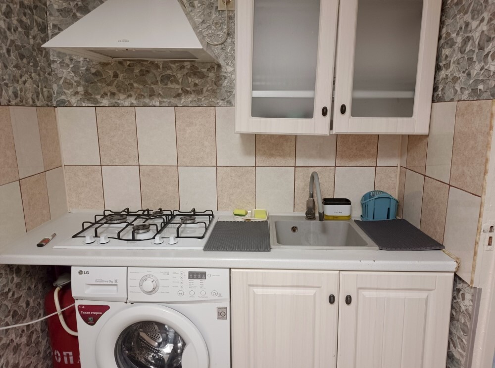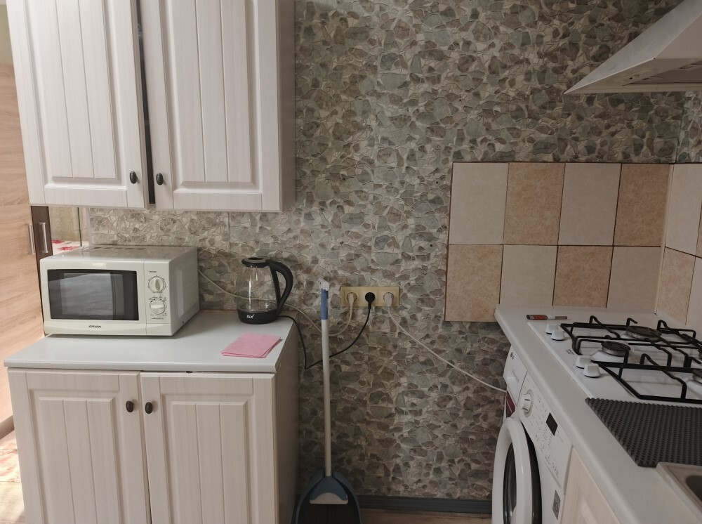На комфортной кухне есть газовая плита, столовые приборы, набор посуды, кофеварка, электрочайник, холодильник.