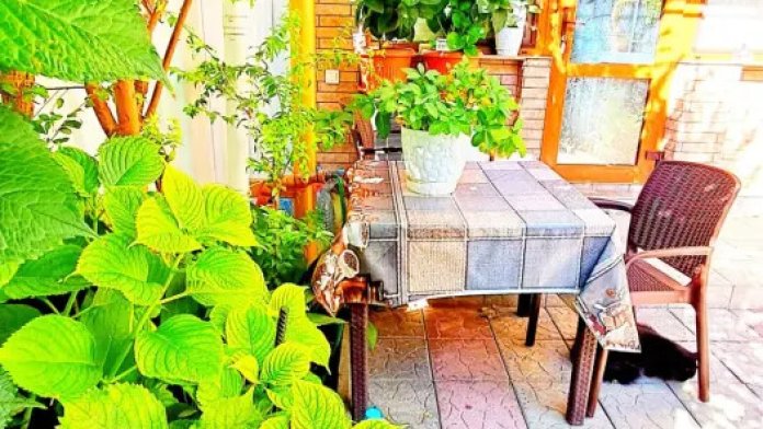 Свой двор с закрывающейся на ключ металлической калиткой, мангал, терраса с открывающимся видом на море и горы, где можно приятно провести время. Во дворе произрастают пальмы.