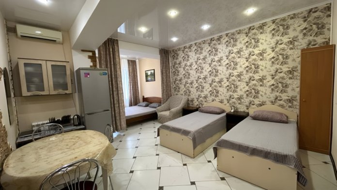 Внутри квартиры в Ялте вы найдете все необходимое для комфортного проживания - отличное Цифровое ТВ, Wi-Fi, холодильник, кондиционер, сан. узел и душ, а также круглосуточную горячую и холодную воду. Более того, здесь есть кухонный уголок с индукционной плитой и всей необходимой посудой. Студия вмещает до 5 человек и имеет широкую двуспальную кровать, две односпальные кровати и даже кресло-кровать.