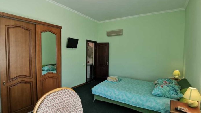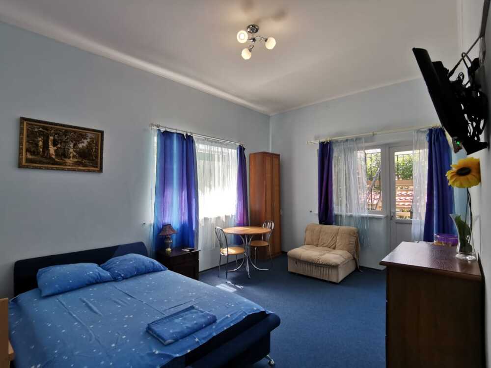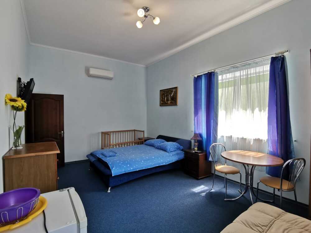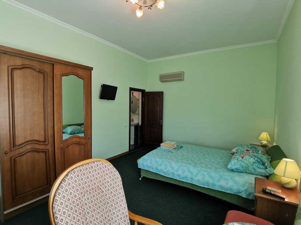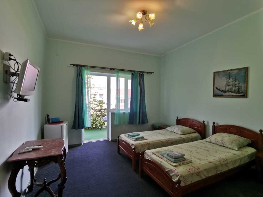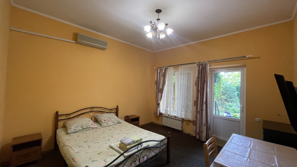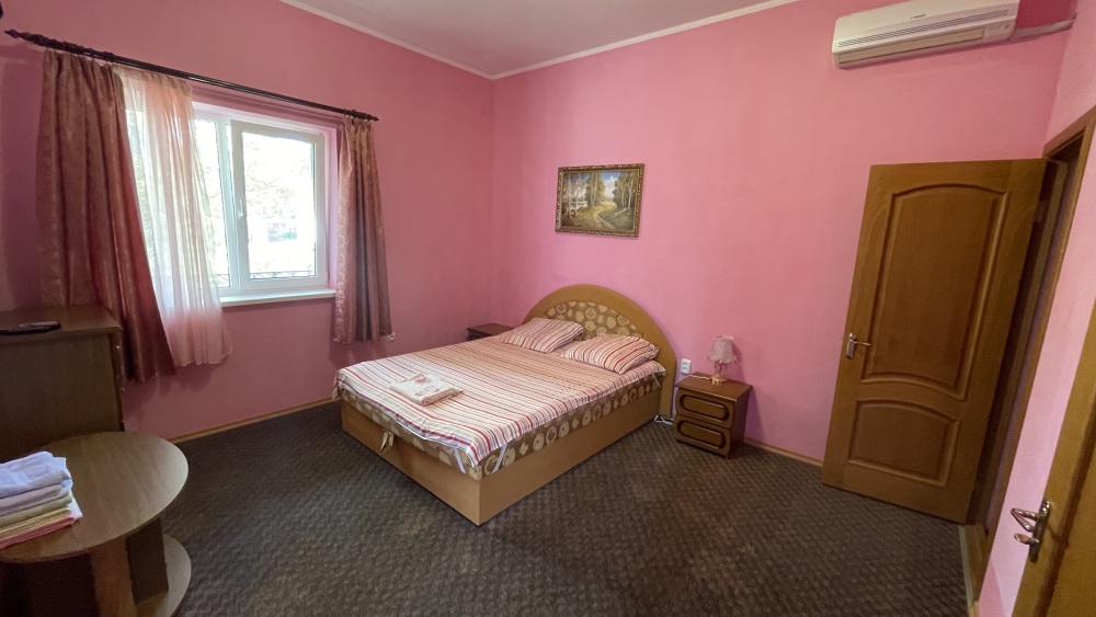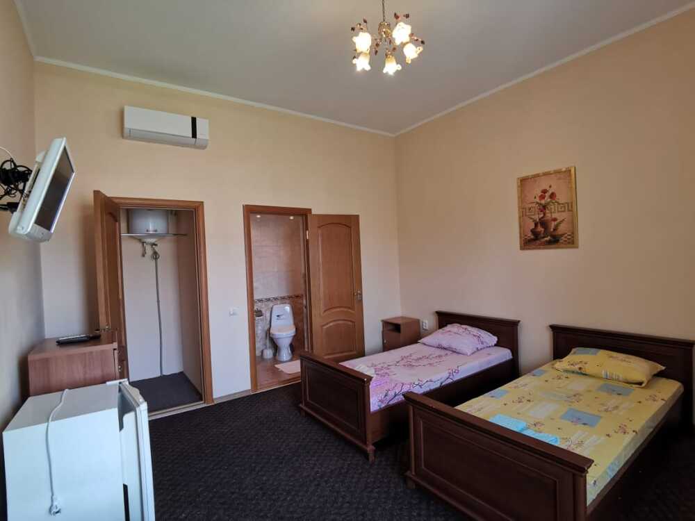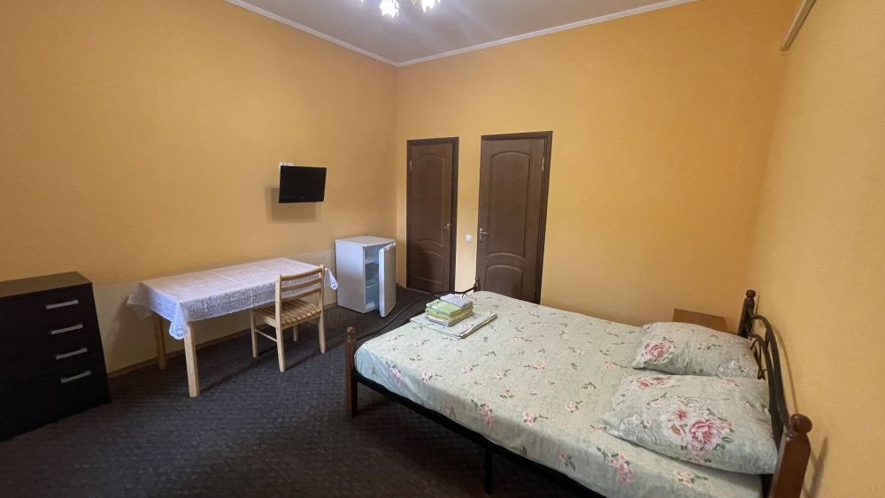 В номере: двуспальная кровать;кресло-кровать; санузел;холодильник;телевизор;сплит-система;мебель