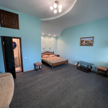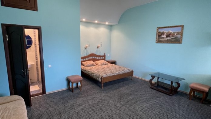 В номере: двуспальная кровать; диван; холодильник; телевизор; сейф; мебель; санузел; кухонный уголок; набор посуды; микроволновка.