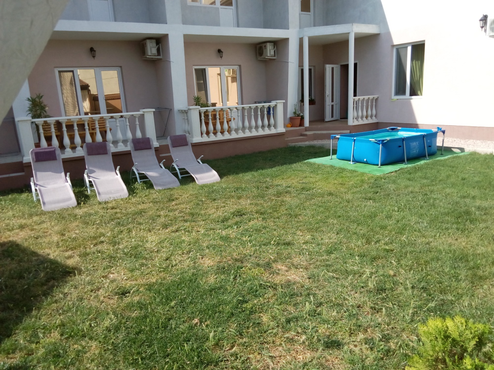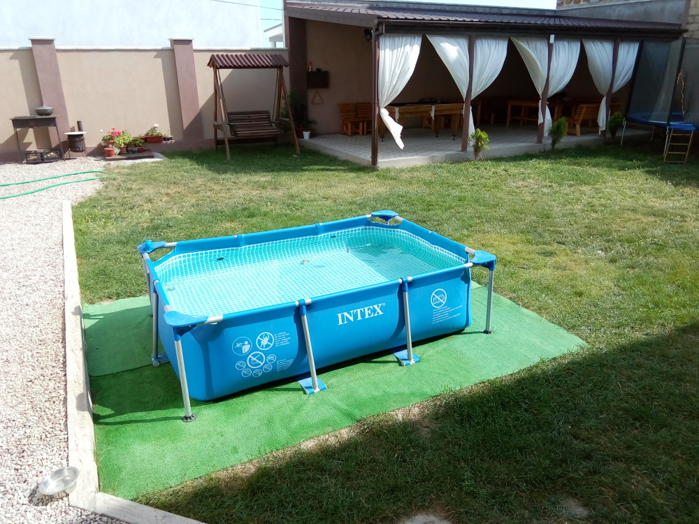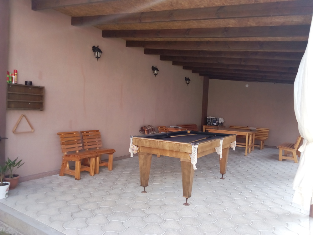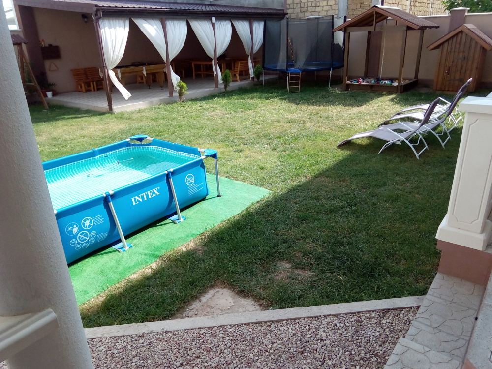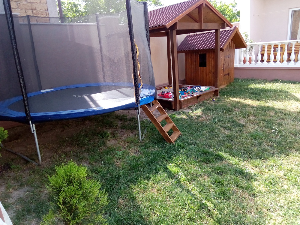 Закрытый благоустроенный двор. Во дворе: детский бассейн, песочница, детский домик, игрушки, садовые качели, бильярд, мангал, беседка.