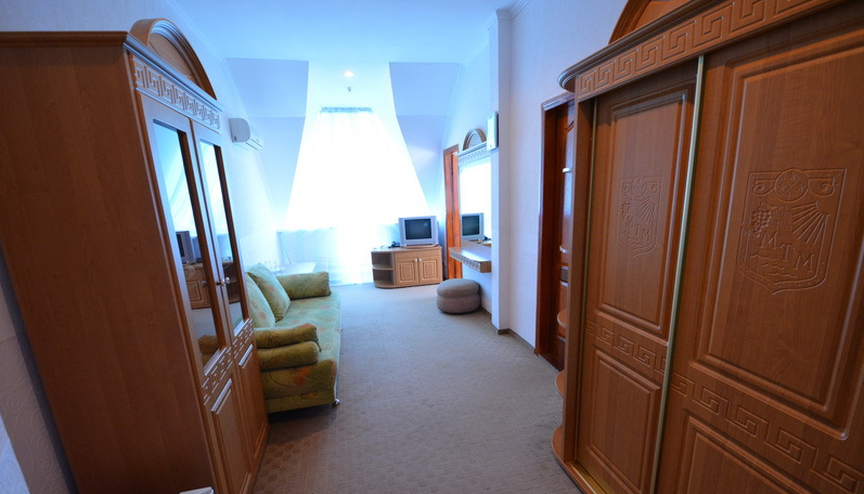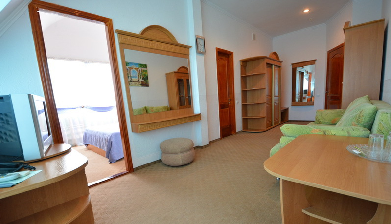 Мебель: двухспальная кровать, прикроватные тумбочки, шкаф плательный, диван-кровать, журнальный столик, сейф.
