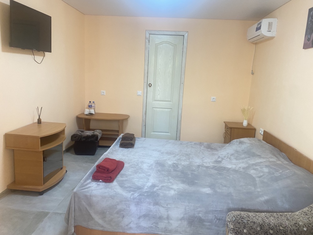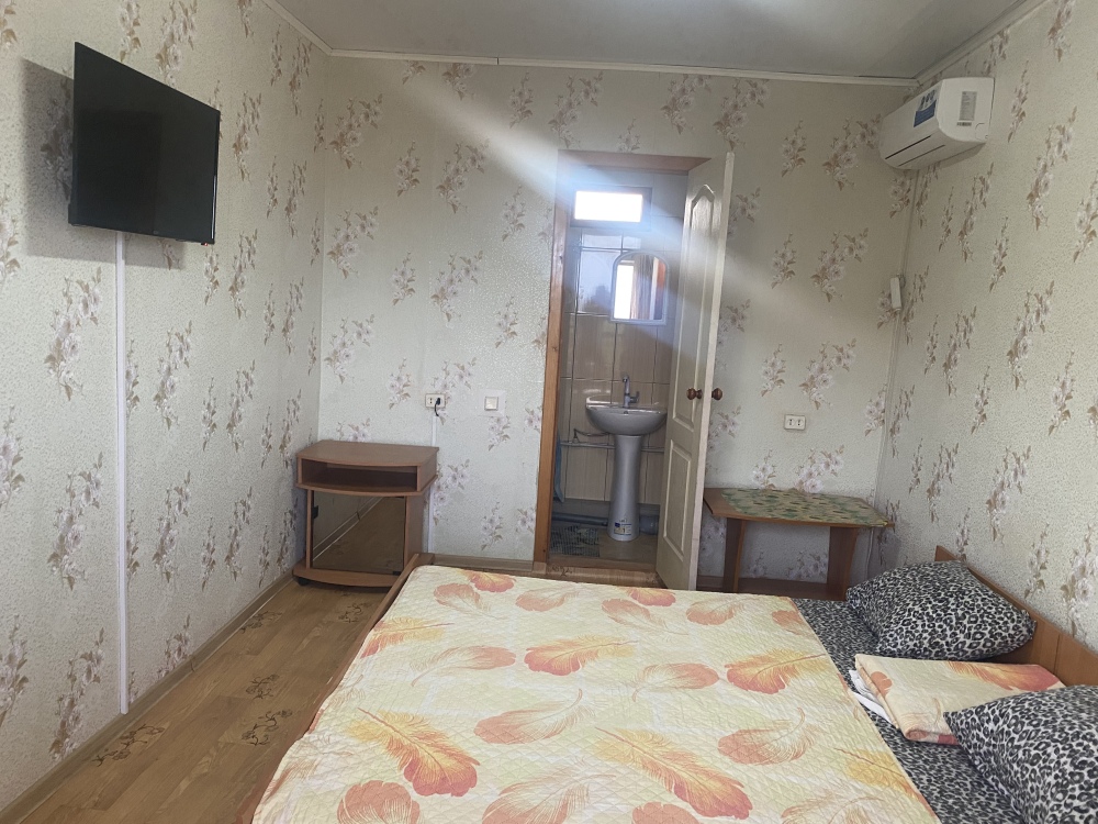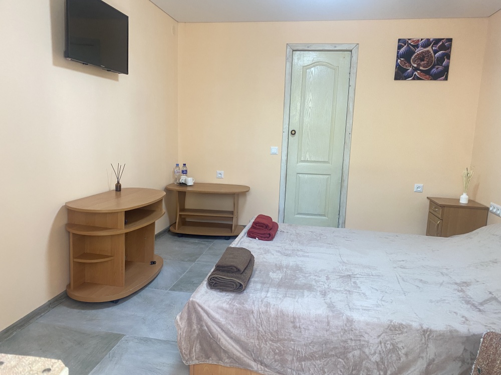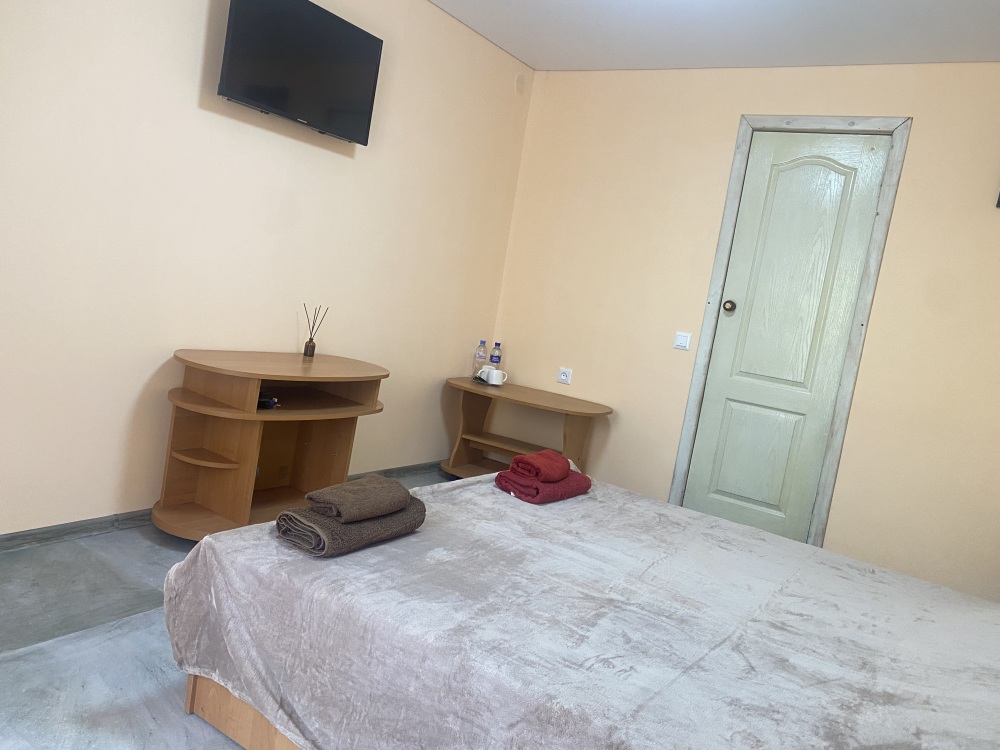 Однокомнатный номер . В номере: односпальные кровати, шкаф, прикроватные тумбочки, журнальный столик, зеркало, сплит-система, телевизор, холодильник. В ванной комнате: туалет, душ, умывальник.