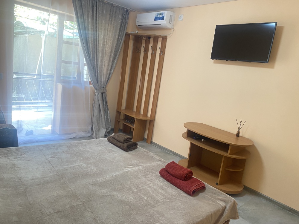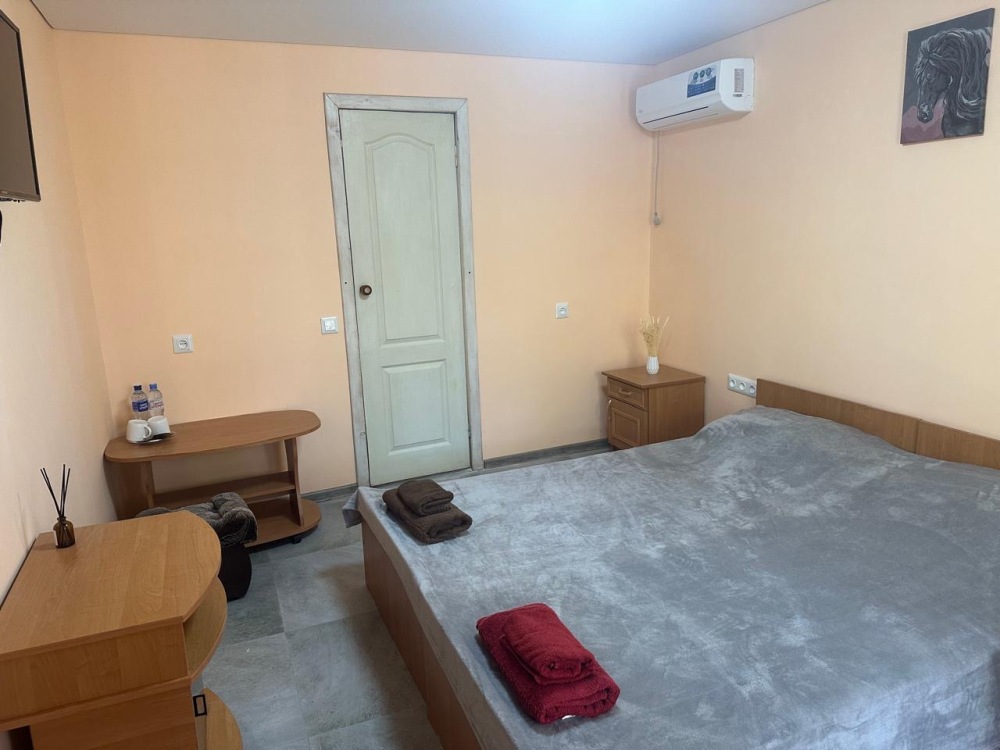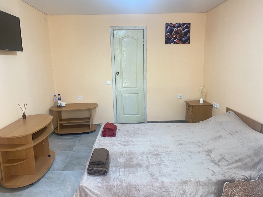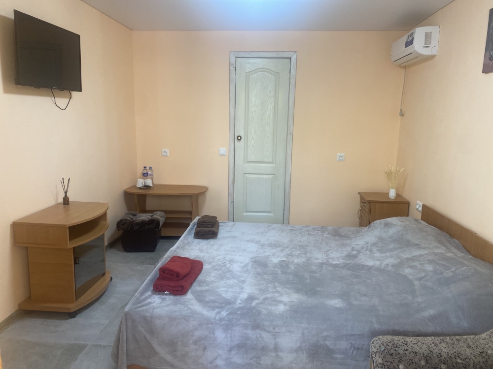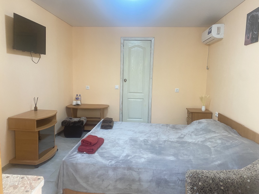 Однокомнатный номер . В номере: односпальные кровати, шкаф, прикроватные тумбочки, журнальный столик, зеркало, сплит-система, телевизор, холодильник. В ванной комнате: туалет, душ, умывальник.