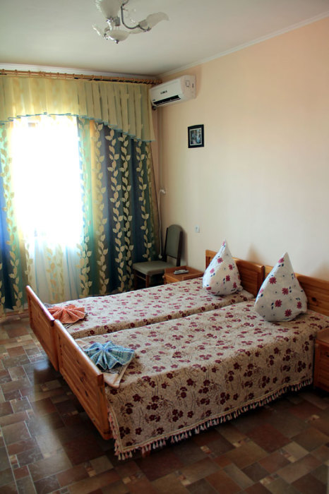 Пансионат предлагает гостям расположится в комфортабельных 2,3,4-местных номерах с чудесным видом на панораму Азовского моря, мыса Казантин и города Щелкино. Пансионат расположен в 200 метрах от моря (300 м. от пляжа) и на достаточном расстоянии от шумных ночных клубов и баров.