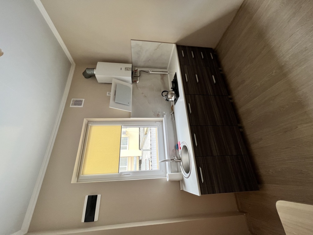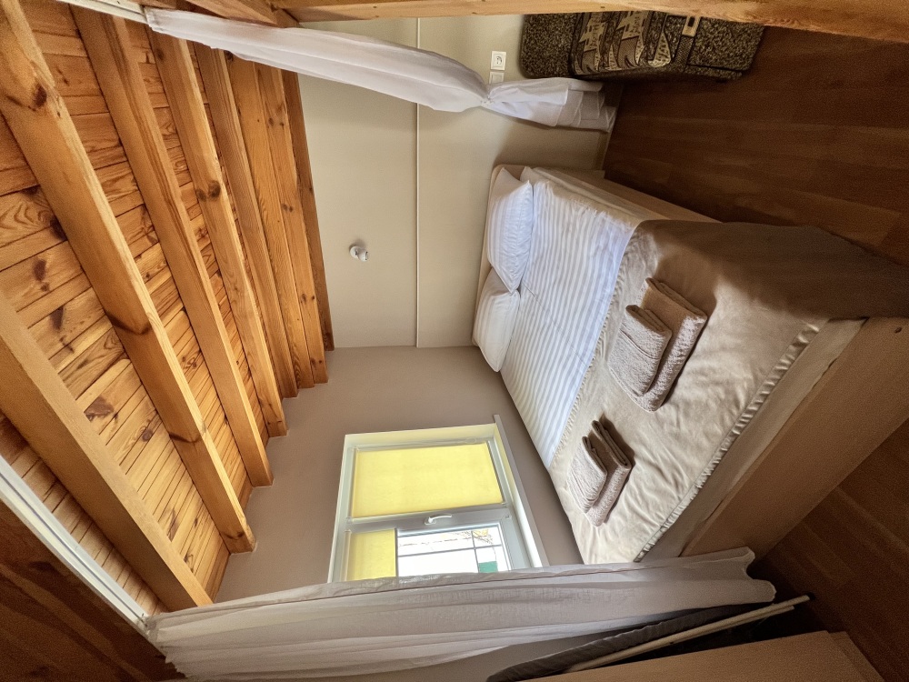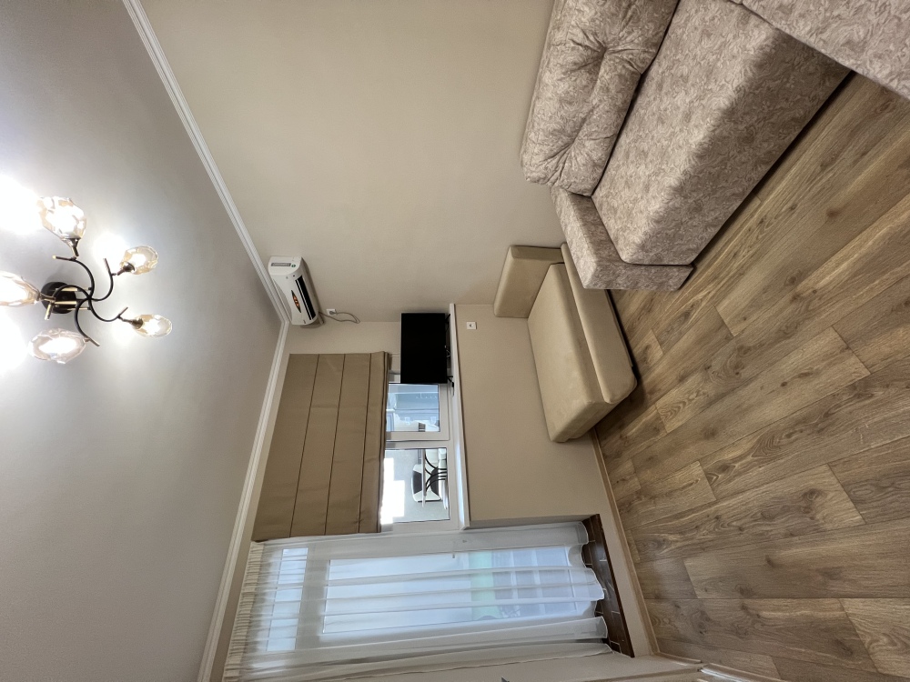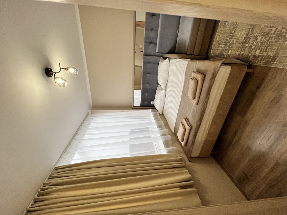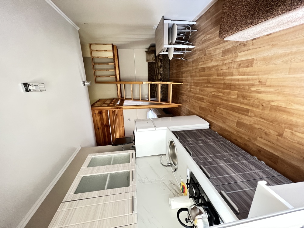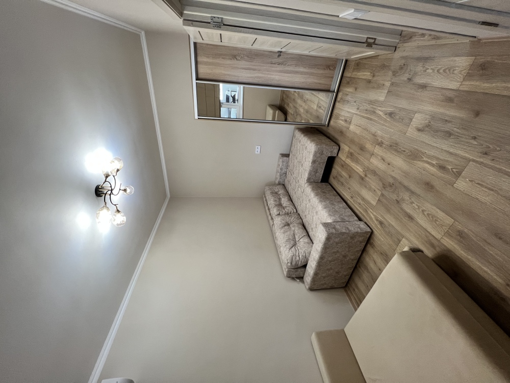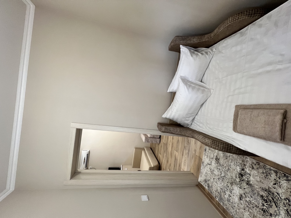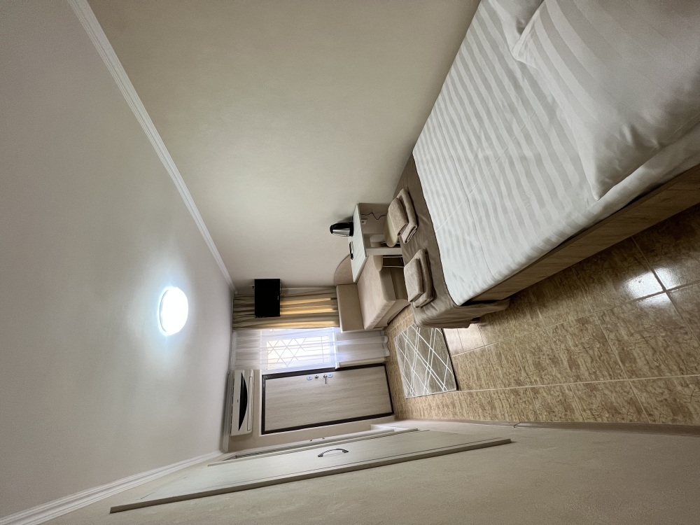Постельное белье, утюг, гладильная доска, полотенца; мойка, СВЧ, мультиварка, посуда; шкаф , тумбочка прикроватная, стол, стулья.