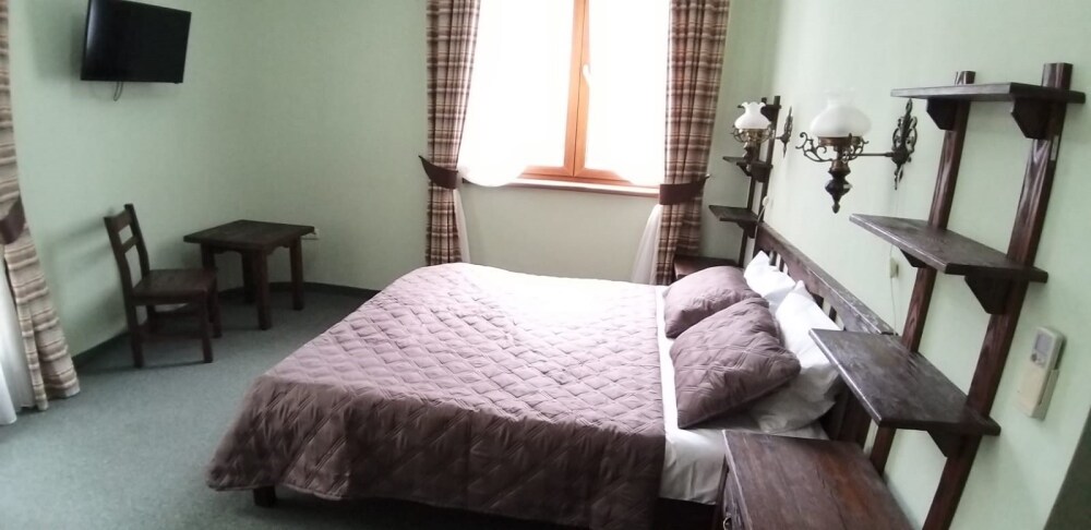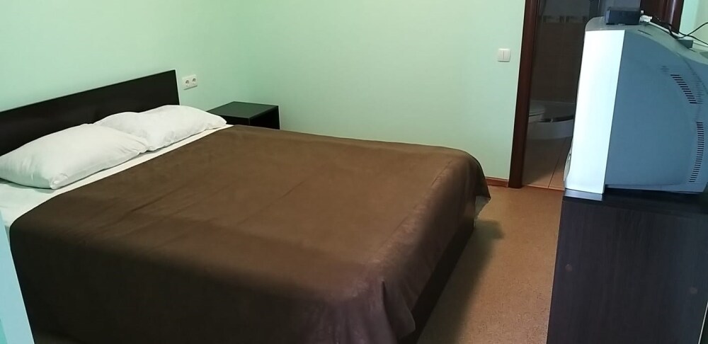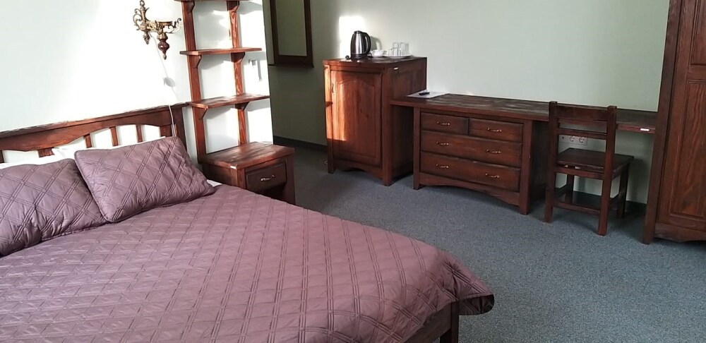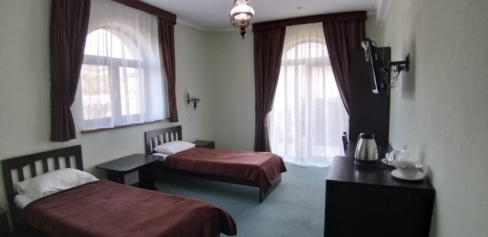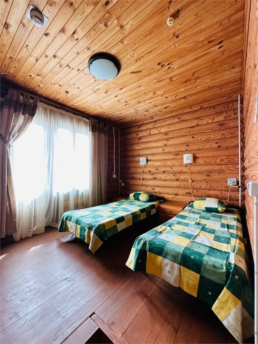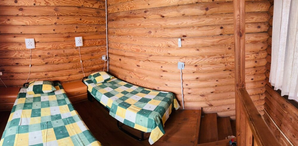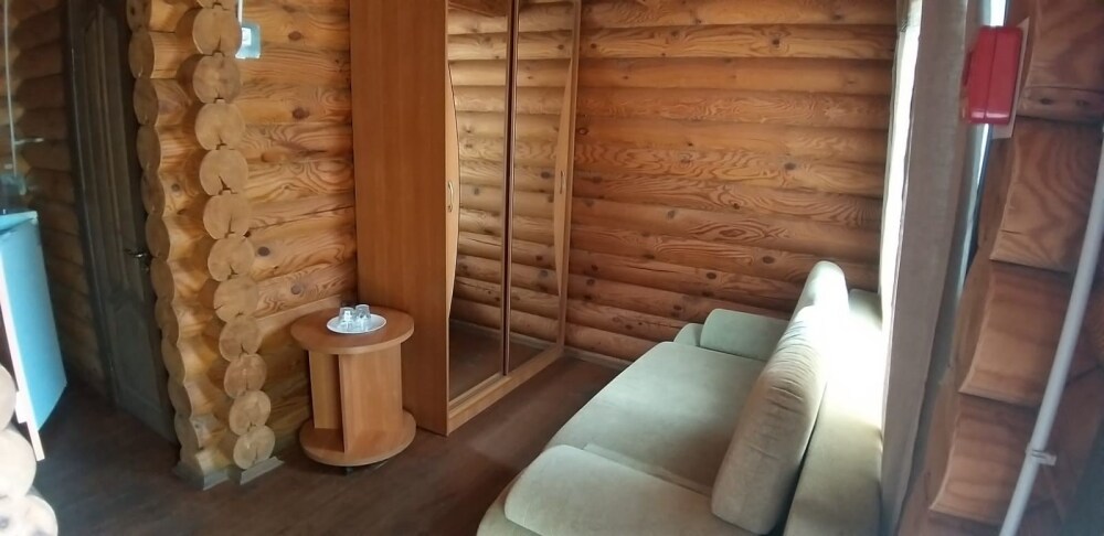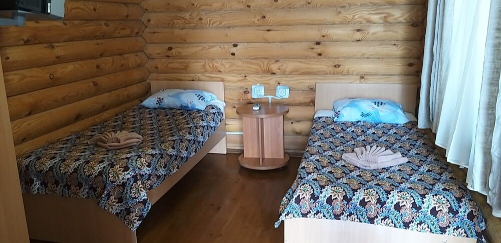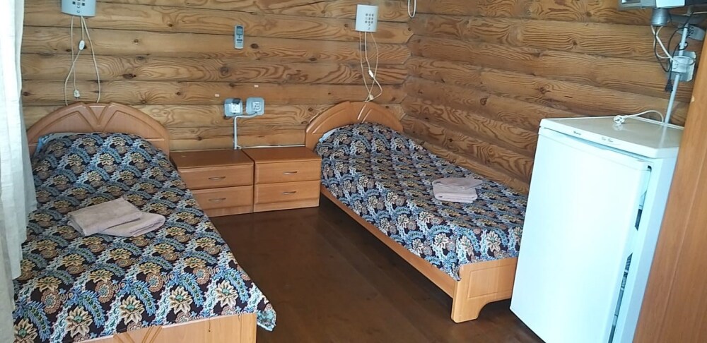 Эконом в сруб: однокомнатный двухместный номер для комфортного и бюджетного проживания с двумя односпальными кроватями, санузлом, кондиционером, горячей водой, холодильником, феном.