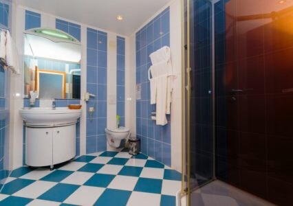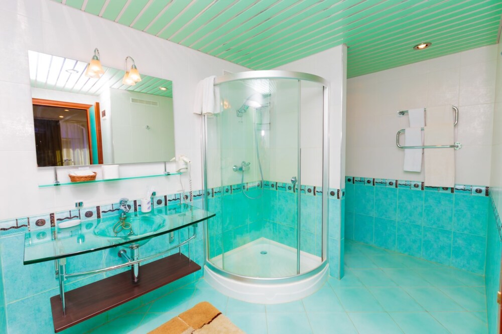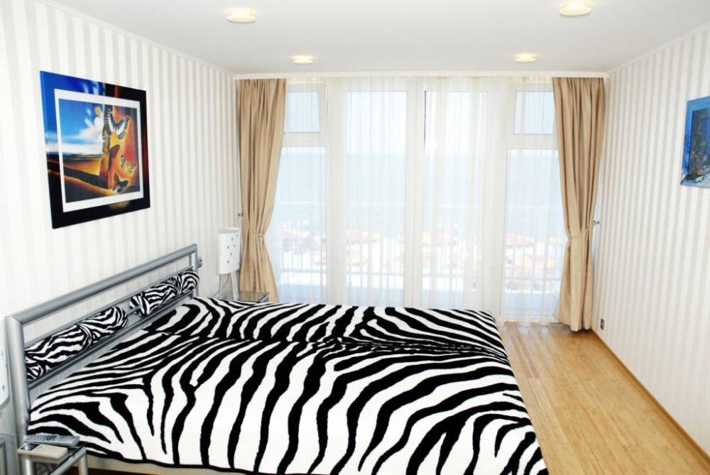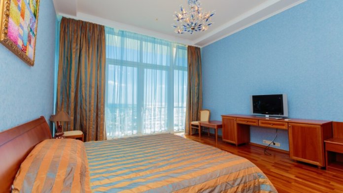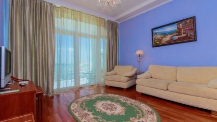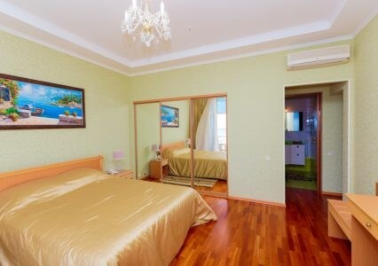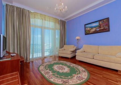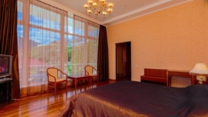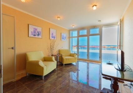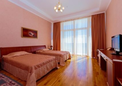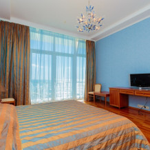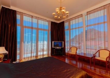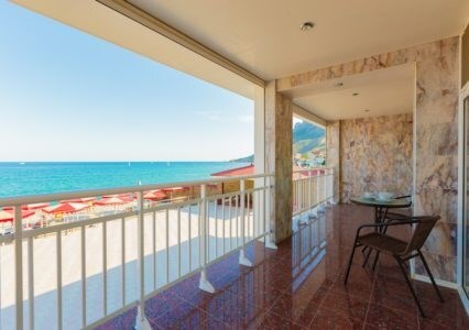Просторные номера с удобной и современной мебелью, большие ванные комнаты с итальянской сантехникой. Панорамный номер с балконом с видом на море.
