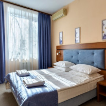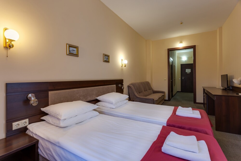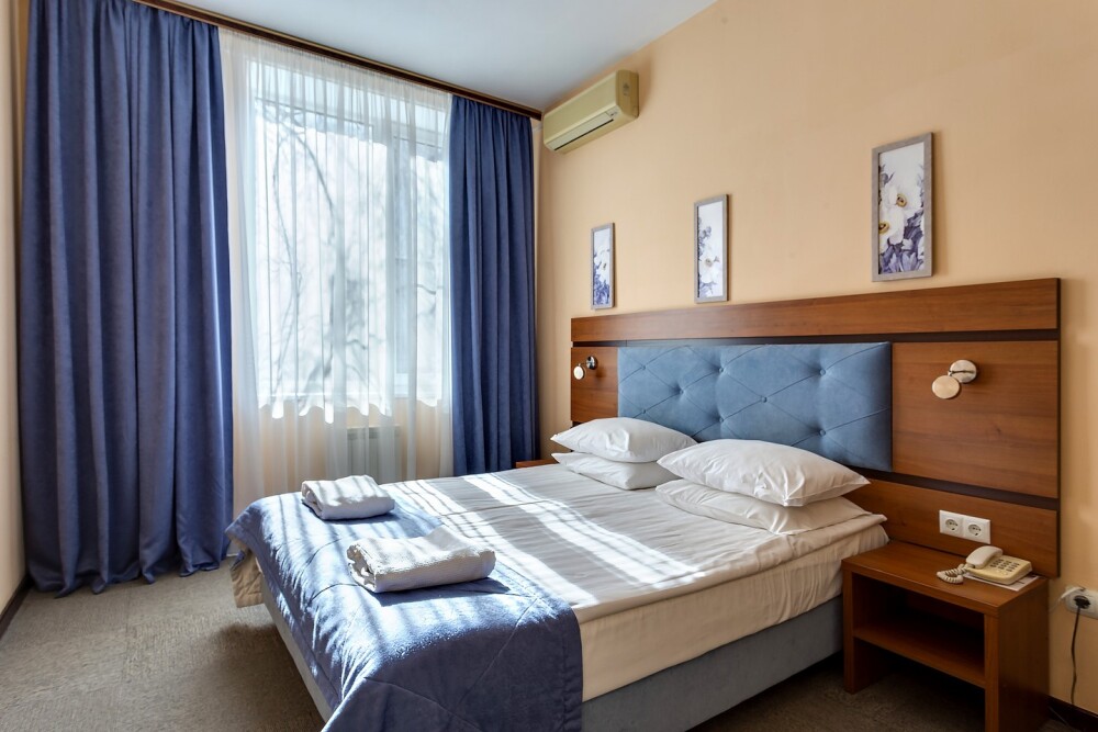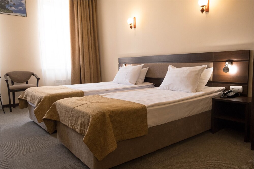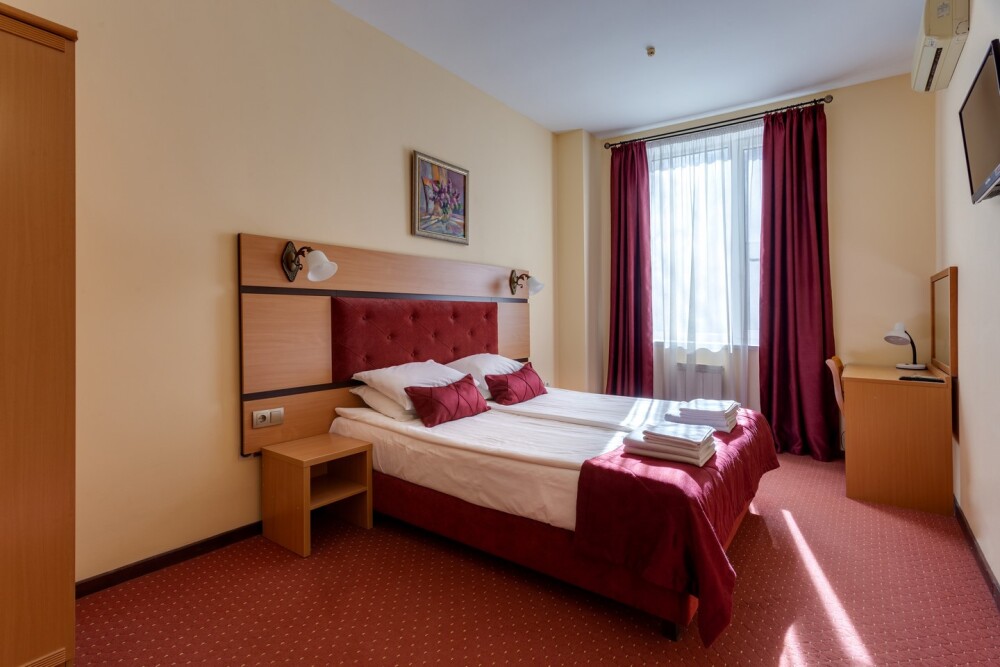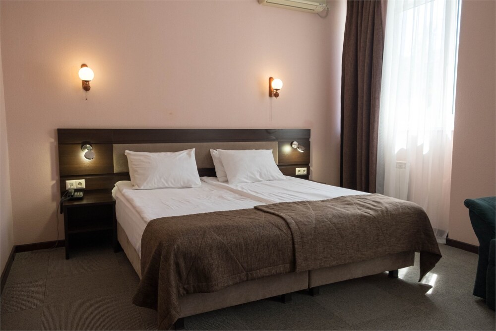 Номер Стандарт А - однокомнатный двухместный номер, с одной двуспальной или с двумя раздельными кроватями. Номера на 2-м, 3-м, 4-м этажах.
