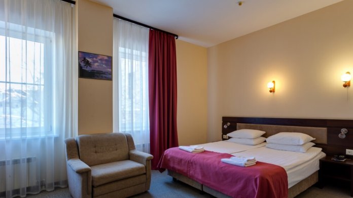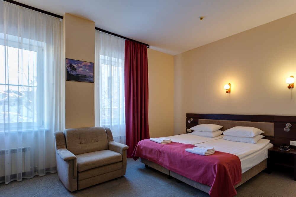 Номер Стандарт B - однокомнатный двухместный номер, с одной двуспальной или с двумя раздельными кроватями. Номера на2,3,4-этажах.