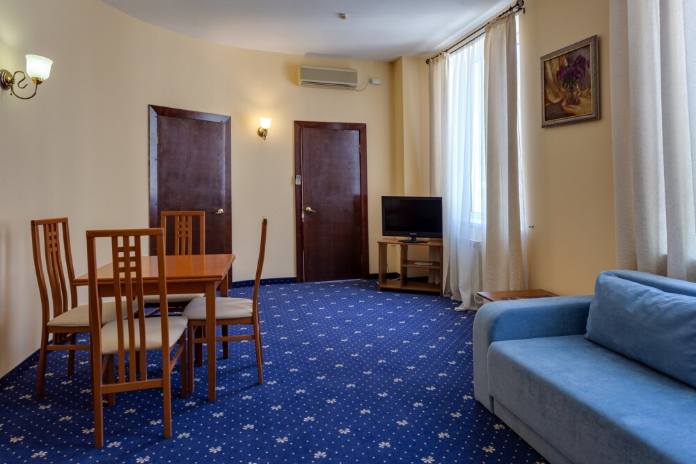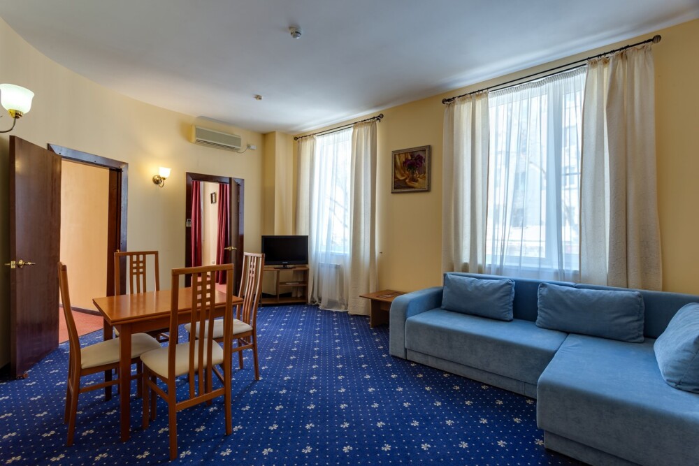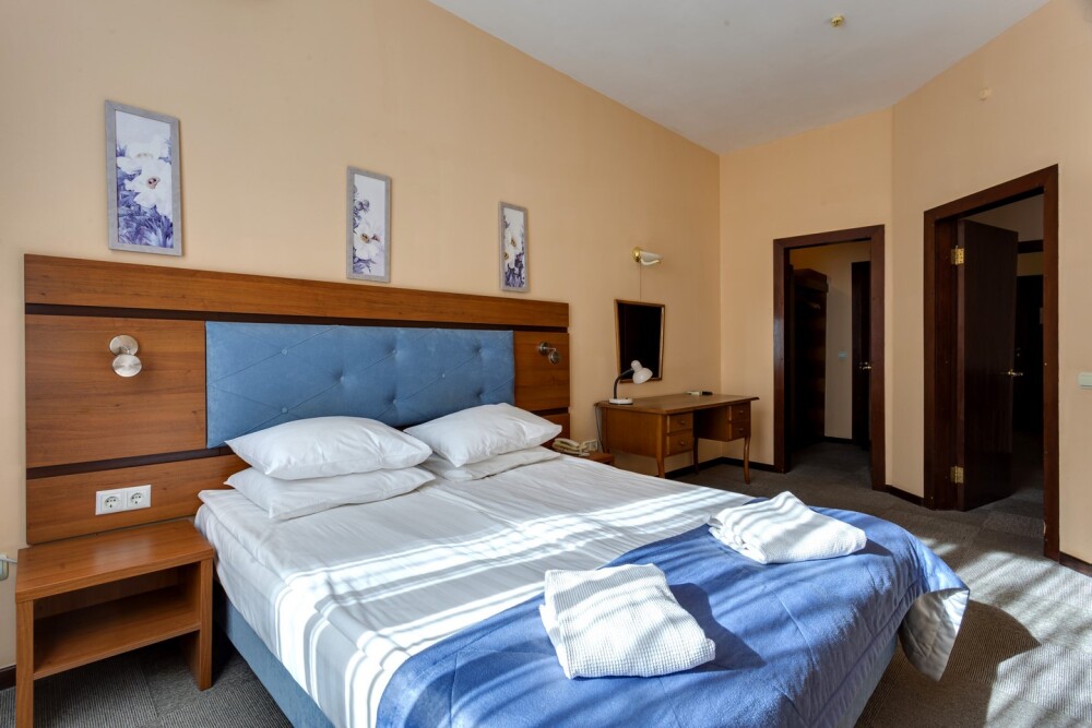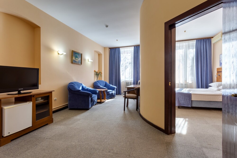 Двухкомнатный номер Люкс предусматривает размещение двух человек на основных местах (большая двуспальная кровать или две односпальные кровати на выбор), а так-же размещение до двух человек на дополнительном месте (большой диван).