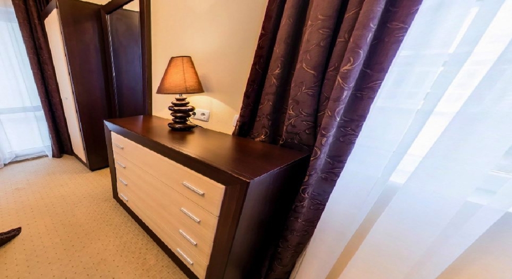 Двуспальная кровать или 2 односпальные кровати, комод, шкаф, 2 тумбочки, сейф, кондиционер, телевизор, стол, стулья, мини-холодильник.