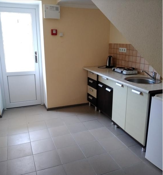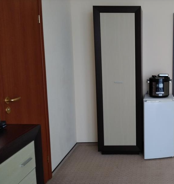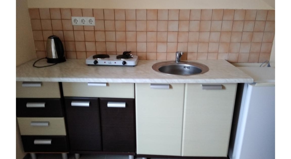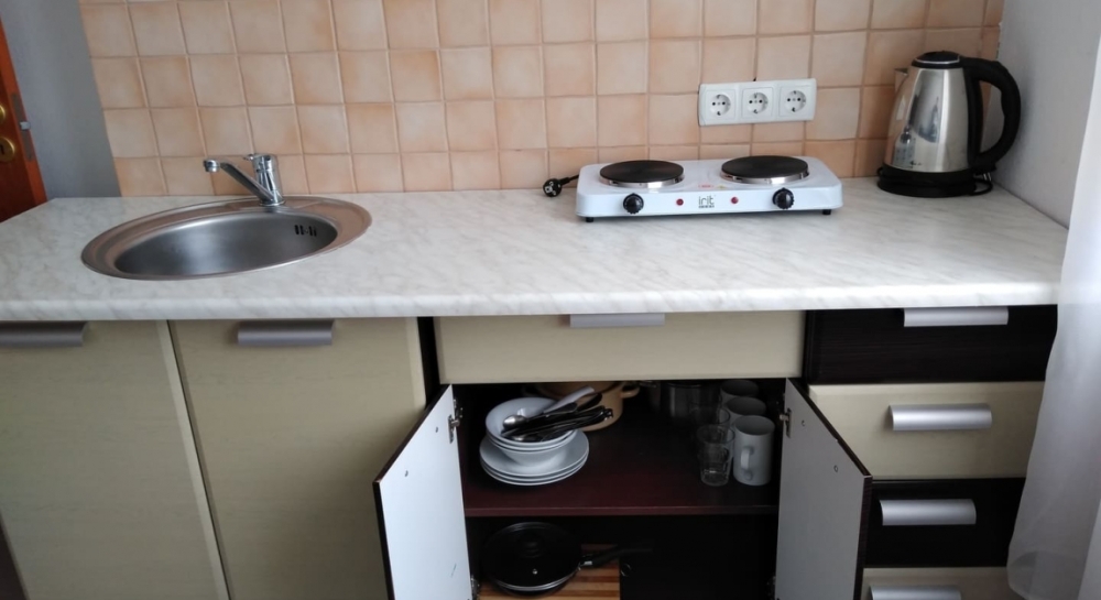 Холл вместе с мини-кухней – мини-стенка, мини-холодильник, эл. чайник, эл. плита на 1 конфорку, раковина, посуда: кастрюля, сковорода, стаканы, ложки, тарелки.