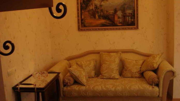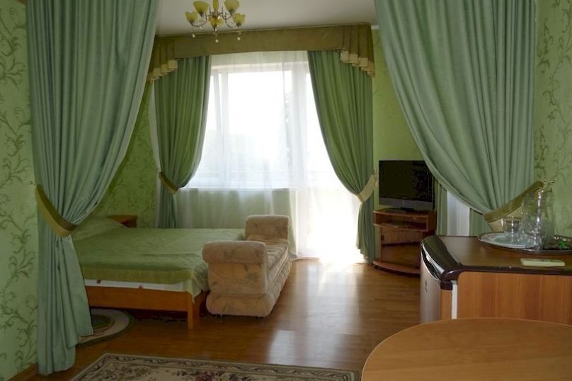 В номере 2-х спальная кровать 160х200, диван, платяной шкаф, телефон, мини-бар, туалетный столик, стол, посуда.