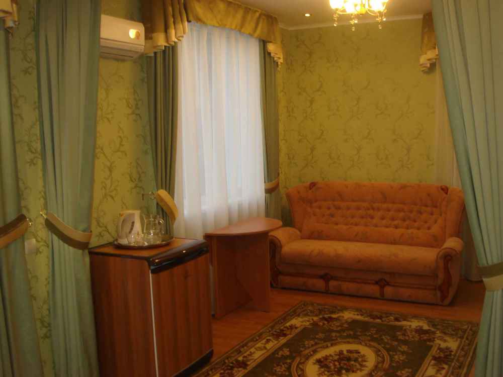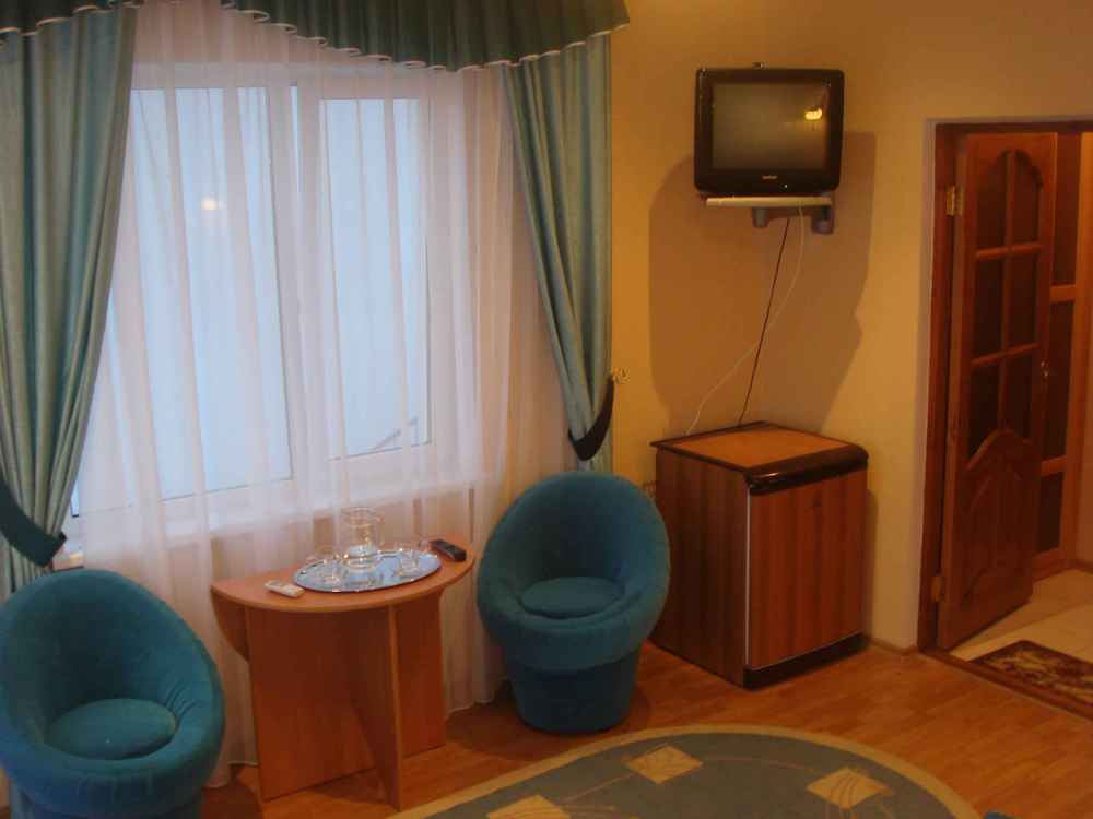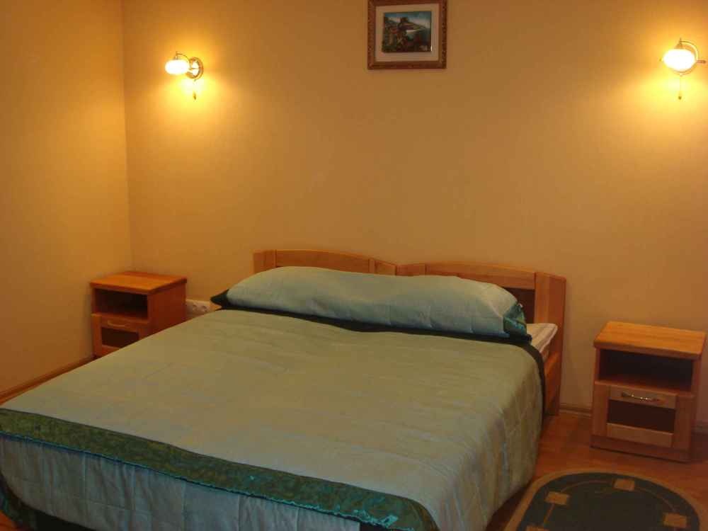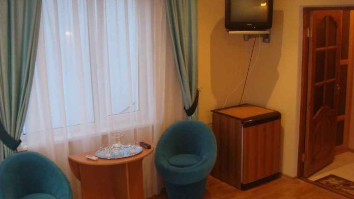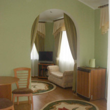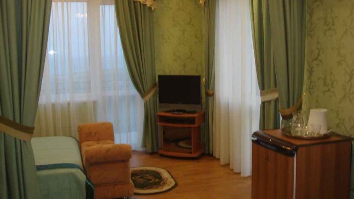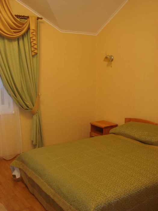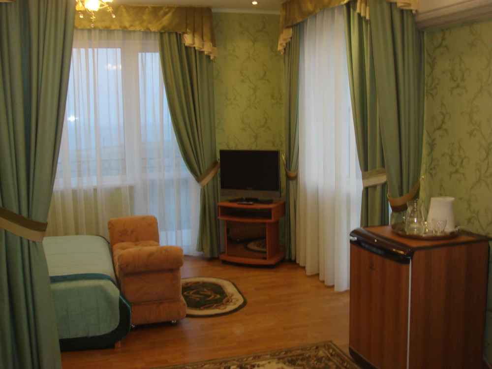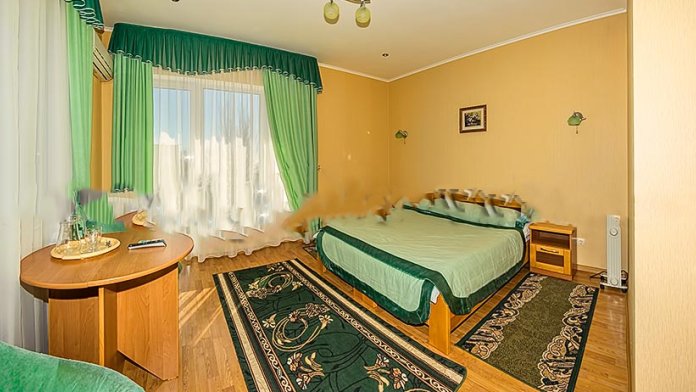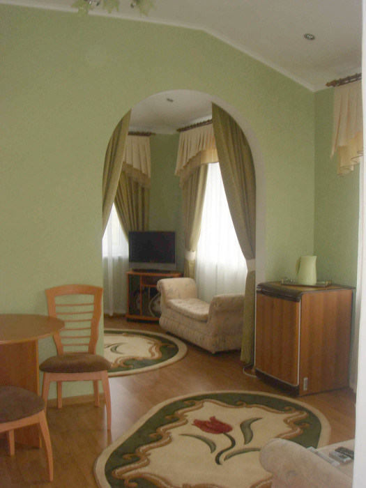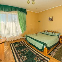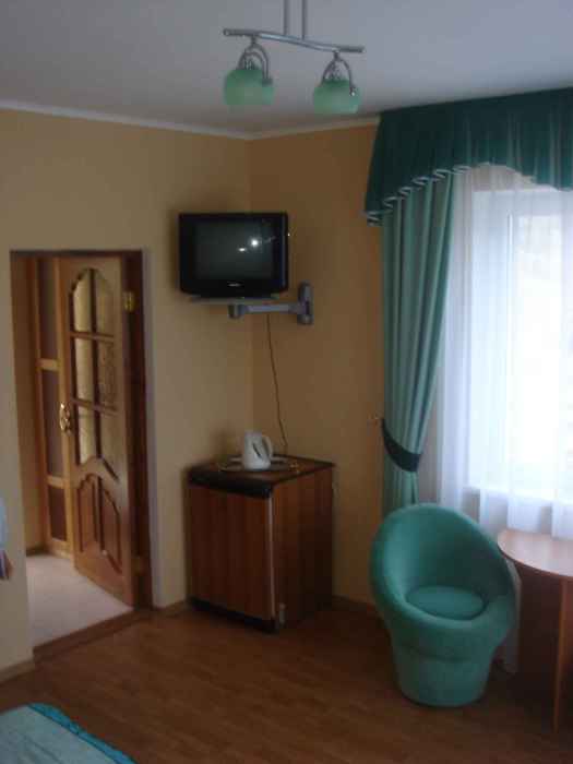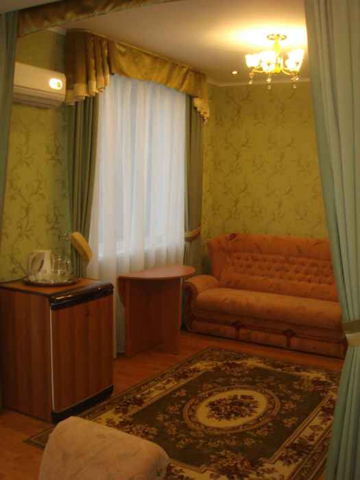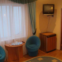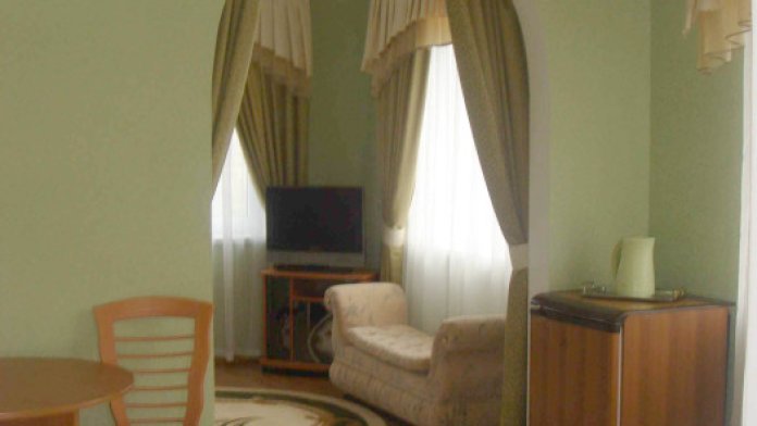В номере 2-х спальная кровать 160х200, диван, платяной шкаф, телефон, мини-бар, стол, посуда.