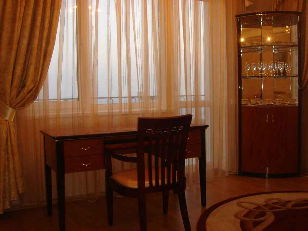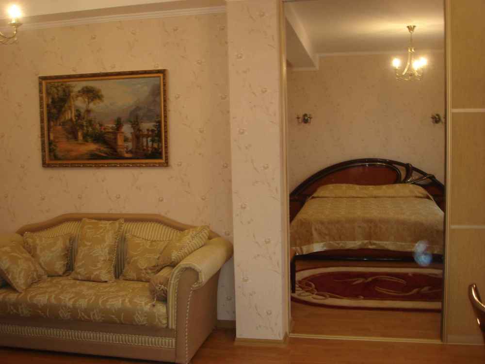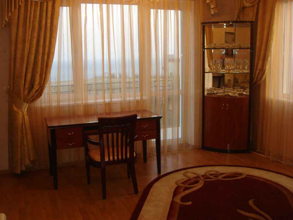 В номере 2-х спальная кровать 180х200,диван, рабочее место, платяной шкаф, туалетный столик, мини-бар, журнальный столик, барная стойка, посуда.