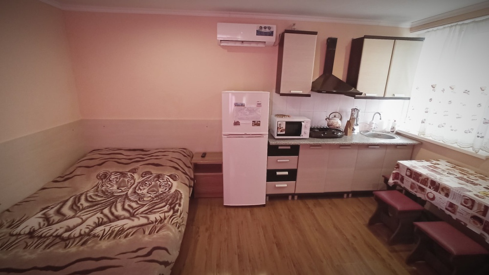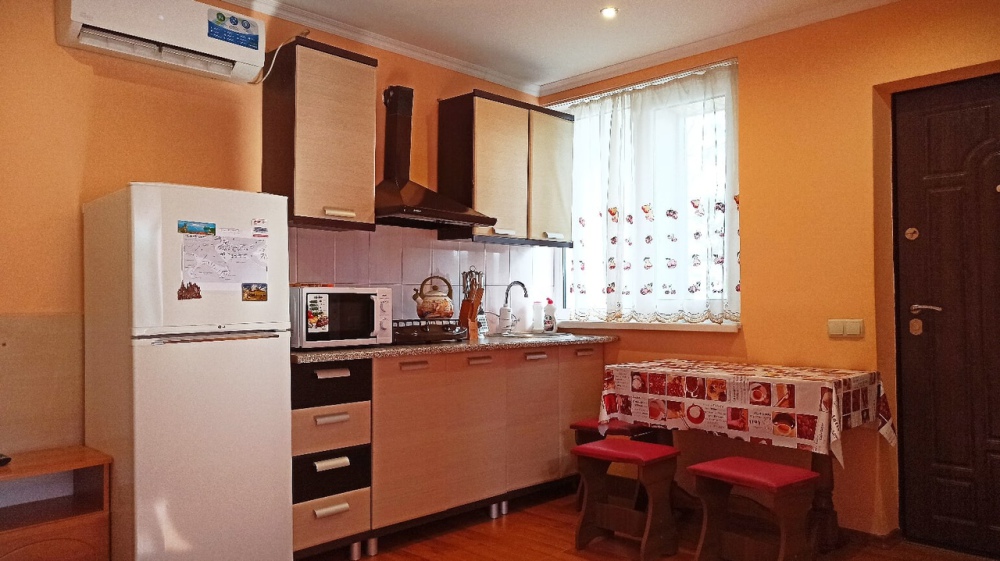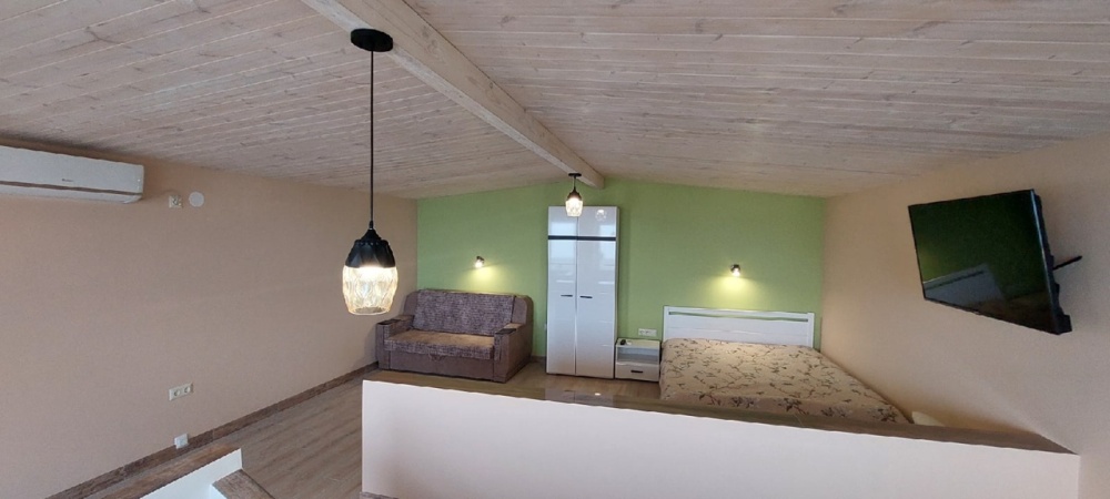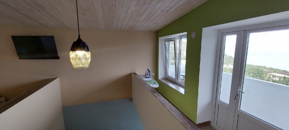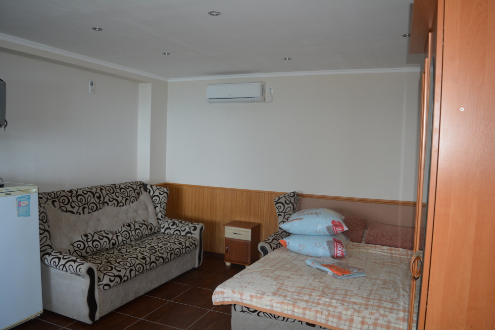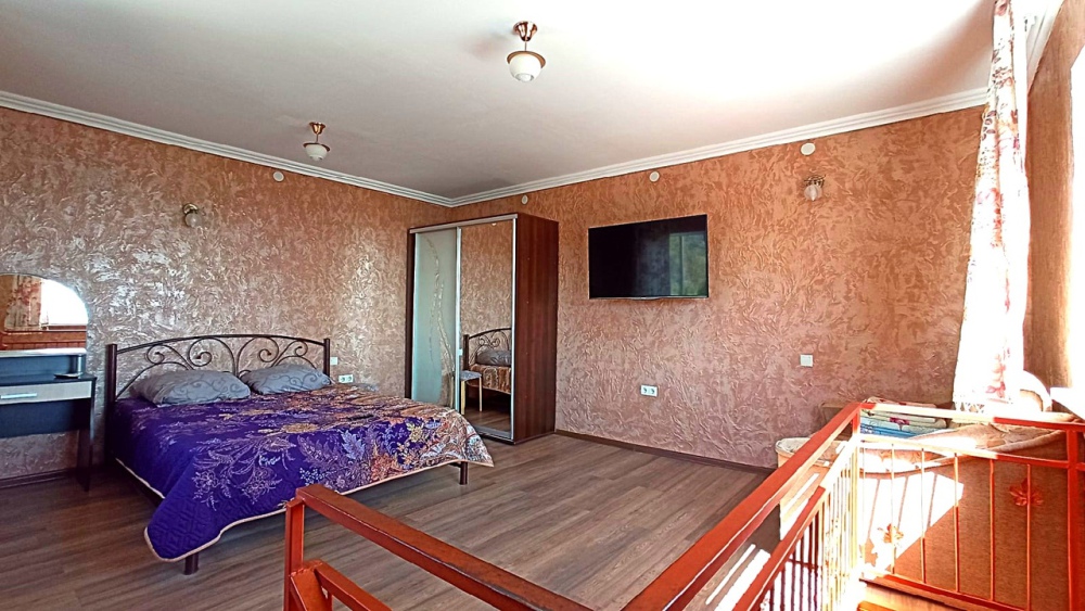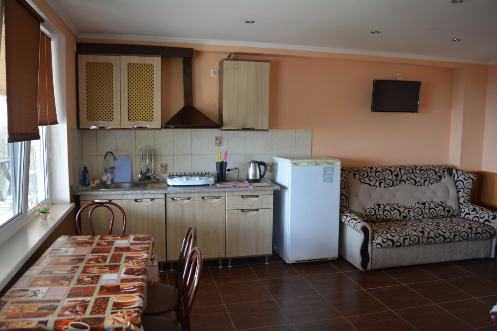 Двухэтажный номер с видом на море на 5 человека со всеми удобствами. 1 этаж: кухня, санузел. На кухне расположены: диван, кухонный столик, холодильник, прихожая. Большой дворик.