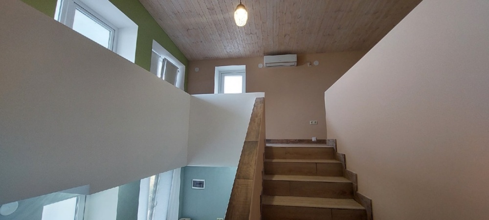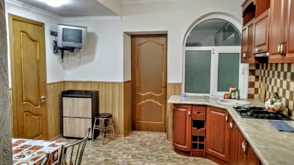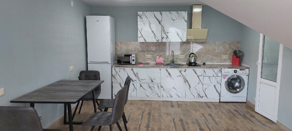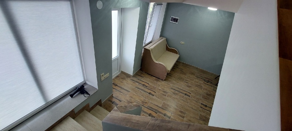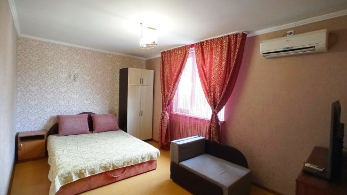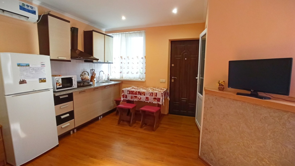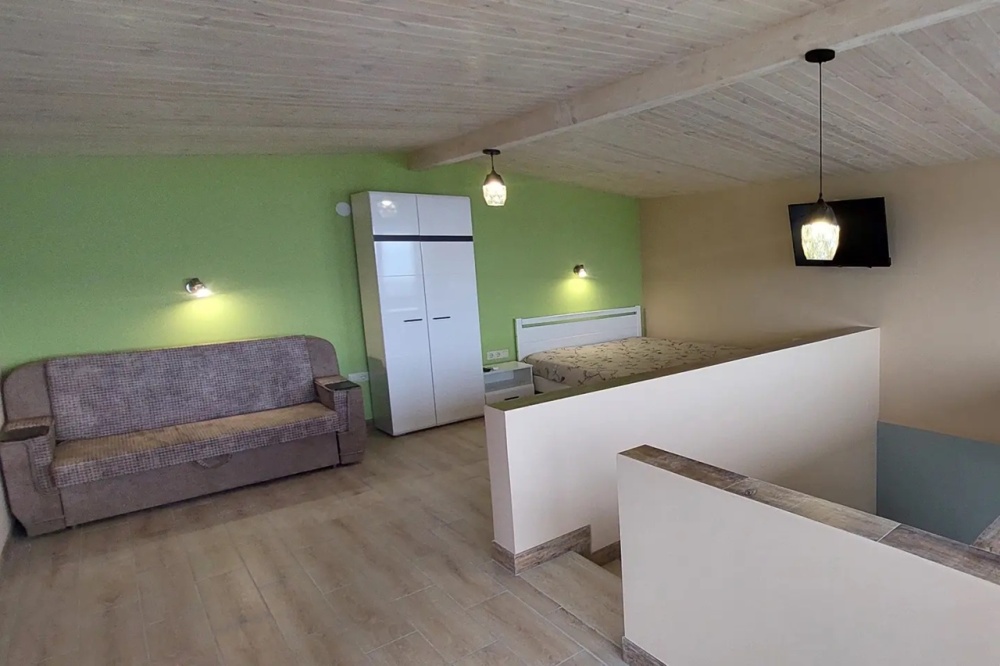 Двухэтажный номер с видом на море на 5 человека со всеми удобствами. 1 этаж: кухня, санузел. На кухне расположены: диван, кухонный столик, холодильник, прихожая. Большой дворик.