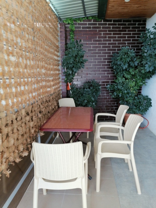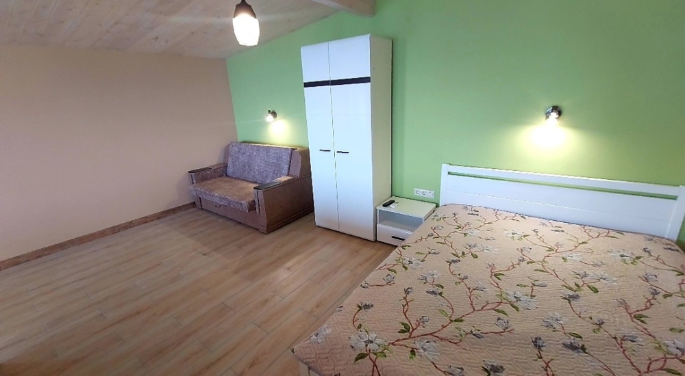 2 этаж: 2-спальная кровать-раздвижной диван, телевизор, большой шкаф-купе, кондиционер, туалетный столик, гладильная доска, утюг, фен. Выход на большую террасу с шезлонгами.