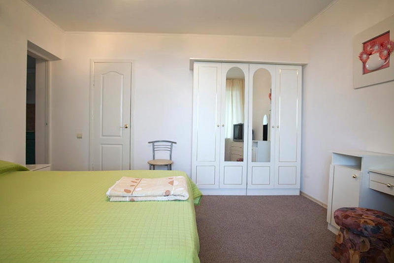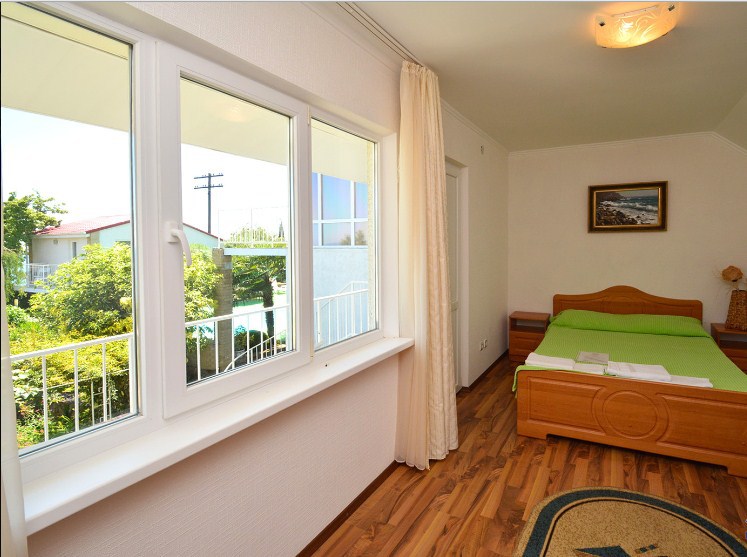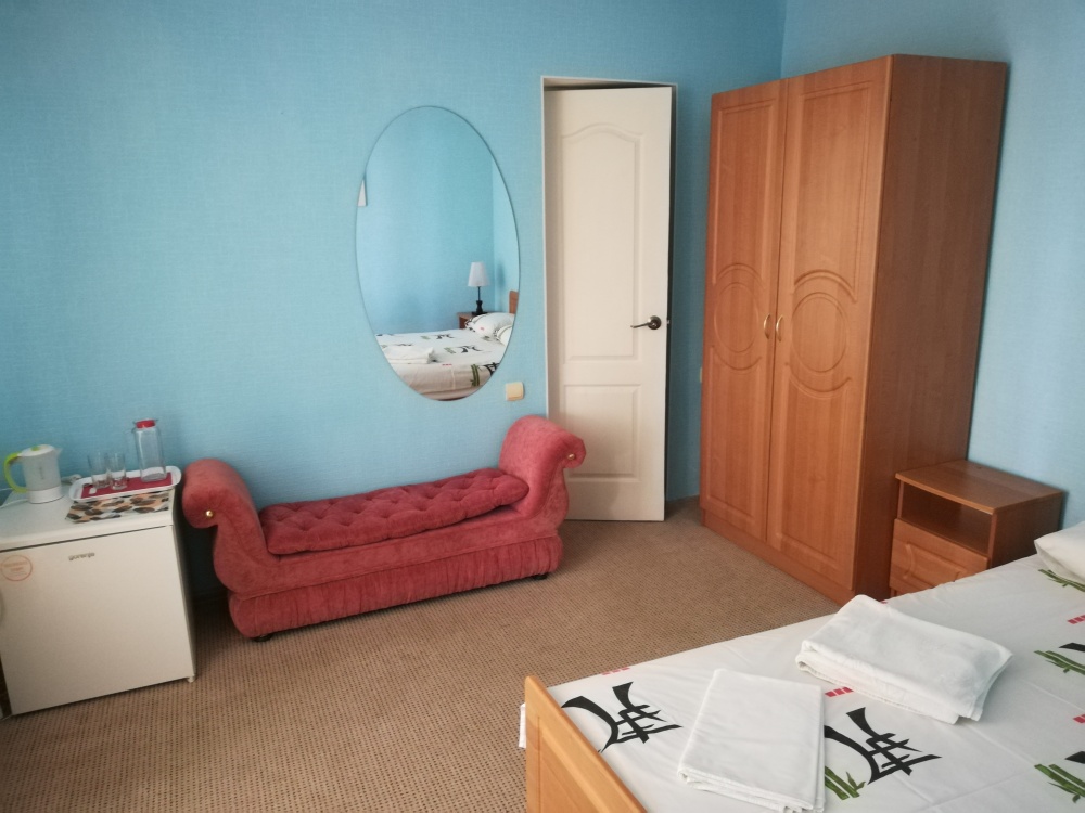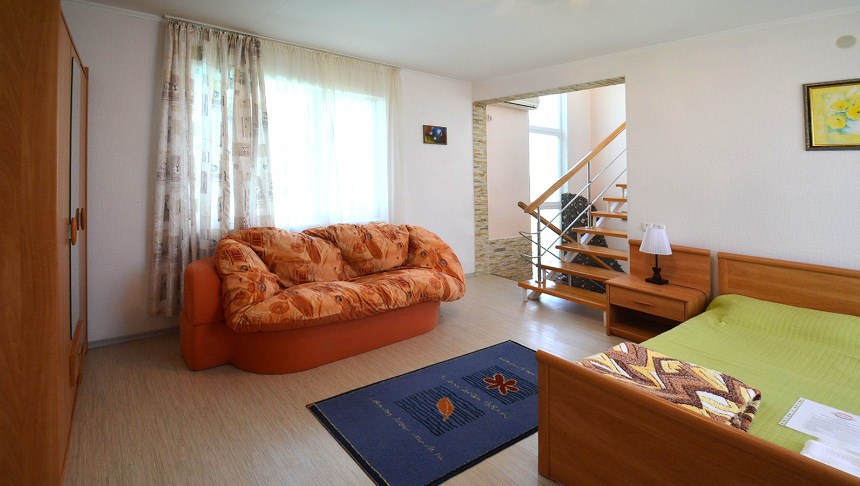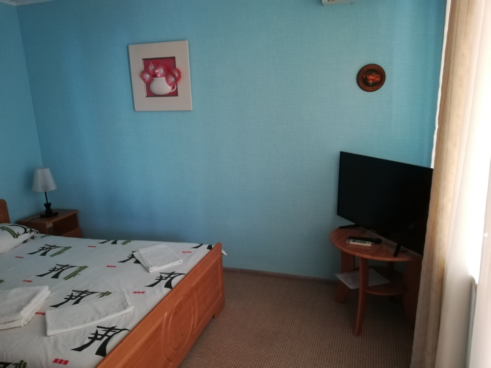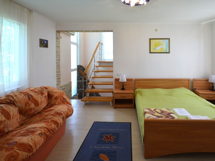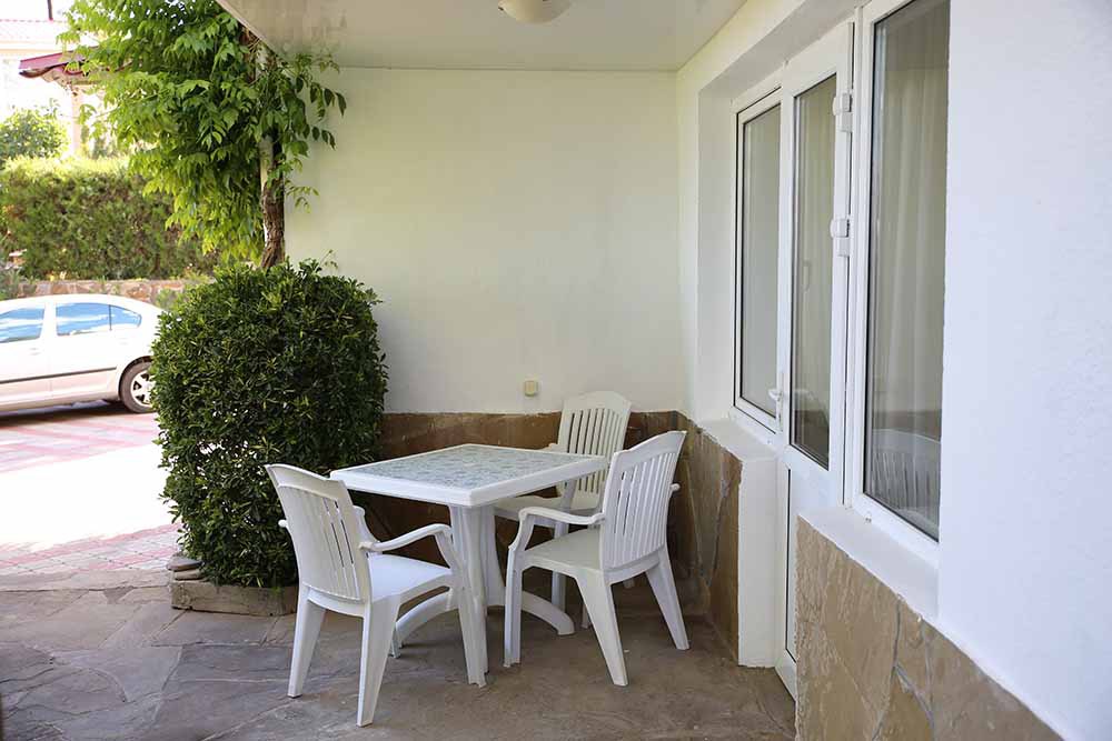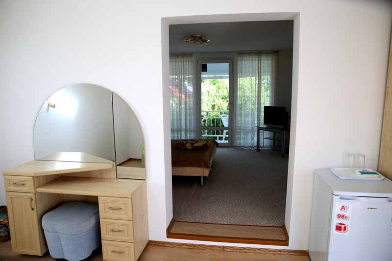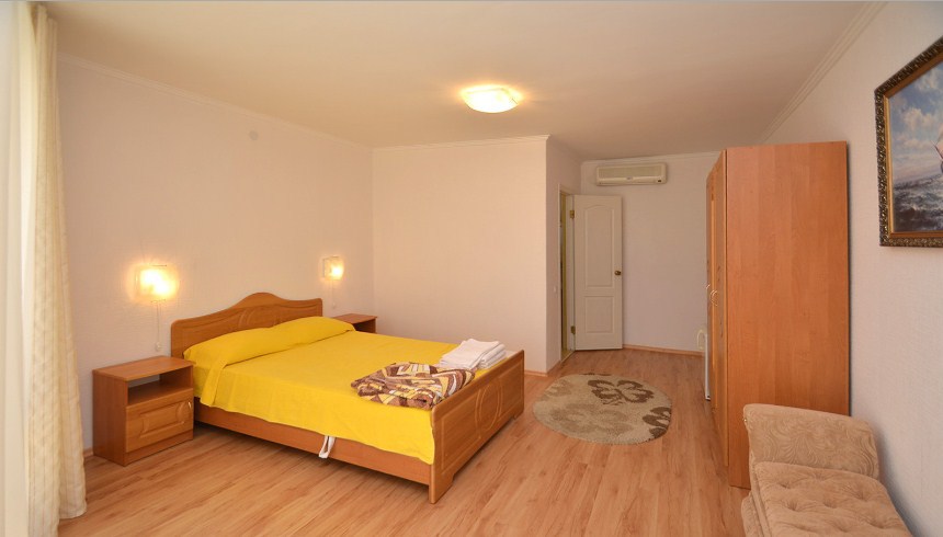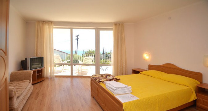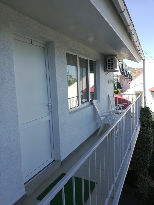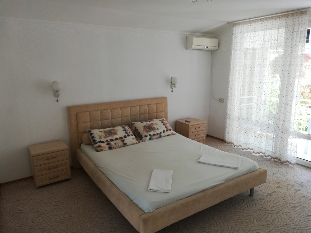 двухкомнатный, 4-местный номер, общая площадь – 44 м.кв.) - Спальня-гостиная (двуспальная кровать, диван, кабельное ТВ, кондиционер), детская комната (2 односпальные кровати), холл (холодильник), санузел (душ, унитаз, умывальник, фен, количество полотенец – 2 на 1 человека). Балкон с видом на море. Летний дворик для отдыха.