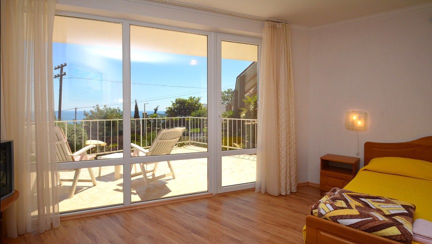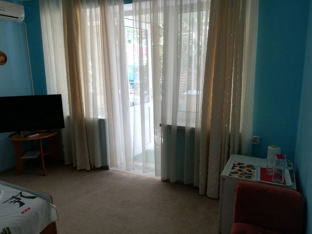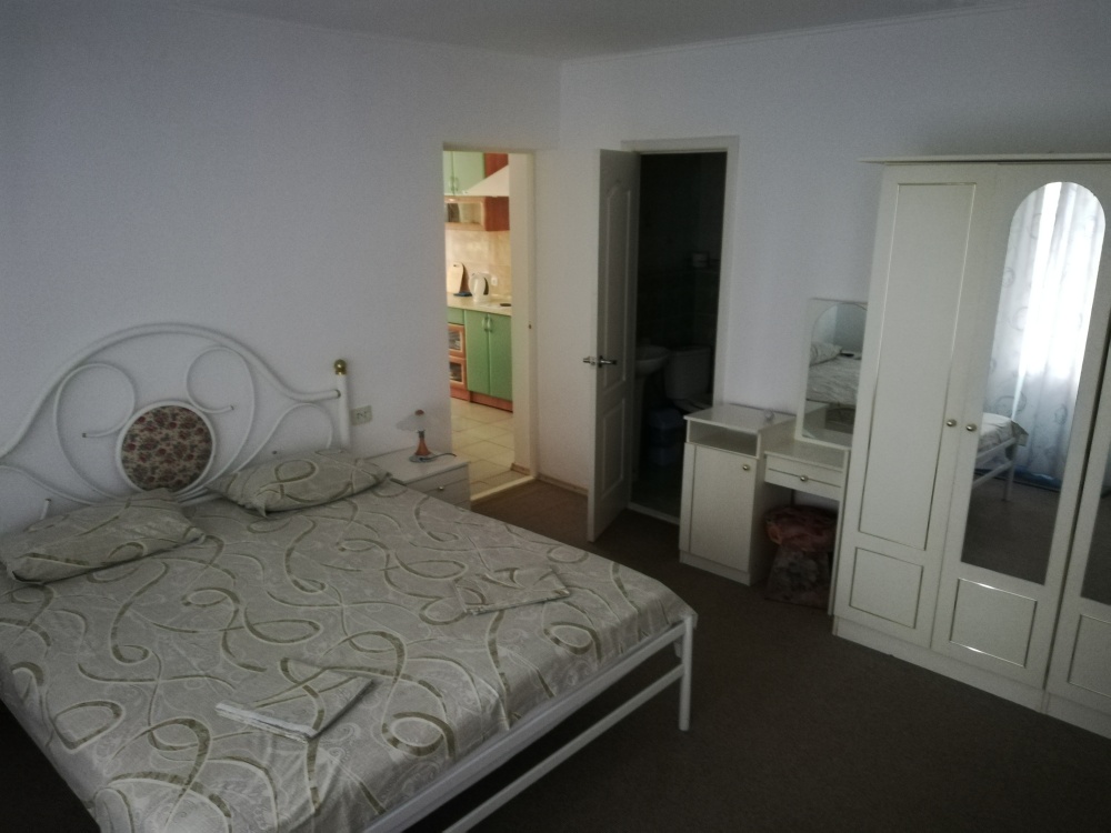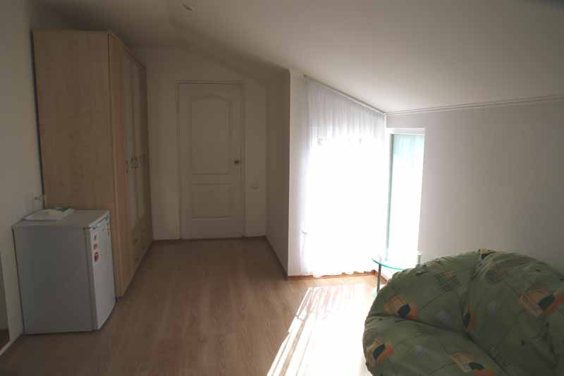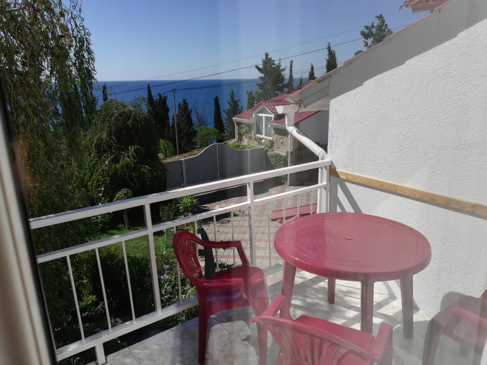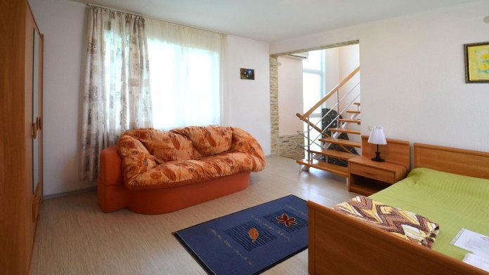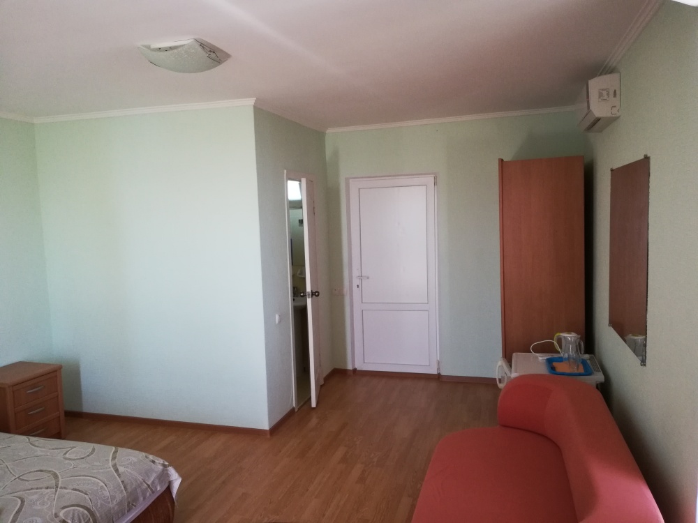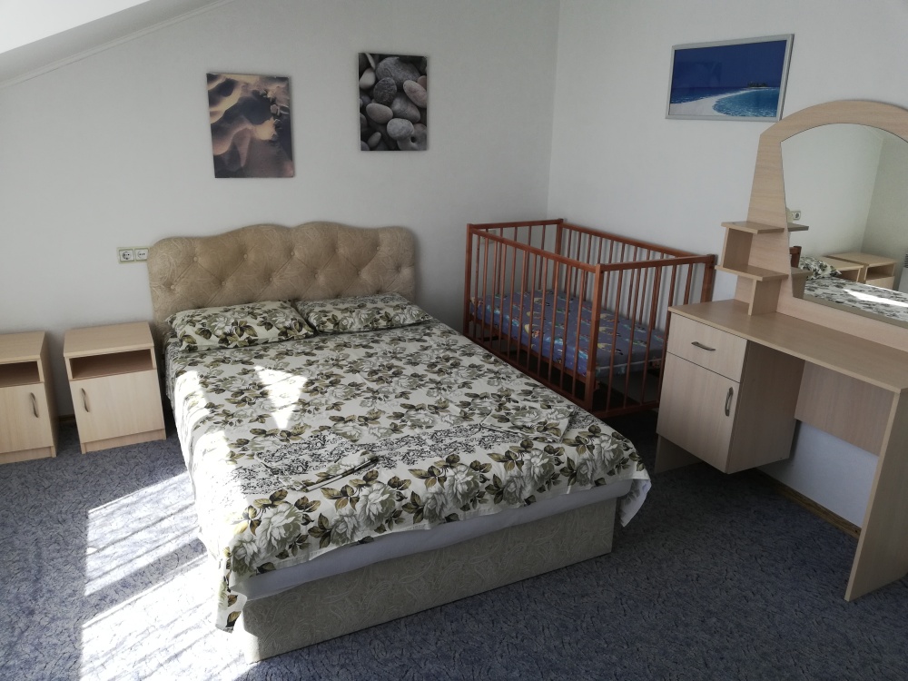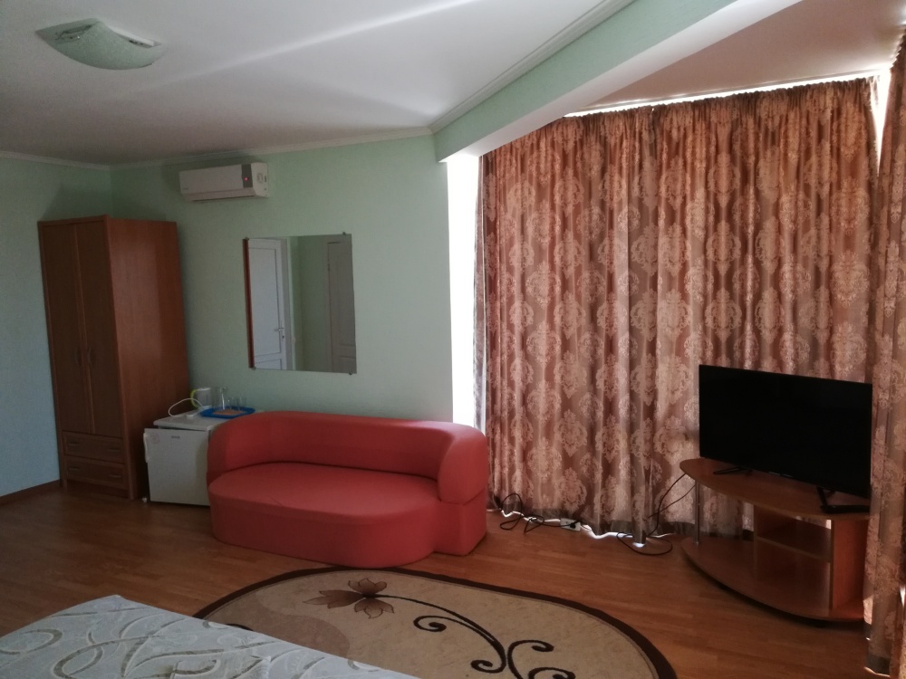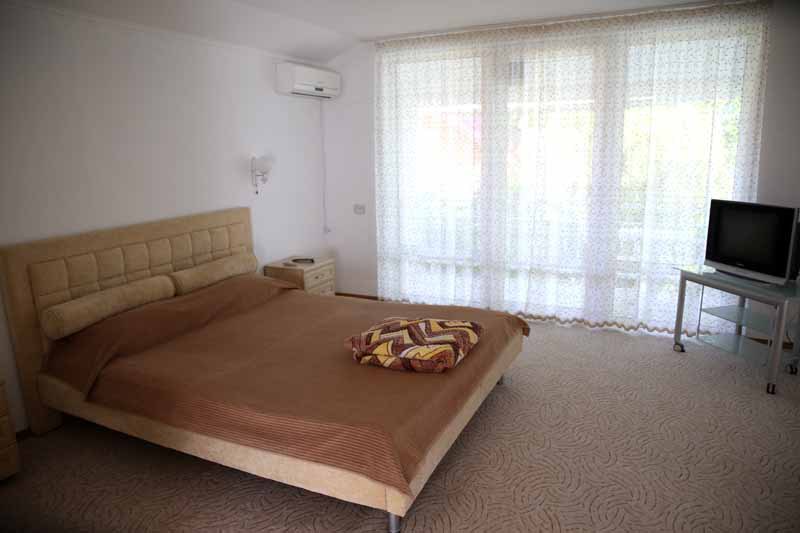двухкомнатный, 4-местный номер, общая площадь – 44 м.кв.) - Спальня-гостиная (двуспальная кровать, диван, кабельное ТВ, кондиционер), детская комната (2 односпальные кровати), холл (холодильник), санузел (душ, унитаз, умывальник, фен, количество полотенец – 2 на 1 человека). Балкон с видом на море. Летний дворик для отдыха.