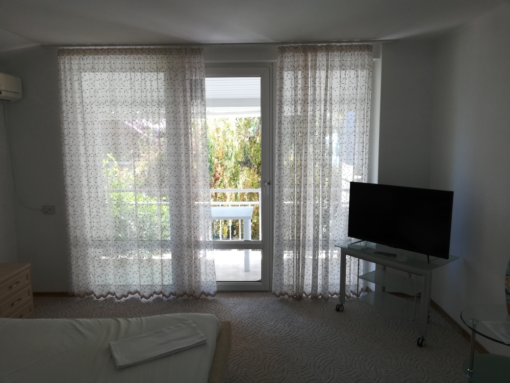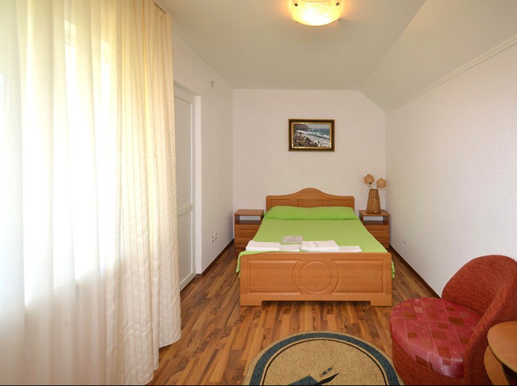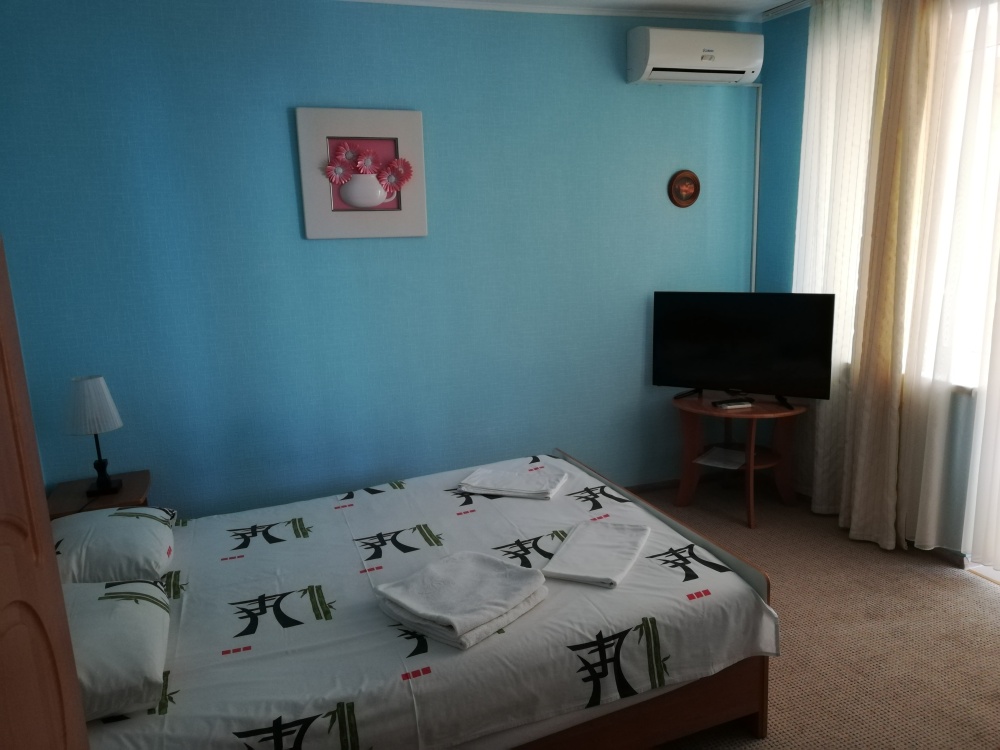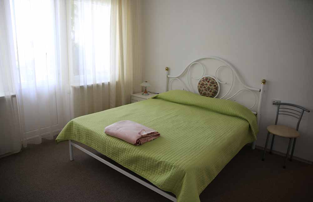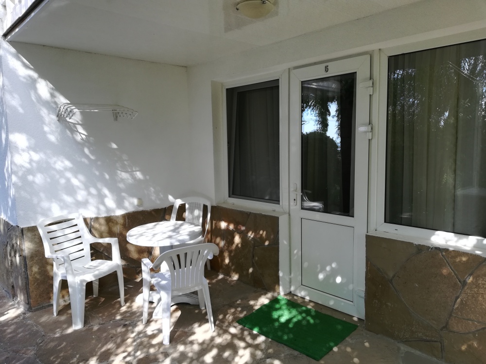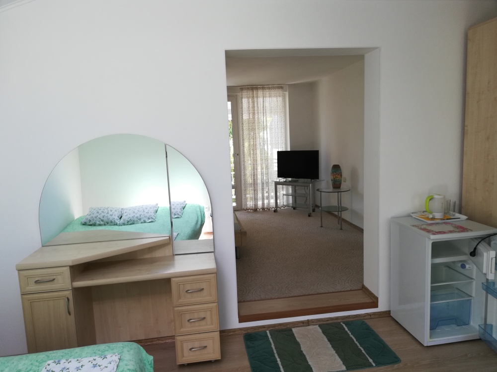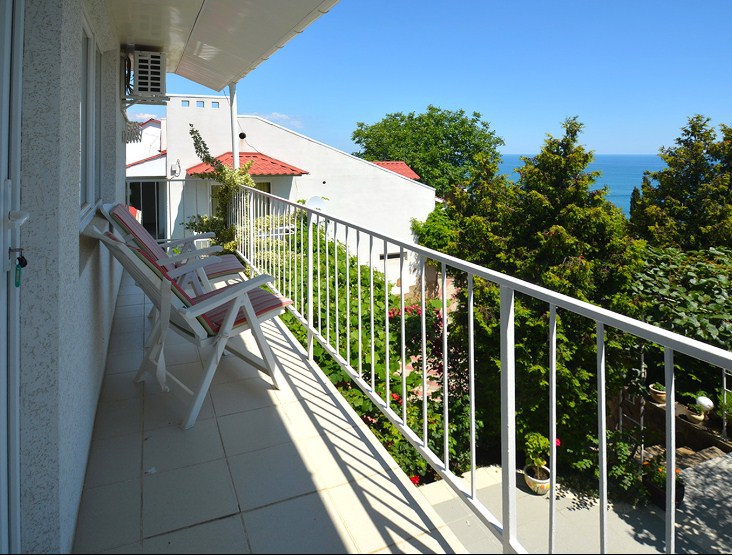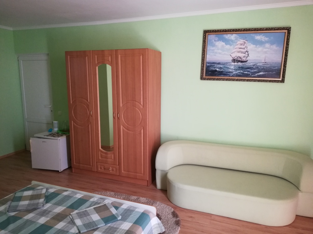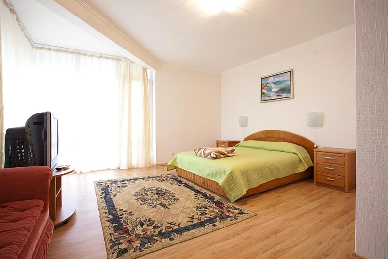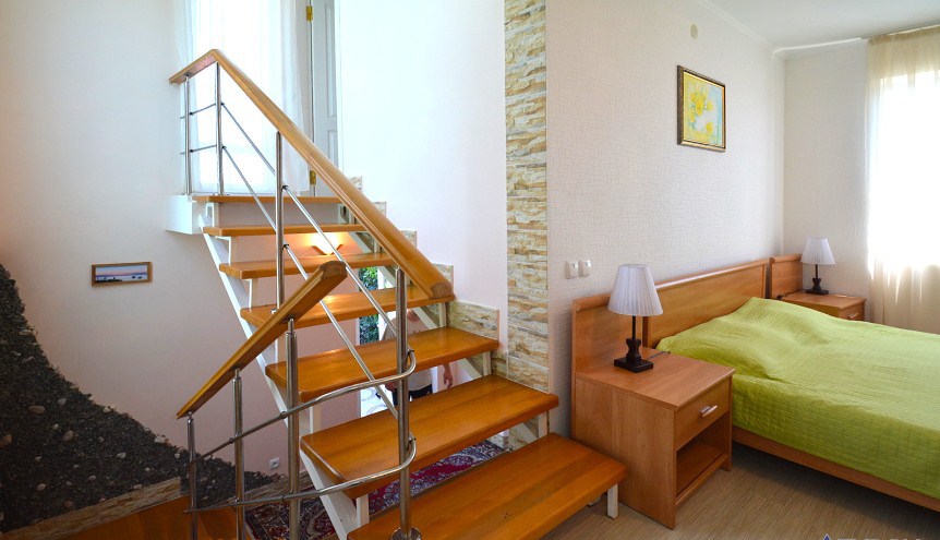 двухкомнатный, 4-местный номер, общая площадь – 44 м.кв.) - Спальня-гостиная (двуспальная кровать, диван, кабельное ТВ, кондиционер), детская комната (2 односпальные кровати), холл (холодильник), санузел (душ, унитаз, умывальник, фен, количество полотенец – 2 на 1 человека). Балкон с видом на море. Летний дворик для отдыха.