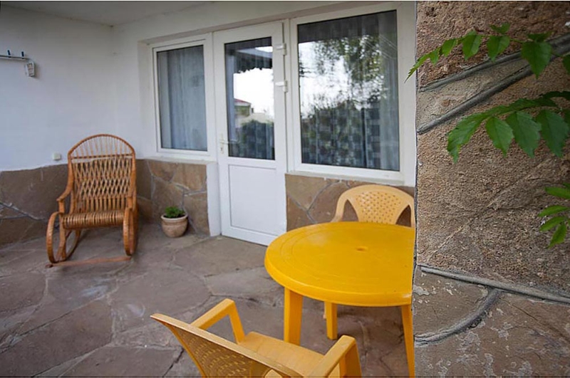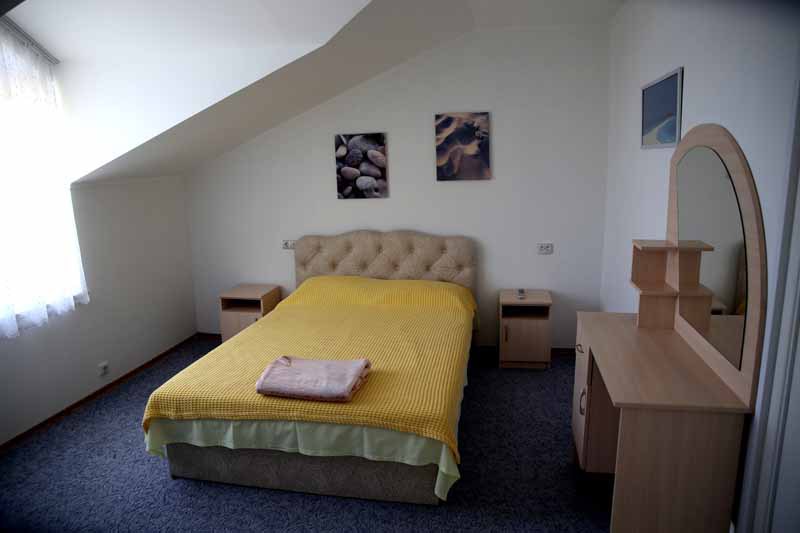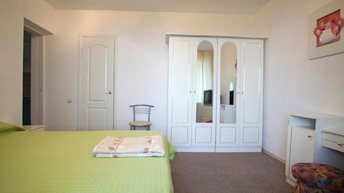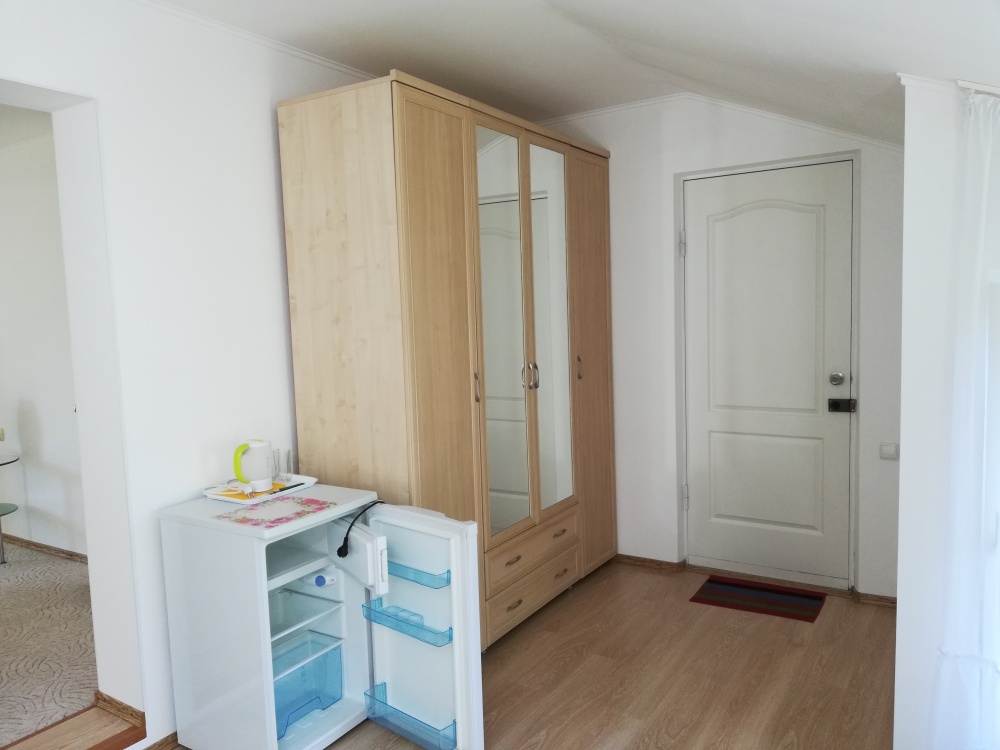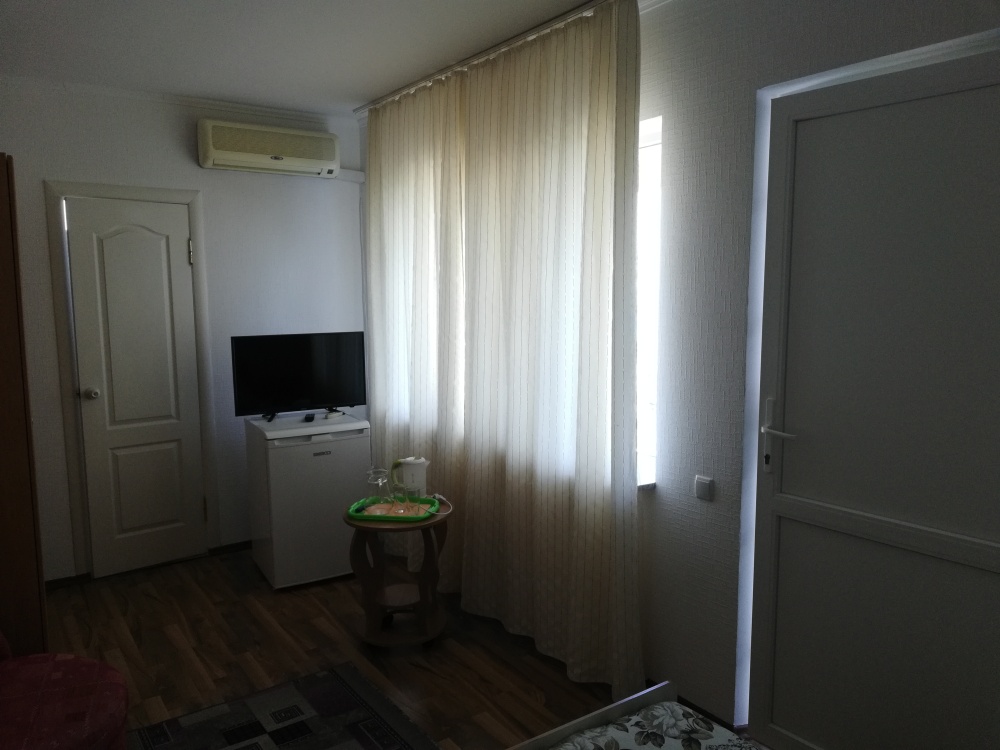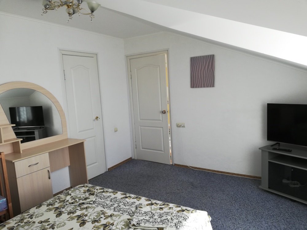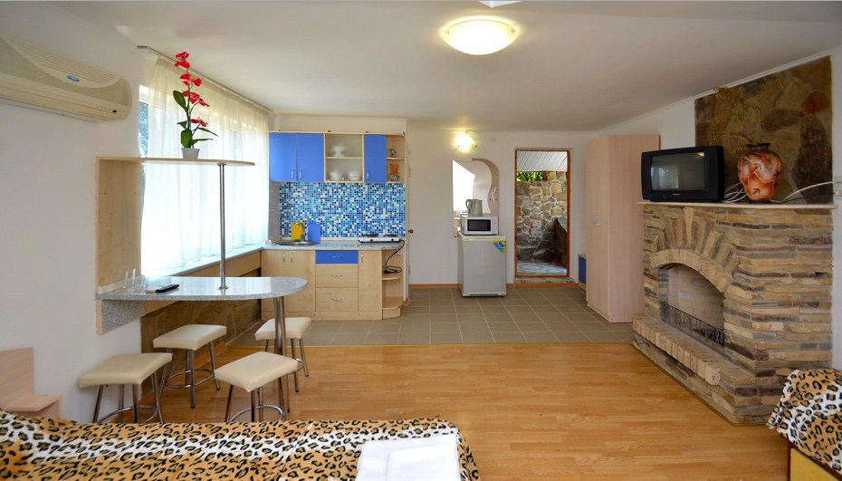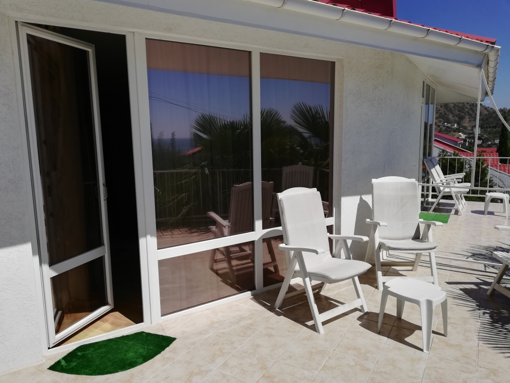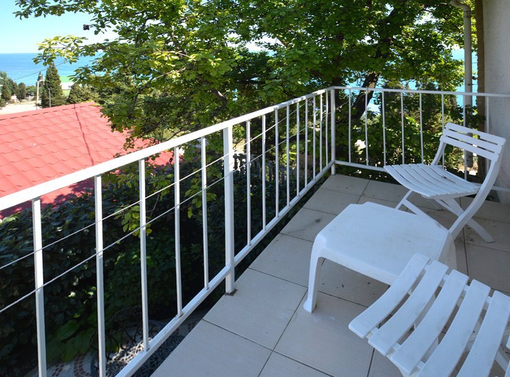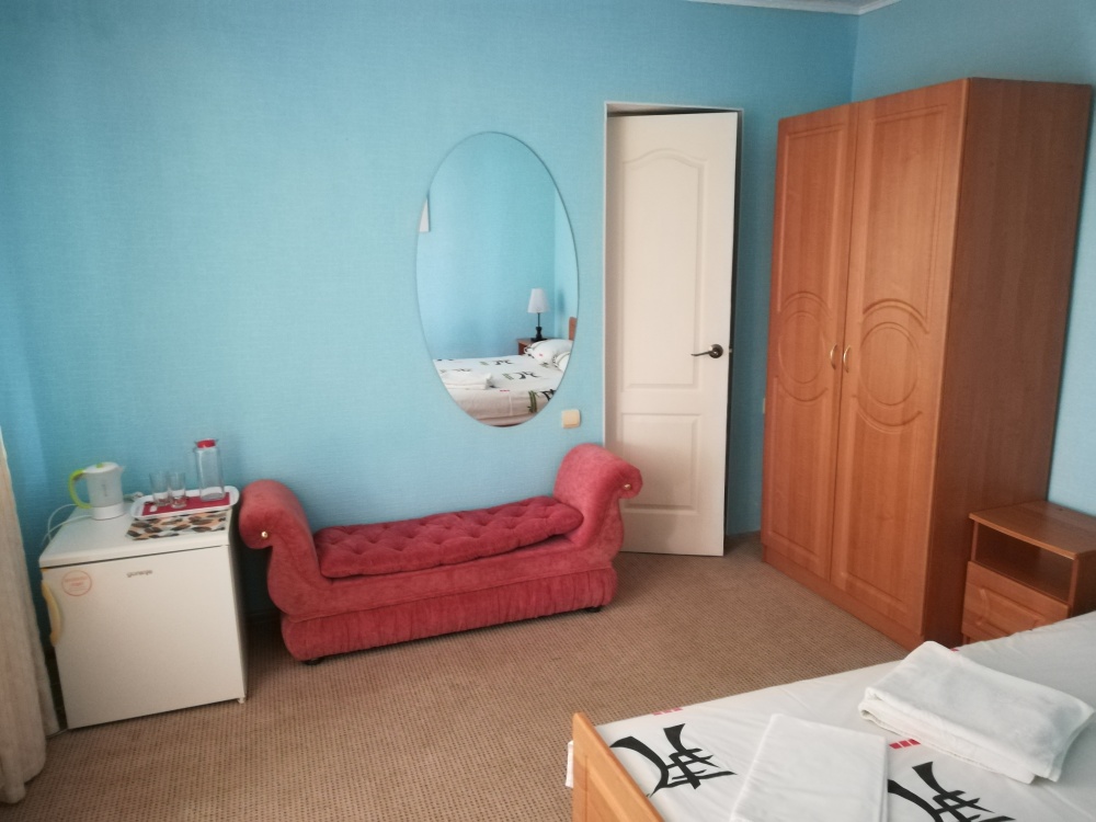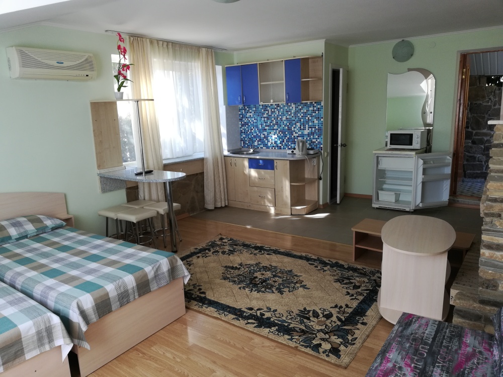 двухкомнатный, 4-местный номер, общая площадь – 44 м.кв.) - Спальня-гостиная (двуспальная кровать, диван, кабельное ТВ, кондиционер), детская комната (2 односпальные кровати), холл (холодильник), санузел (душ, унитаз, умывальник, фен, количество полотенец – 2 на 1 человека). Балкон с видом на море. Летний дворик для отдыха.