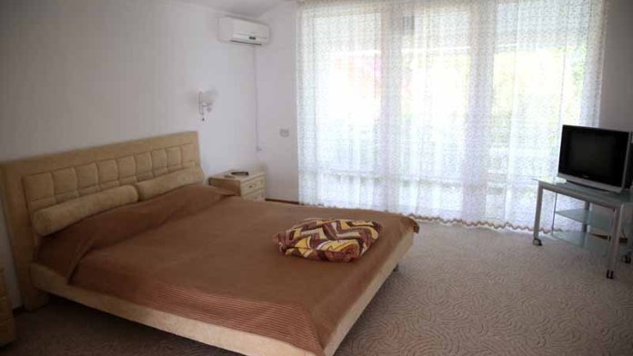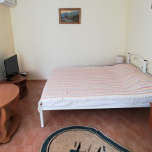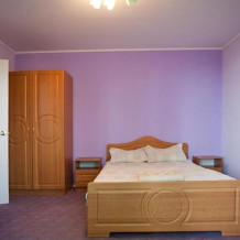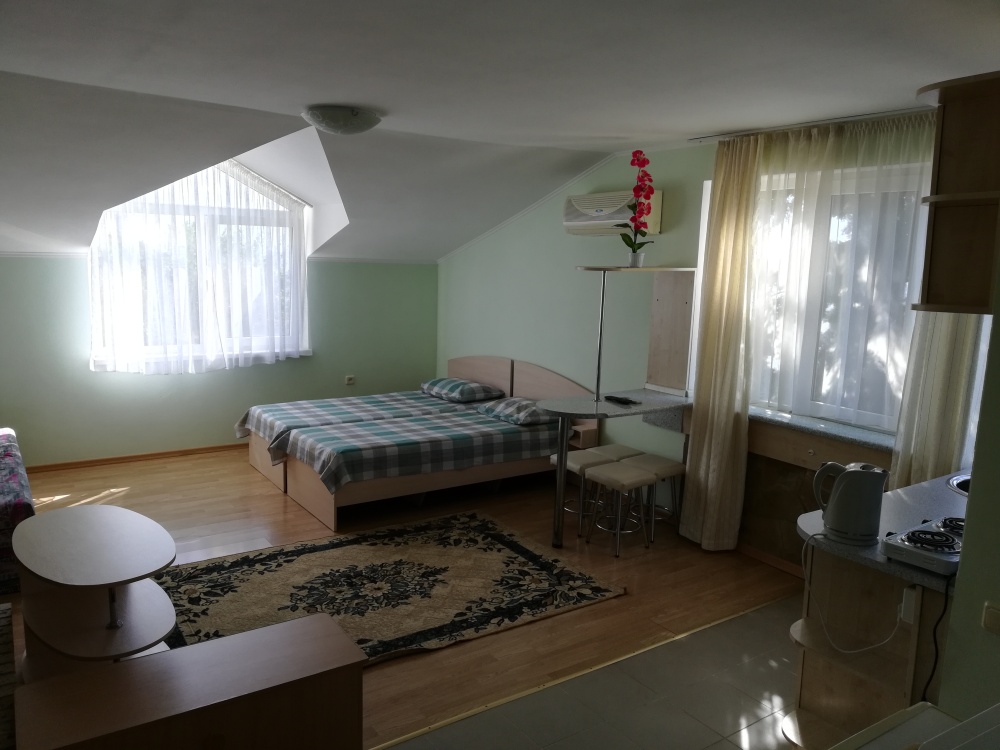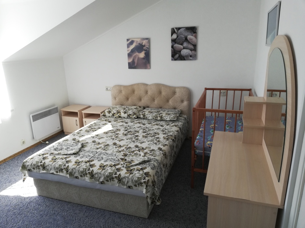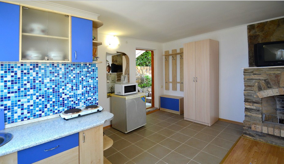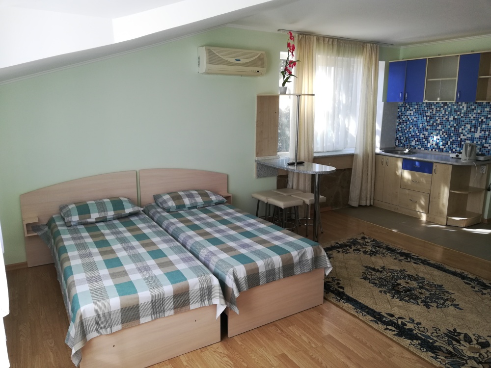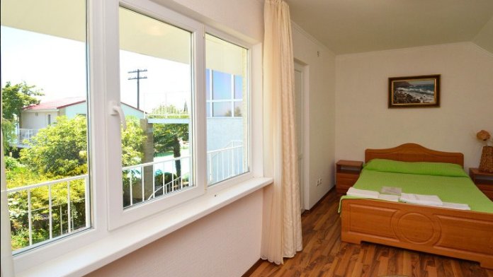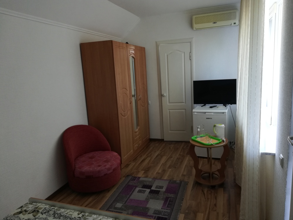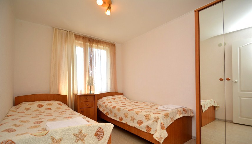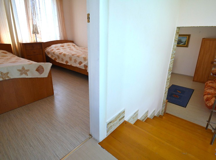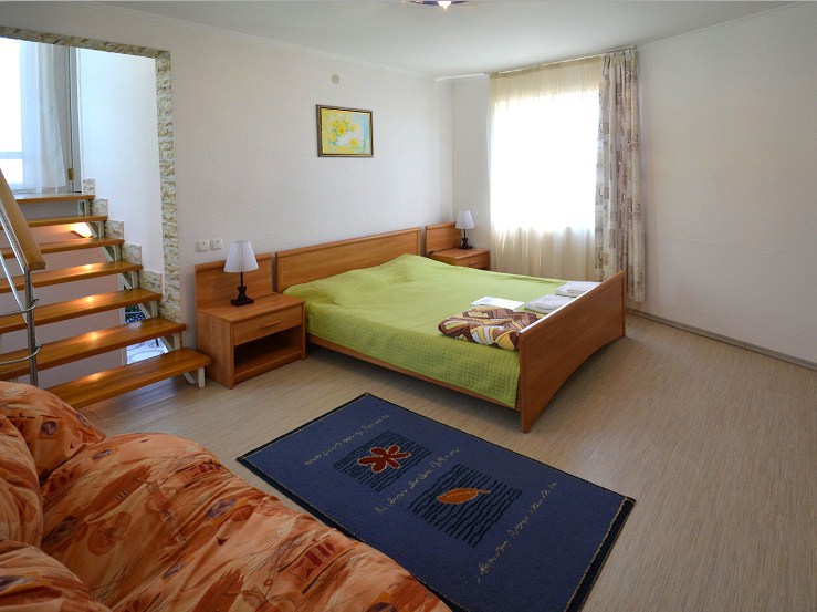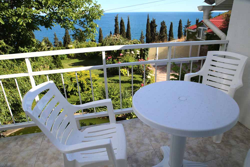 двухкомнатный, 4-местный номер, общая площадь – 44 м.кв.) - Спальня-гостиная (двуспальная кровать, диван, кабельное ТВ, кондиционер), детская комната (2 односпальные кровати), холл (холодильник), санузел (душ, унитаз, умывальник, фен, количество полотенец – 2 на 1 человека). Балкон с видом на море. Летний дворик для отдыха.