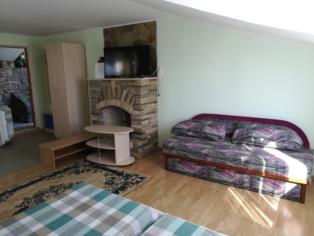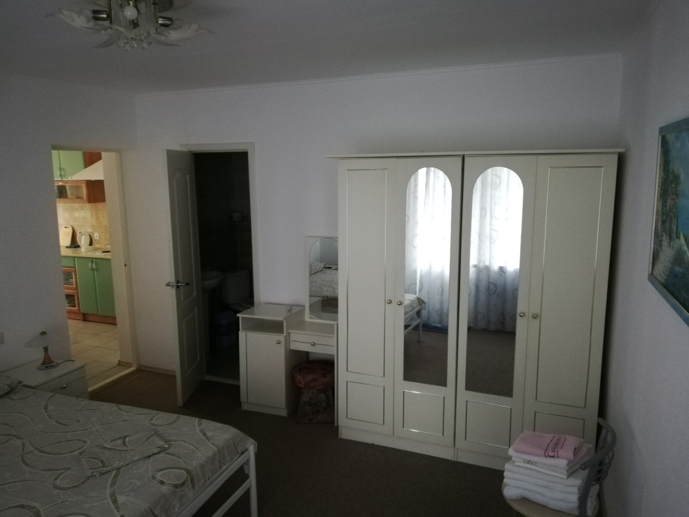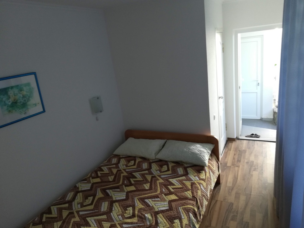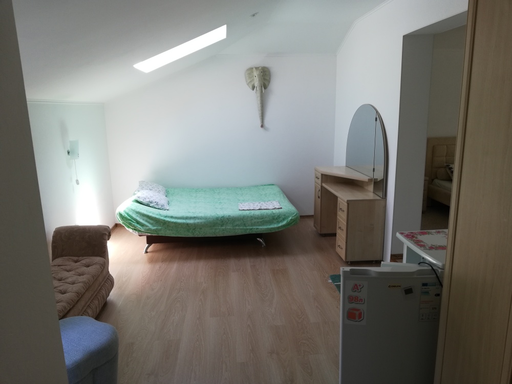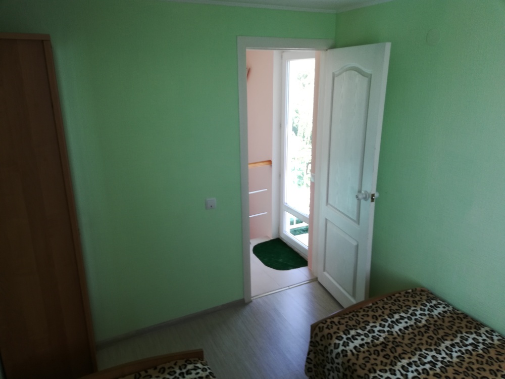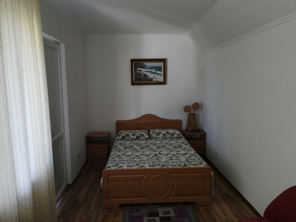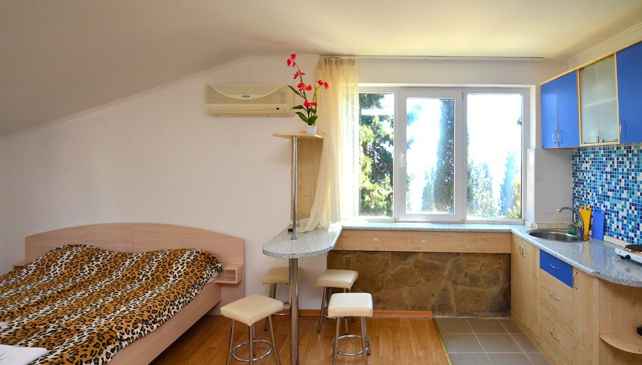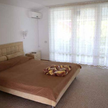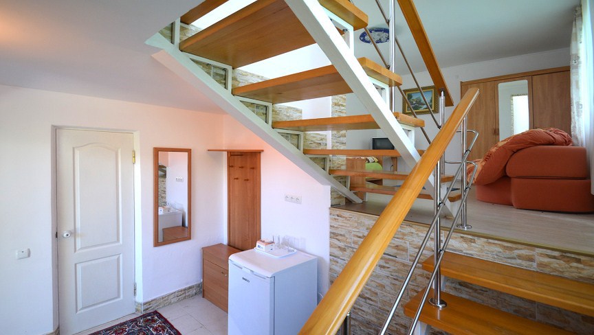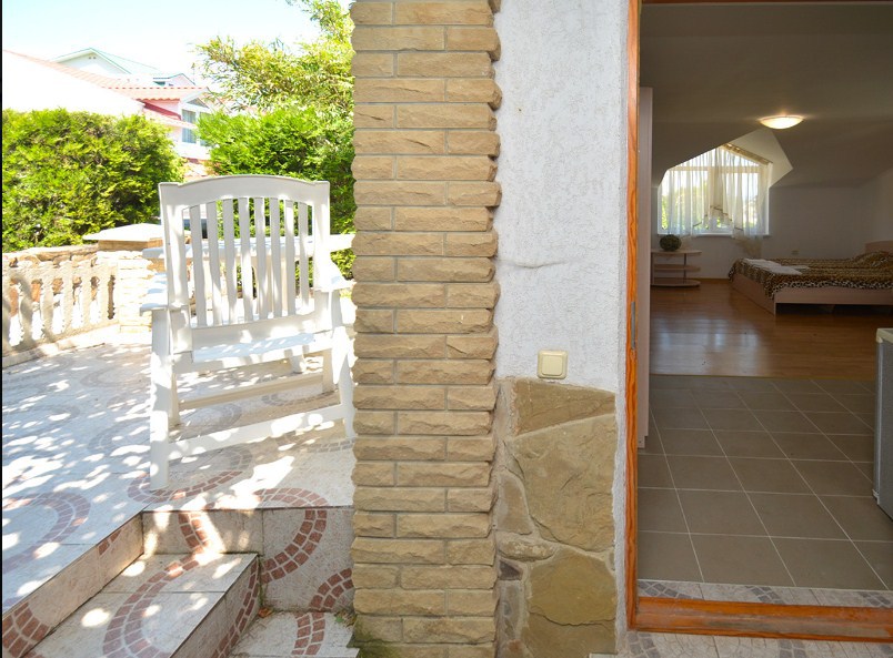 двухкомнатный, 4-местный номер, общая площадь – 44 м.кв.) - Спальня-гостиная (двуспальная кровать, диван, кабельное ТВ, кондиционер), детская комната (2 односпальные кровати), холл (холодильник), санузел (душ, унитаз, умывальник, фен, количество полотенец – 2 на 1 человека). Балкон с видом на море. Летний дворик для отдыха.