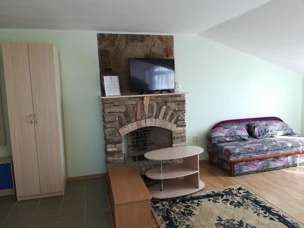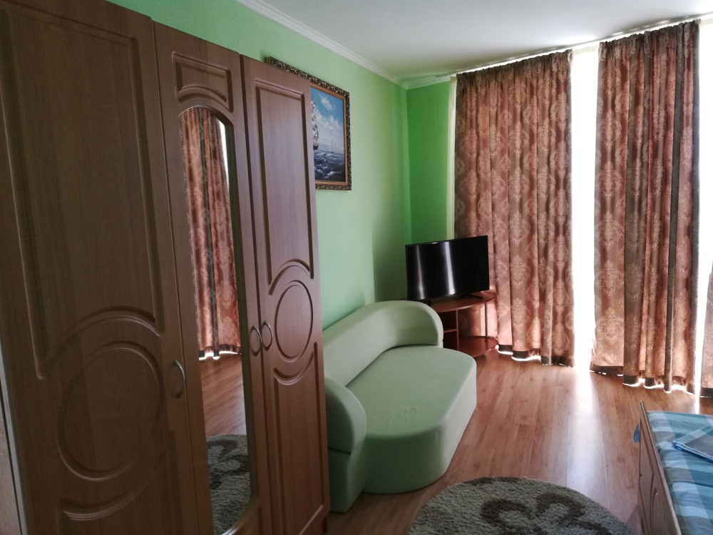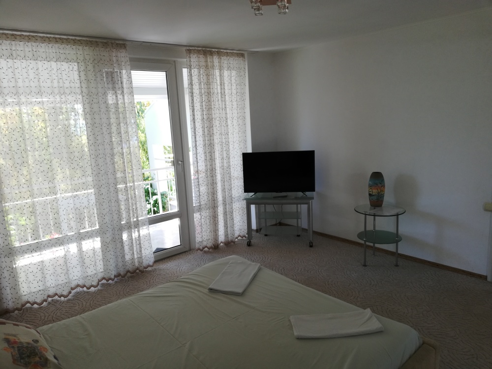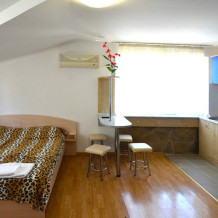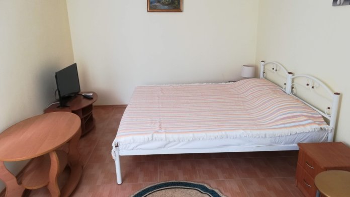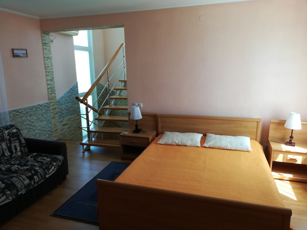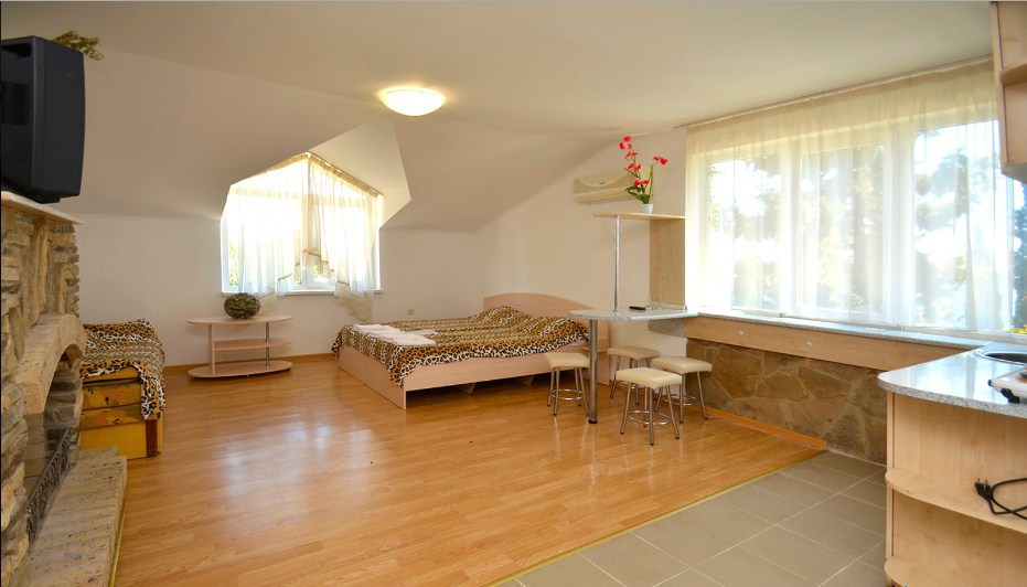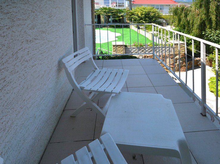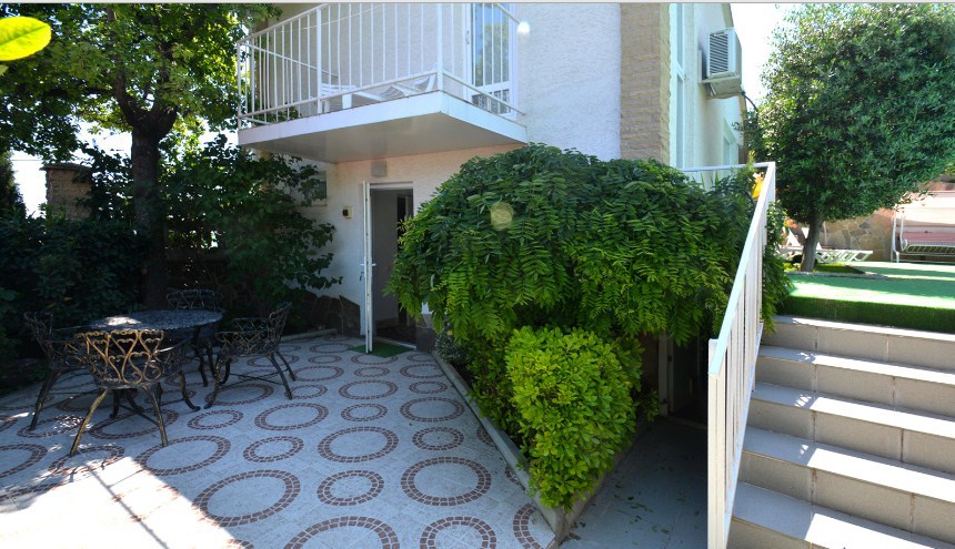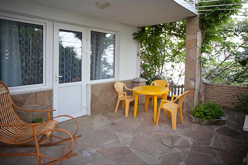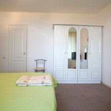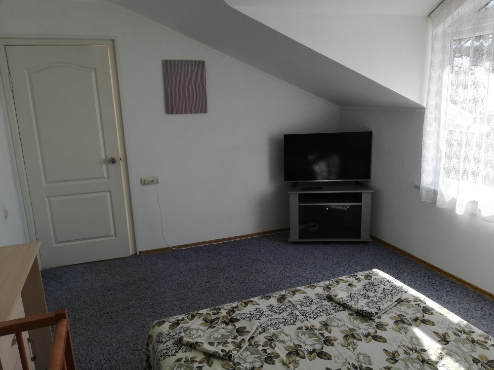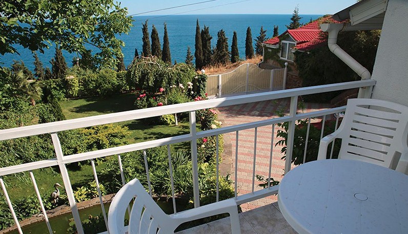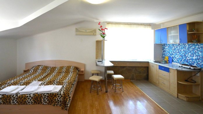 двухкомнатный, 4-местный номер, общая площадь – 44 м.кв.) - Спальня-гостиная (двуспальная кровать, диван, кабельное ТВ, кондиционер), детская комната (2 односпальные кровати), холл (холодильник), санузел (душ, унитаз, умывальник, фен, количество полотенец – 2 на 1 человека). Балкон с видом на море. Летний дворик для отдыха.