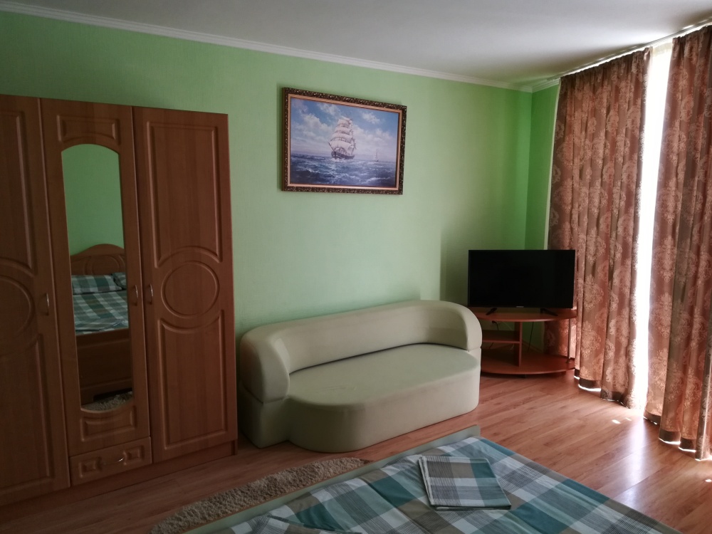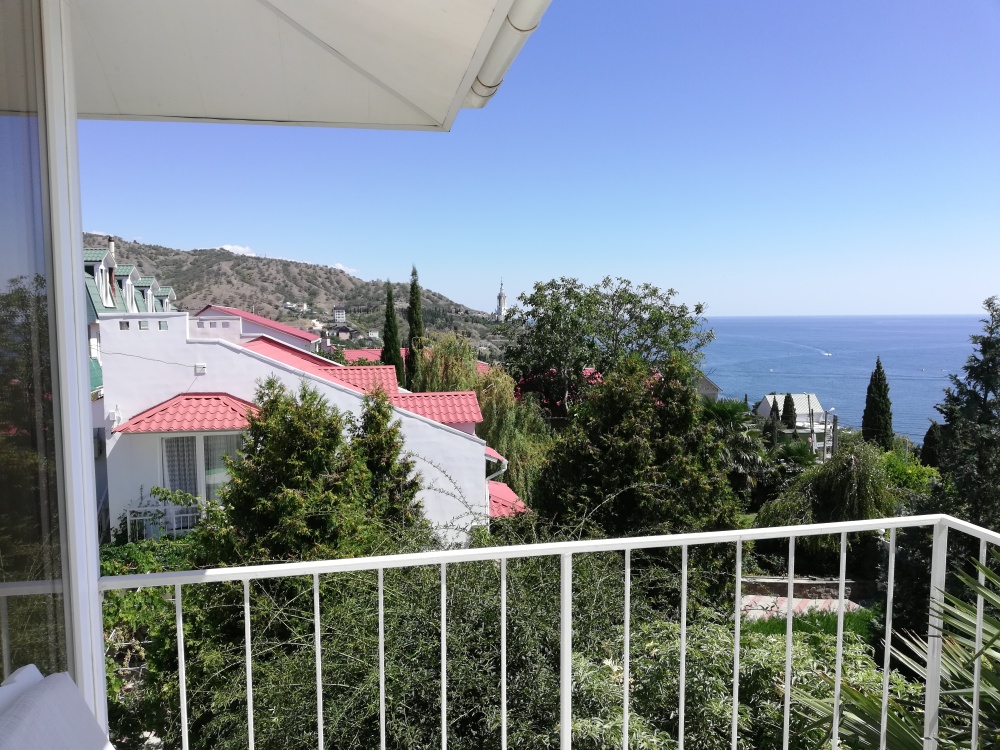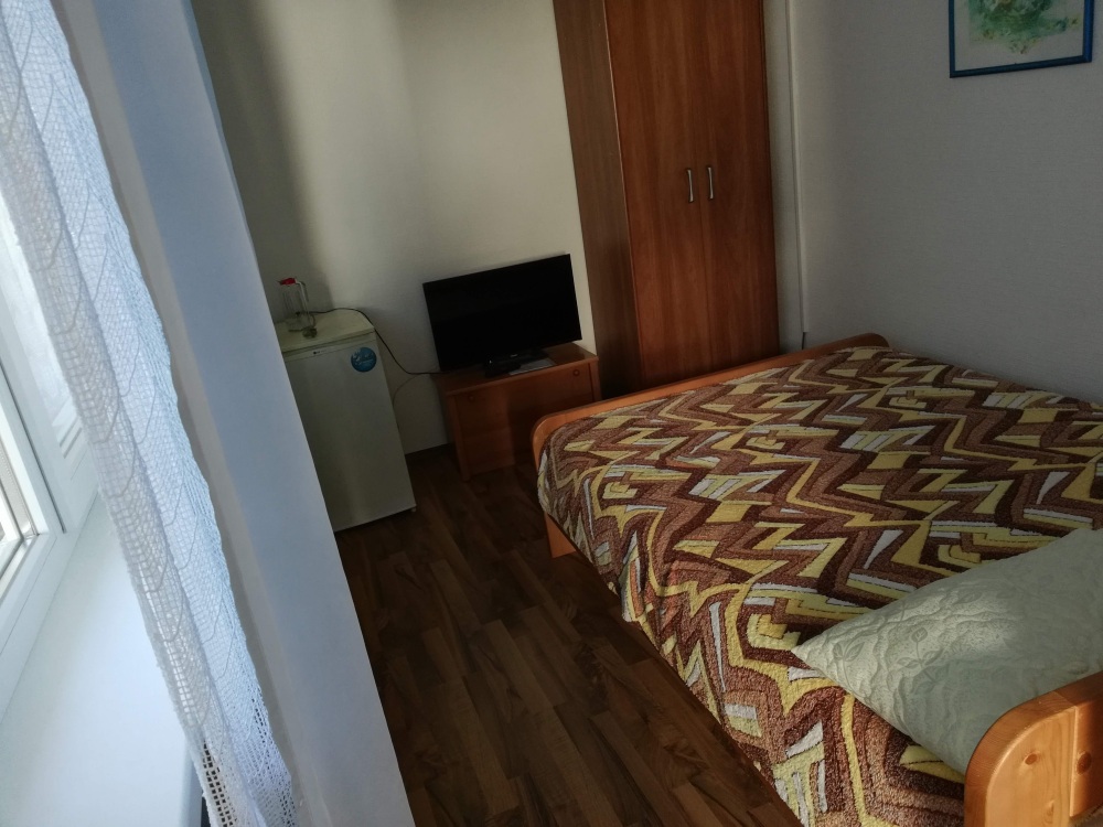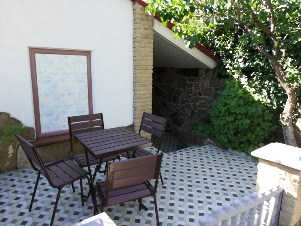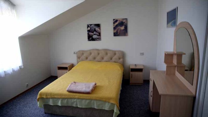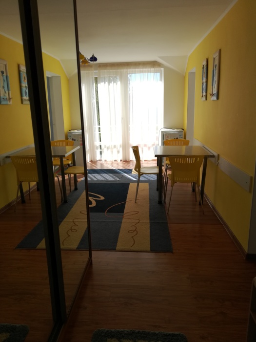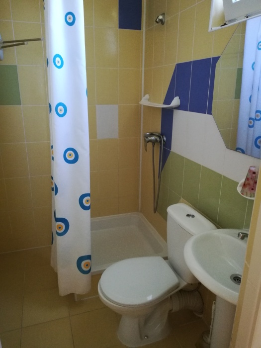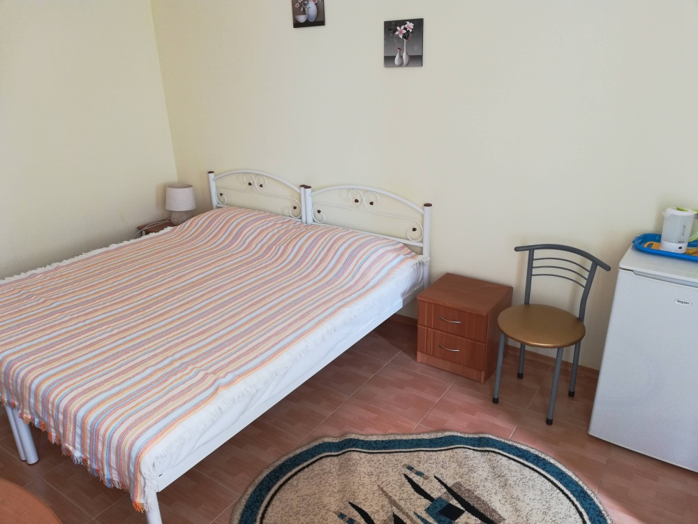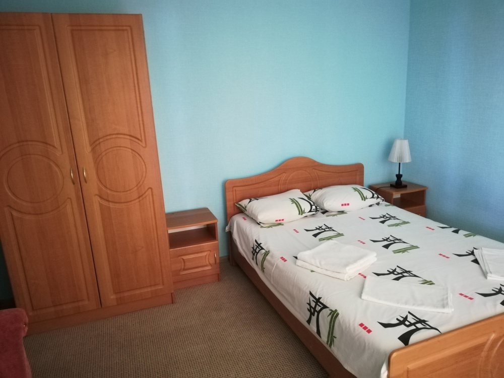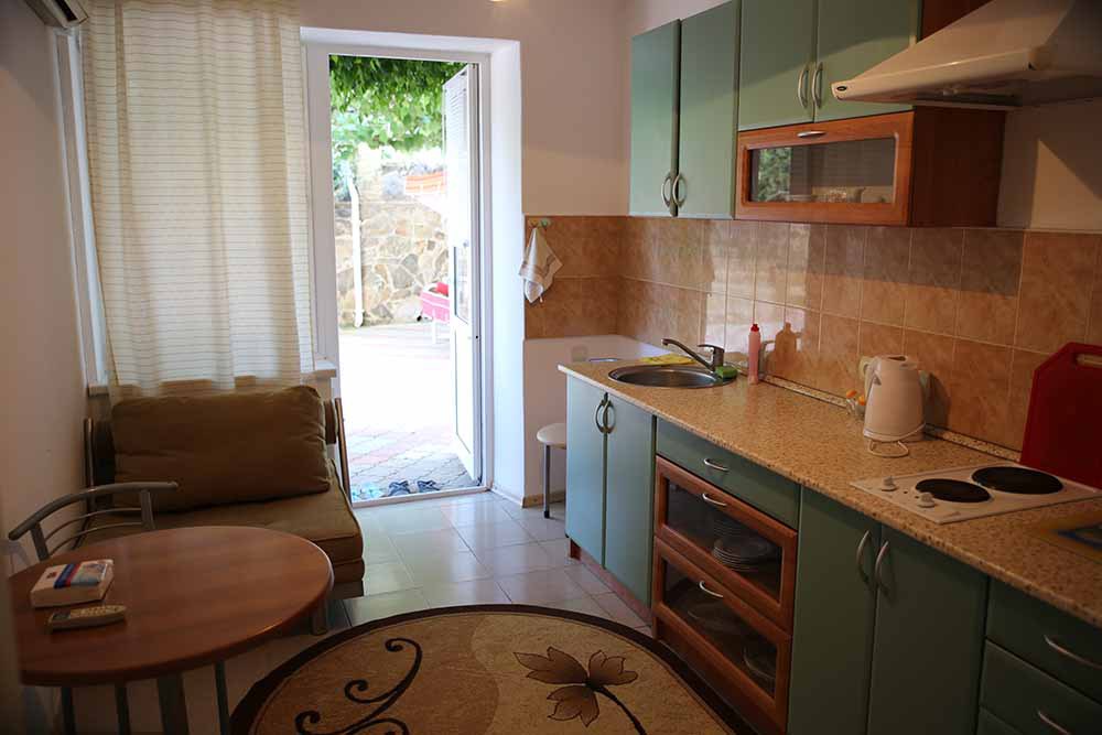 двухкомнатный, 4-местный номер, общая площадь – 44 м.кв.) - Спальня-гостиная (двуспальная кровать, диван, кабельное ТВ, кондиционер), детская комната (2 односпальные кровати), холл (холодильник), санузел (душ, унитаз, умывальник, фен, количество полотенец – 2 на 1 человека). Балкон с видом на море. Летний дворик для отдыха.