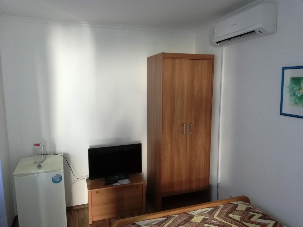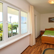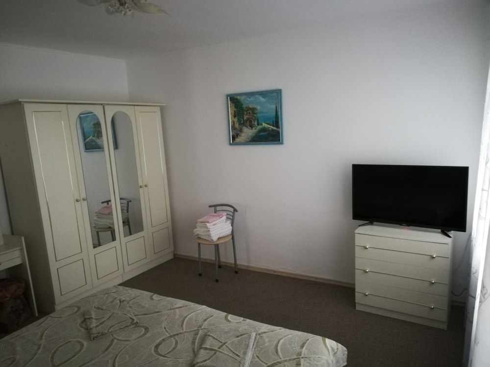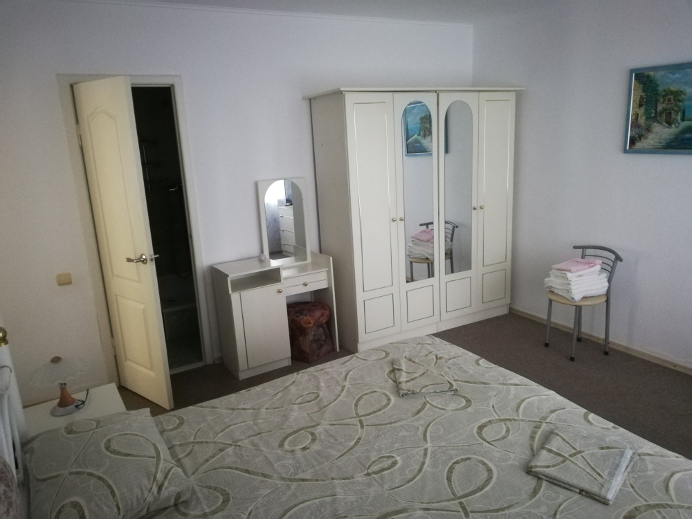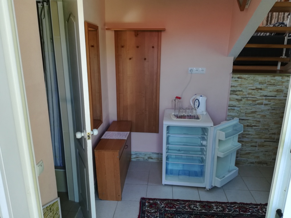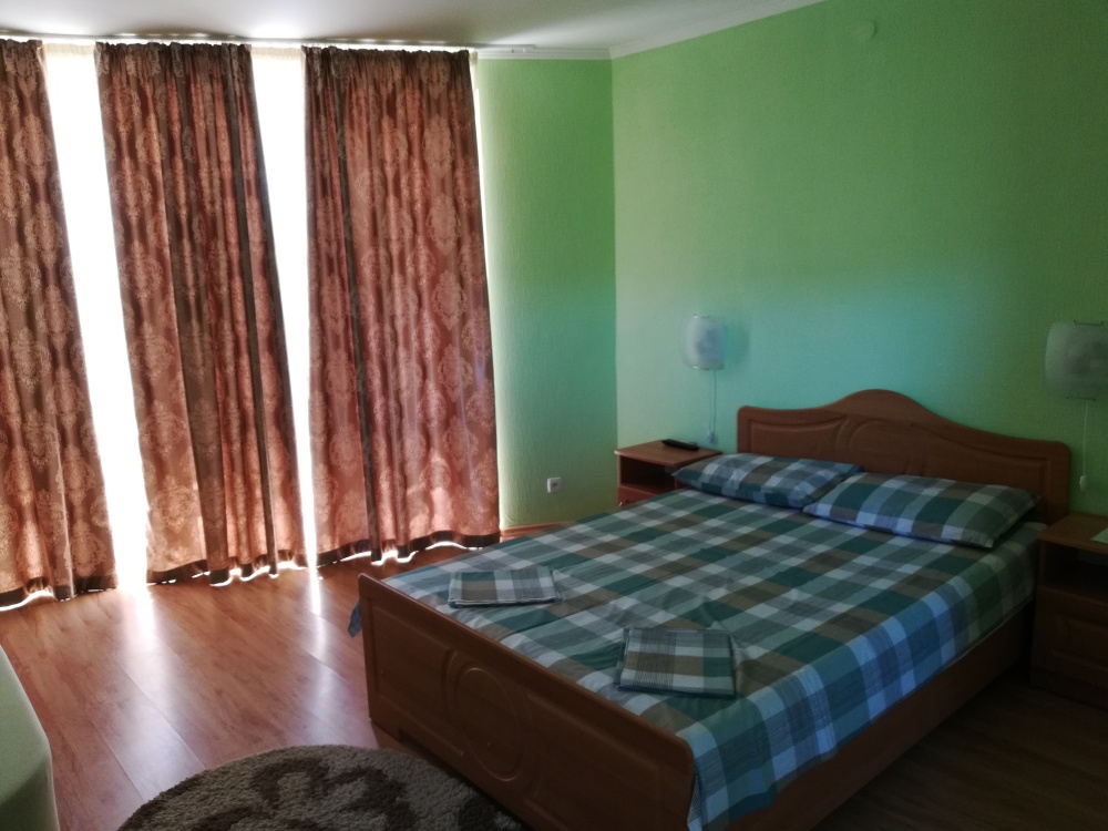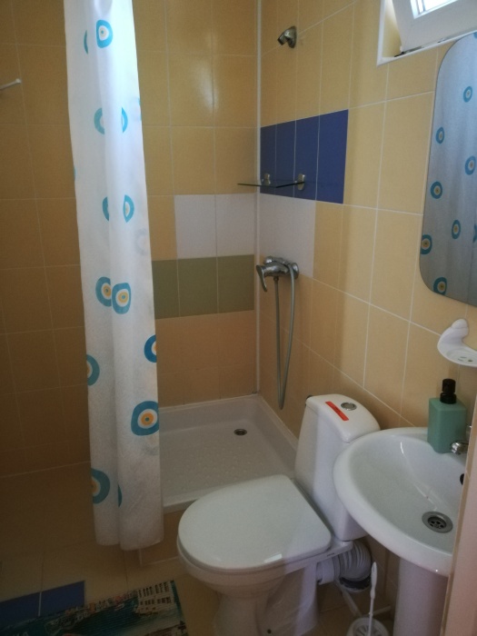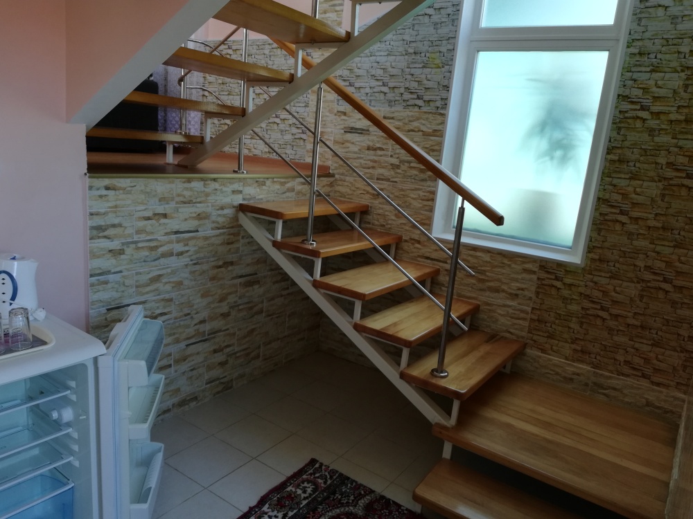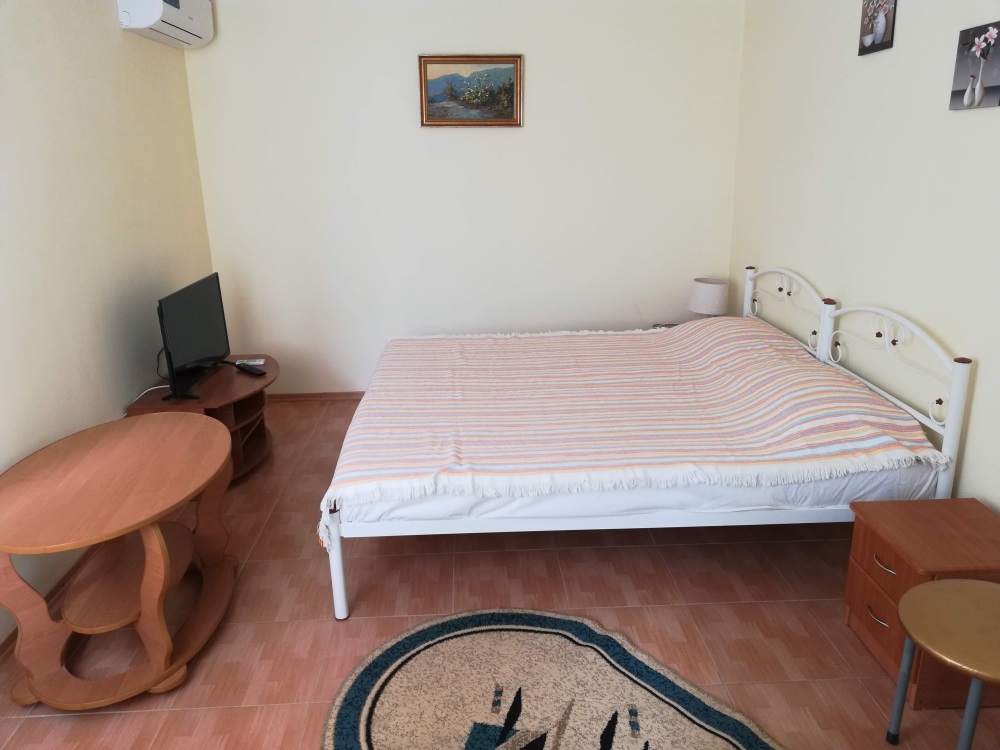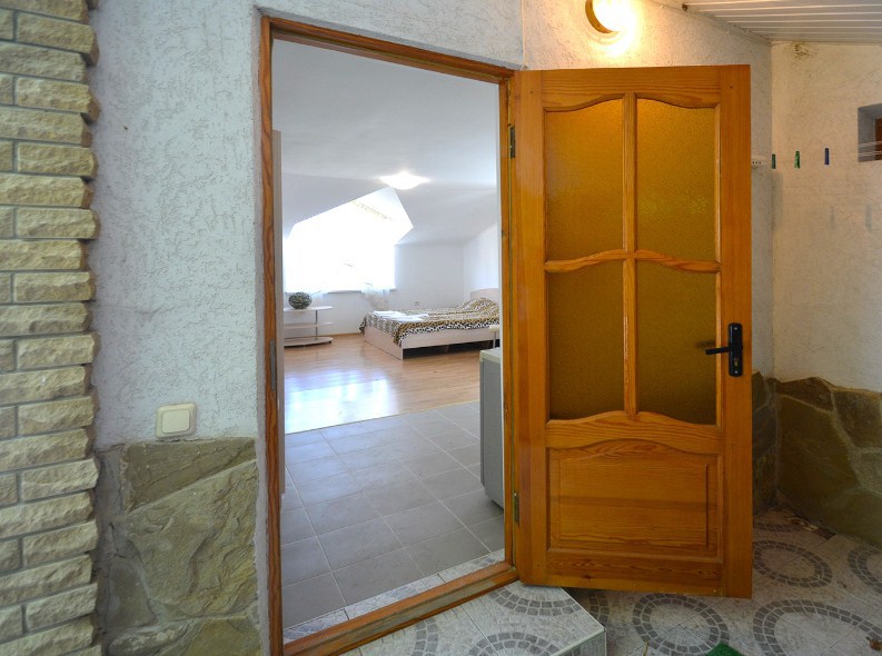 двухкомнатный, 4-местный номер, общая площадь – 44 м.кв.) - Спальня-гостиная (двуспальная кровать, диван, кабельное ТВ, кондиционер), детская комната (2 односпальные кровати), холл (холодильник), санузел (душ, унитаз, умывальник, фен, количество полотенец – 2 на 1 человека). Балкон с видом на море. Летний дворик для отдыха.