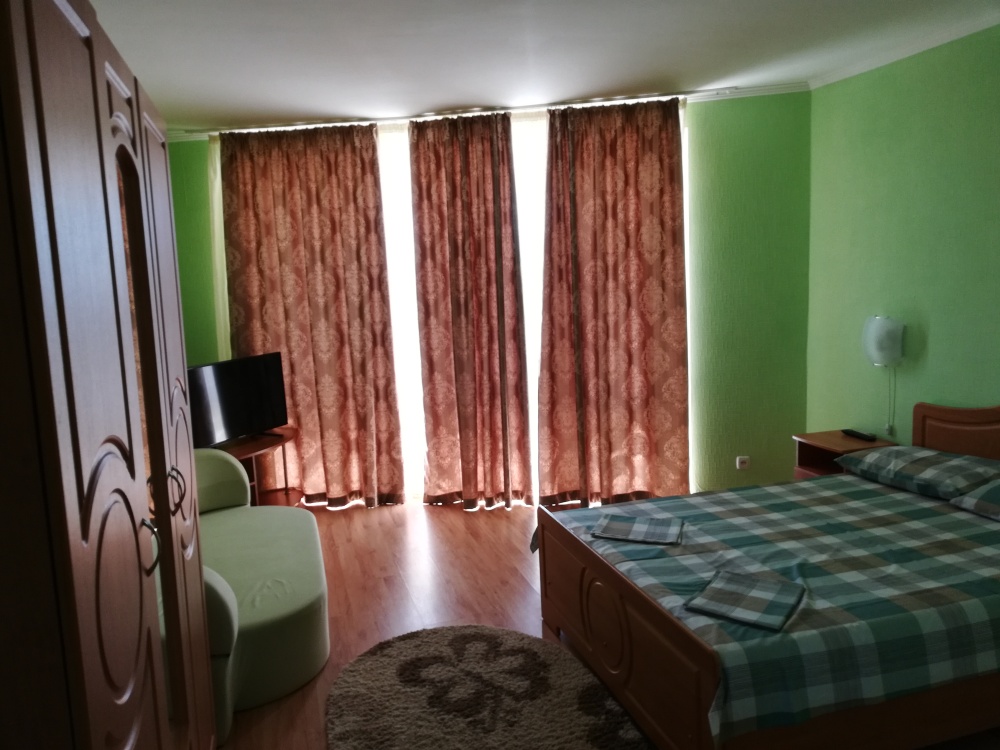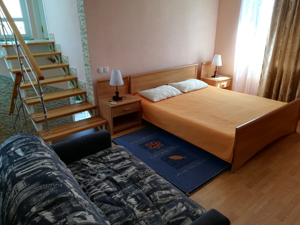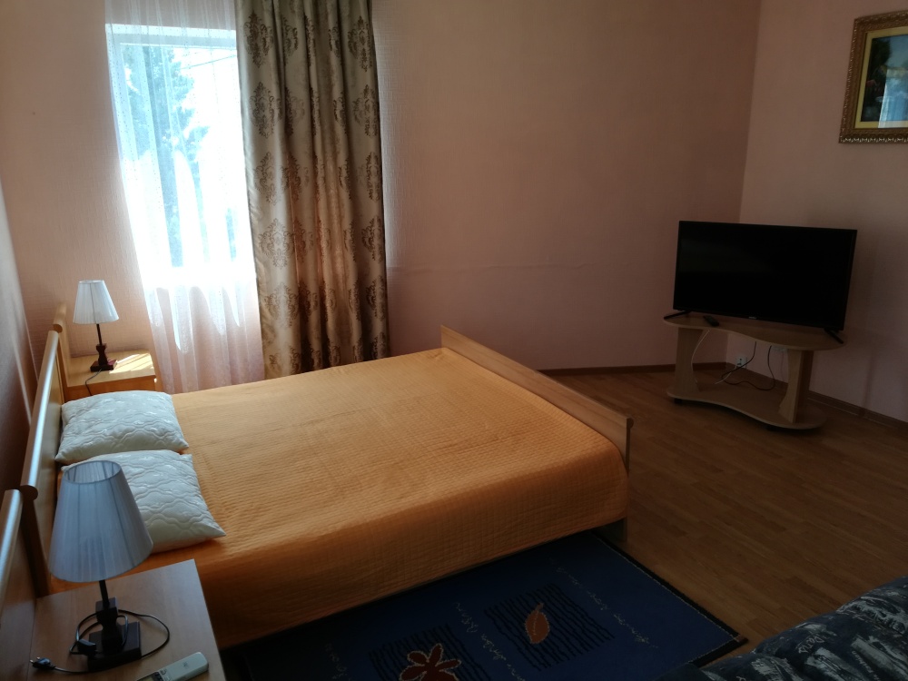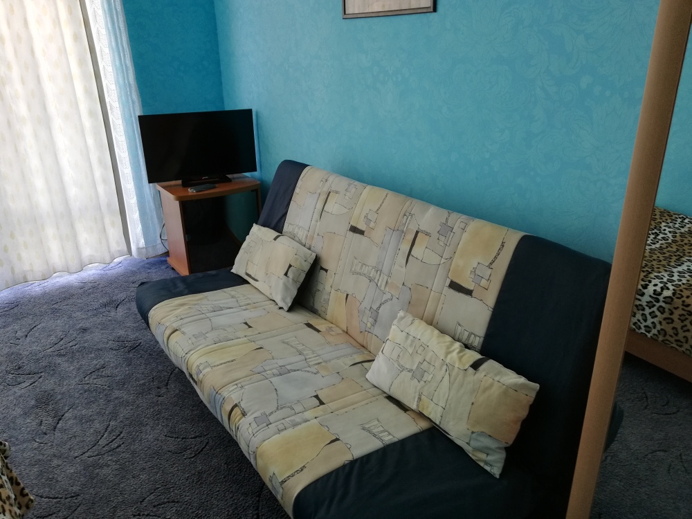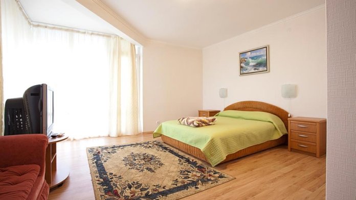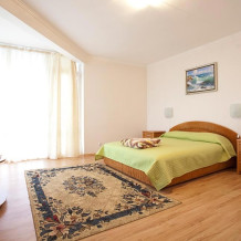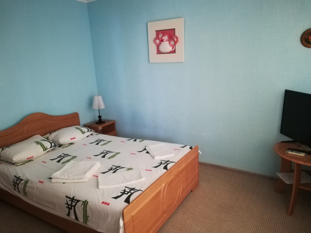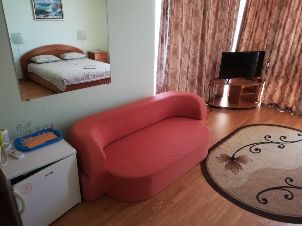 Спальня (двуспальная кровать, кабельное ТВ) с балконом, холодильник, санузел (душевая кабина, унитаз, умывальник, косметический набор, фен, количество полотенец – 2 на 1 человек)+комната с раскладным диваном.