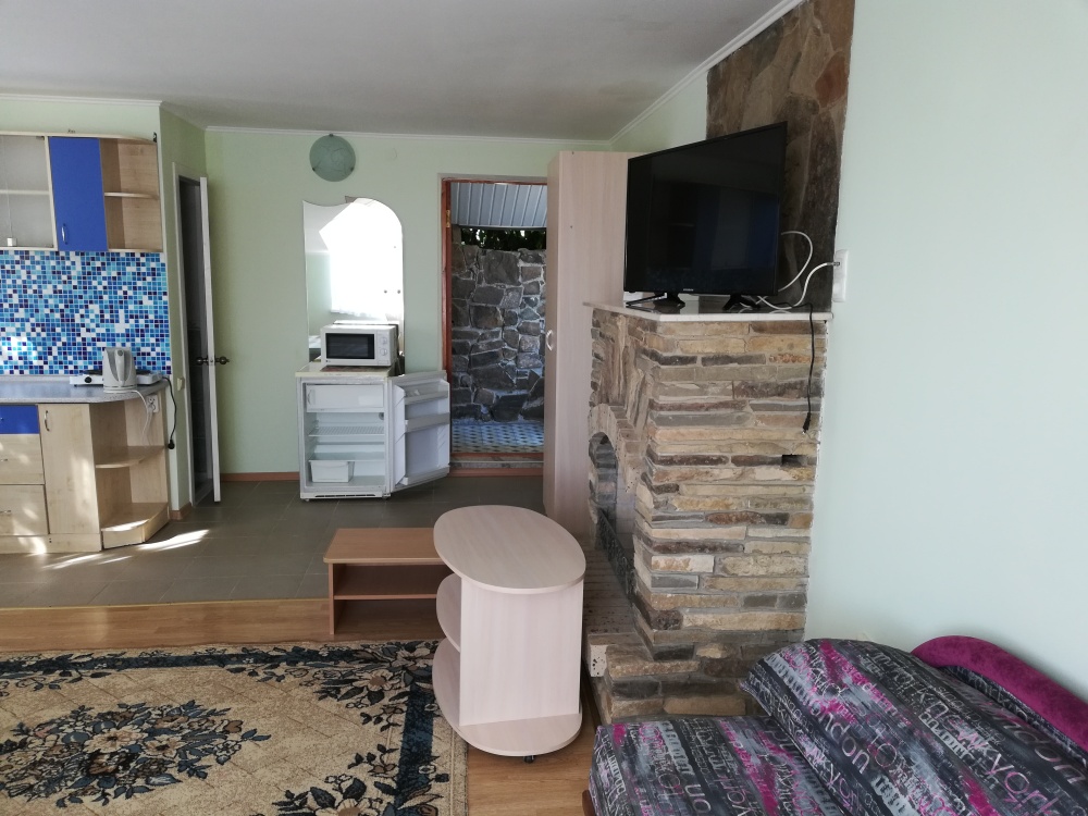 Спальня (двуспальная кровать, кабельное ТВ), кухня со всем необходимым, для ещё большей свободы и независимости, (холодильник, электроплита, микроволновая печь, электрочайник, посуда, кондиционер), санузел (душевая кабина, унитаз, умывальник, фен, количество полотенец – 2 на 1 человек). Летний дворик для отдыха.