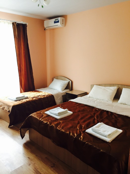 В каждом номере: телевизор плазменный; спутниковое ТV; кондиционер; холодильник; бесплатный WI-FI; полотенца для лица и для тела, гель для душа, графин, стаканы, покрытие пола – ламинат, сушка для вещей. Уборка в номере и смена постельного белья 1 раз в 5 дней.При заселении от администрации комплимент - бутылка вина в подарок!