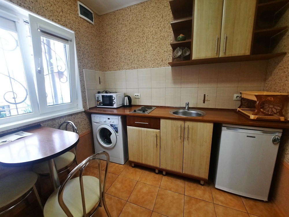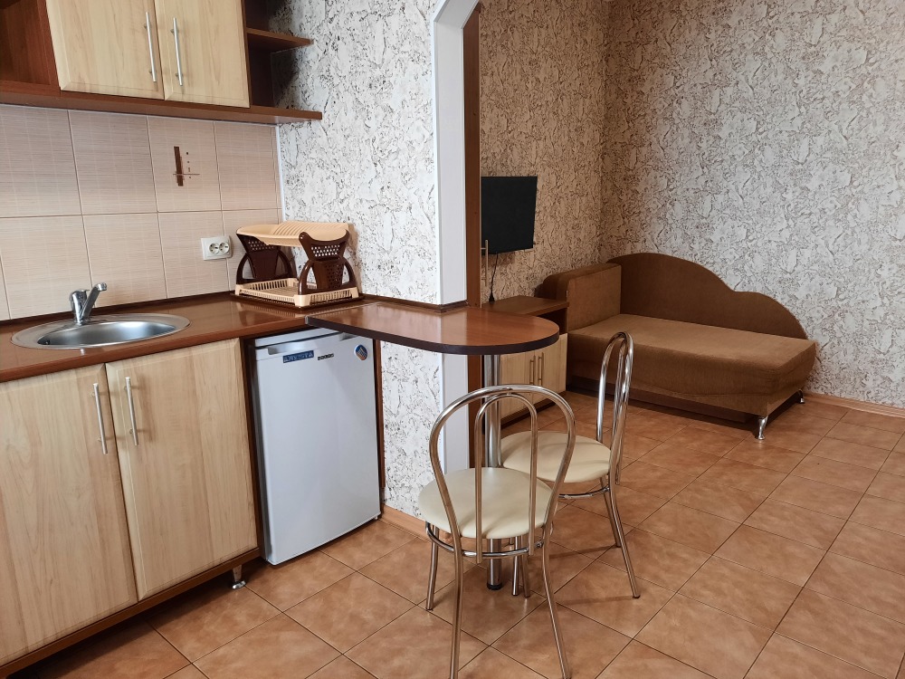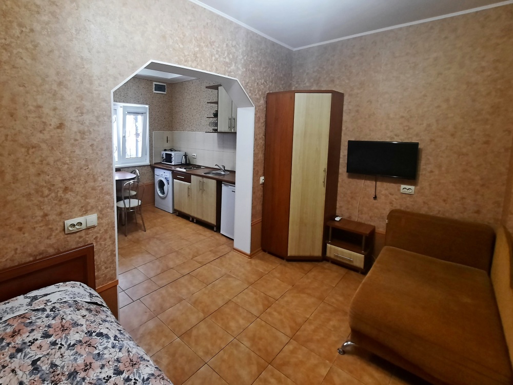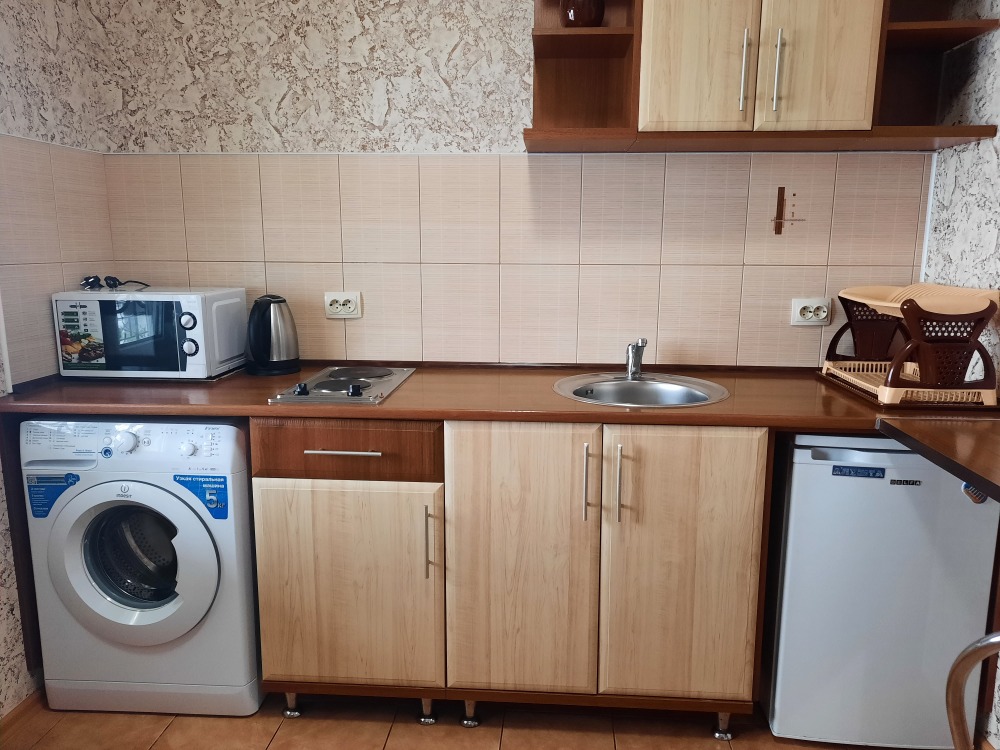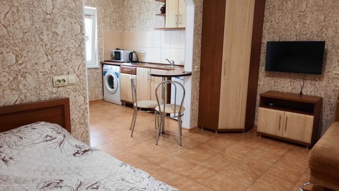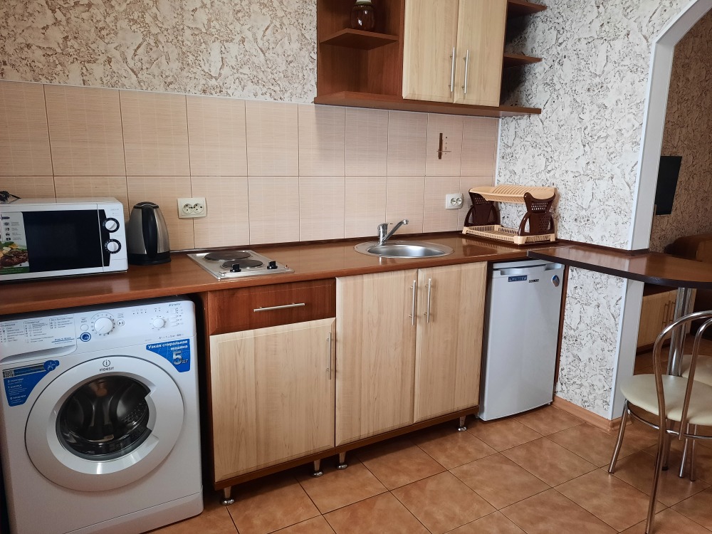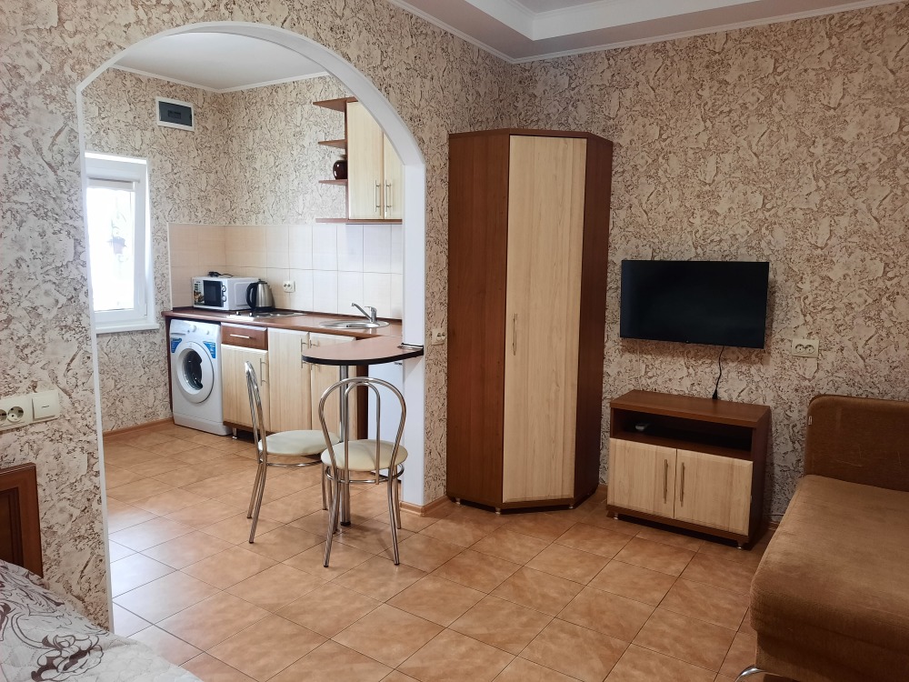 Есть все необходимое: двух спальная кровать, раскладной диван-тубус (три полноценных спальных места), шкаф, телевизор, кондиционер, кухонный уголок, посуда, холодильник, электрическая плита, электро чайник, микроволновая печь, стиральная машина, утюг, фен, wi-fi. Горячая и холодная вода круглосуточно. При входе столик и стулья.