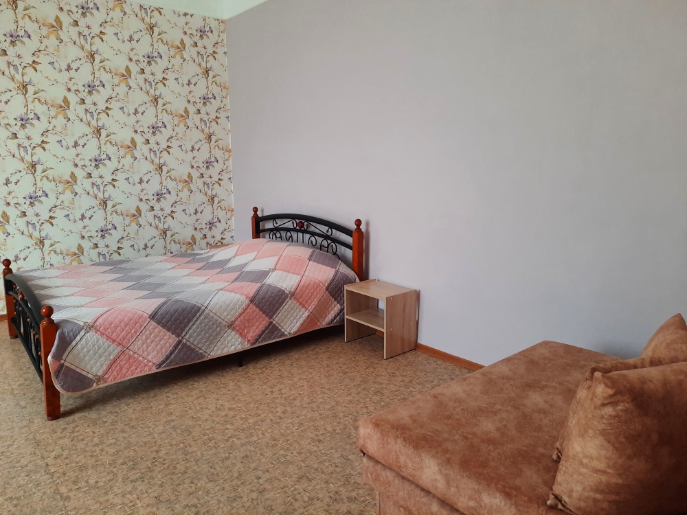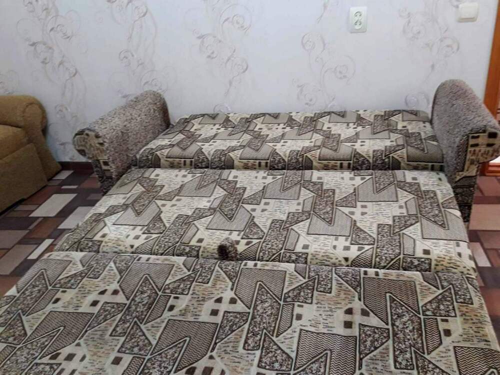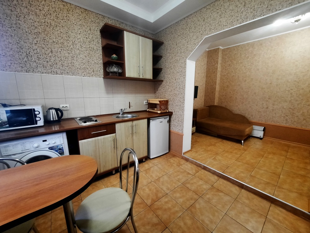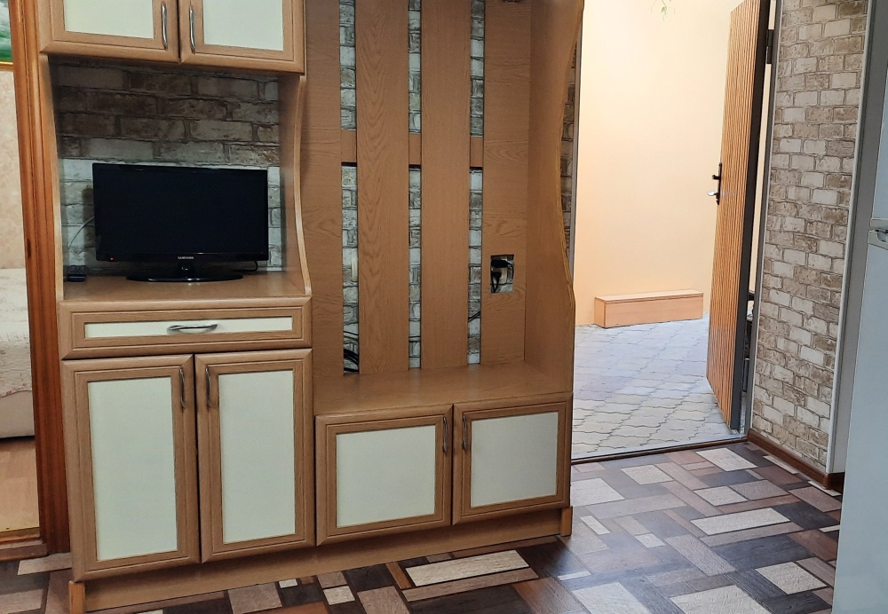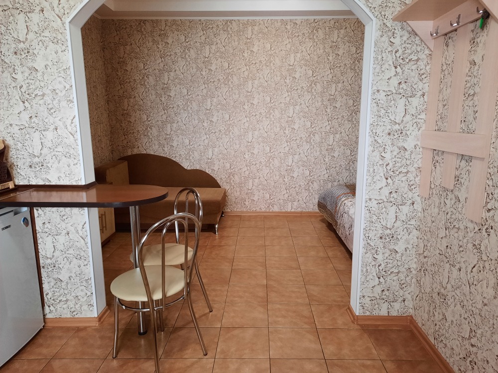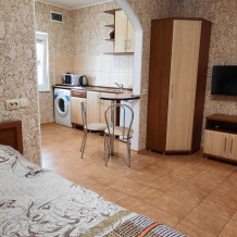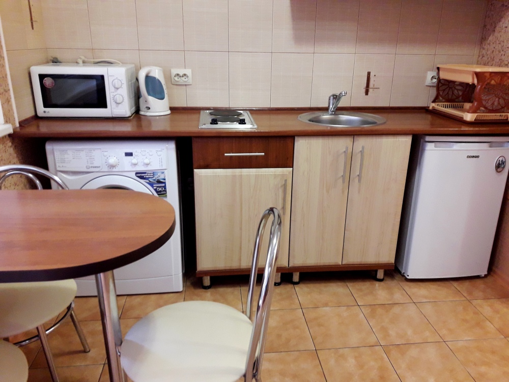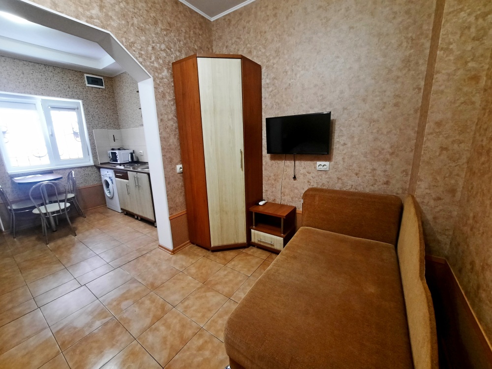 Есть все необходимое: двух спальная кровать, раскладной диван-тубус (три полноценных спальных места), шкаф, телевизор, кондиционер, кухонный уголок, посуда, холодильник, электрическая плита, электро чайник, микроволновая печь, стиральная машина, утюг, фен, wi-fi. Горячая и холодная вода круглосуточно. При входе столик и стулья.