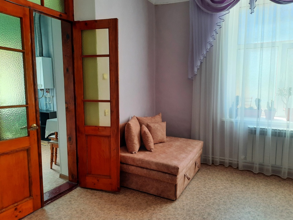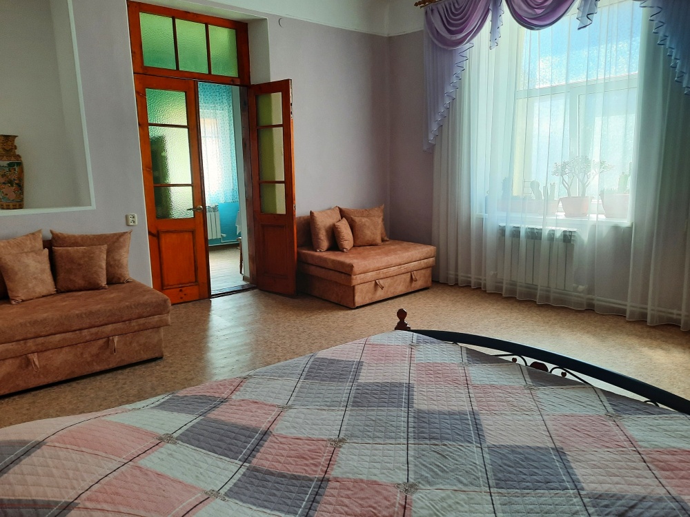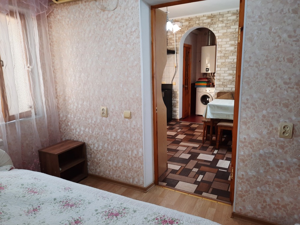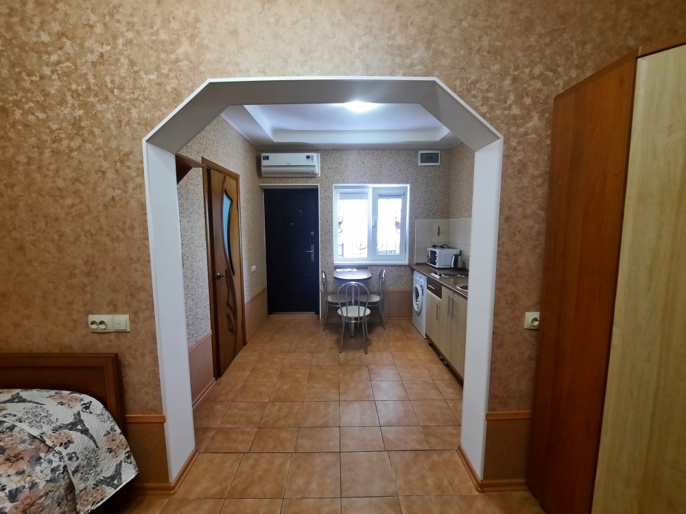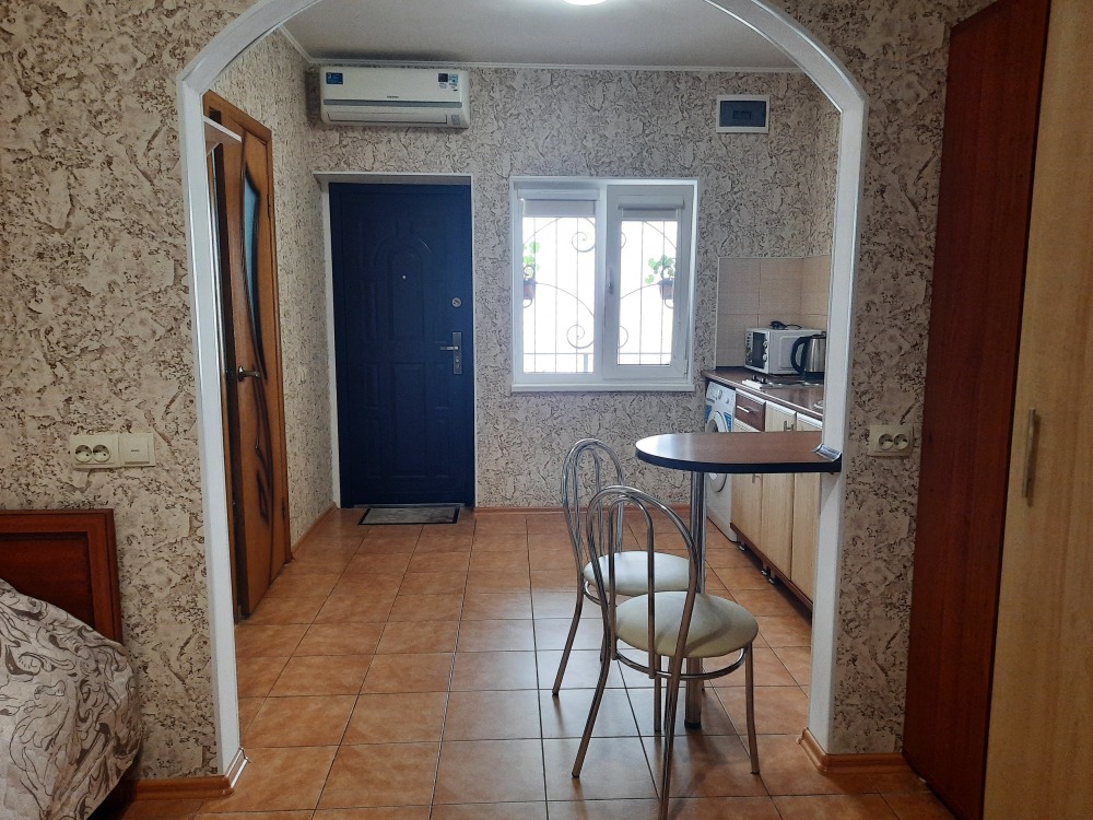 Две изолированные комнаты и проходная кухня-гостиная: двух спальная кровать, три раскладных дивана (пять полноценных спальных мест), шкаф, два телевизора, два кондиционера, кухонный уголок, посуда, холодильник, газовая плита, микроволновая печь, стиральная машина, утюг, фен, wi-fi. Сан узел, душевая кабина. Горячая и холодная вода круглосуточно. Автономное отопление позволяет комфортно отдыхать и в зимний период. При входе столик и стулья. Уборка, смена постельного белья и полотенец бесплатно, один раз в неделю.