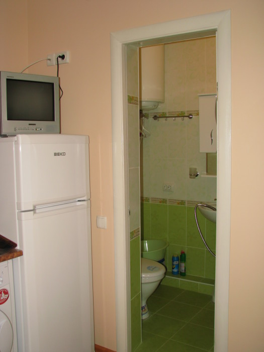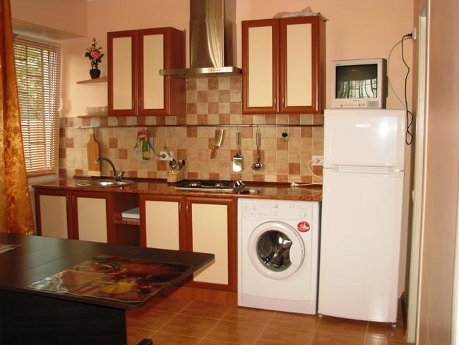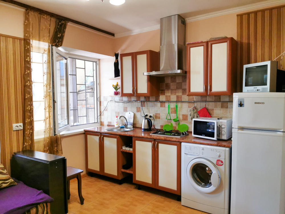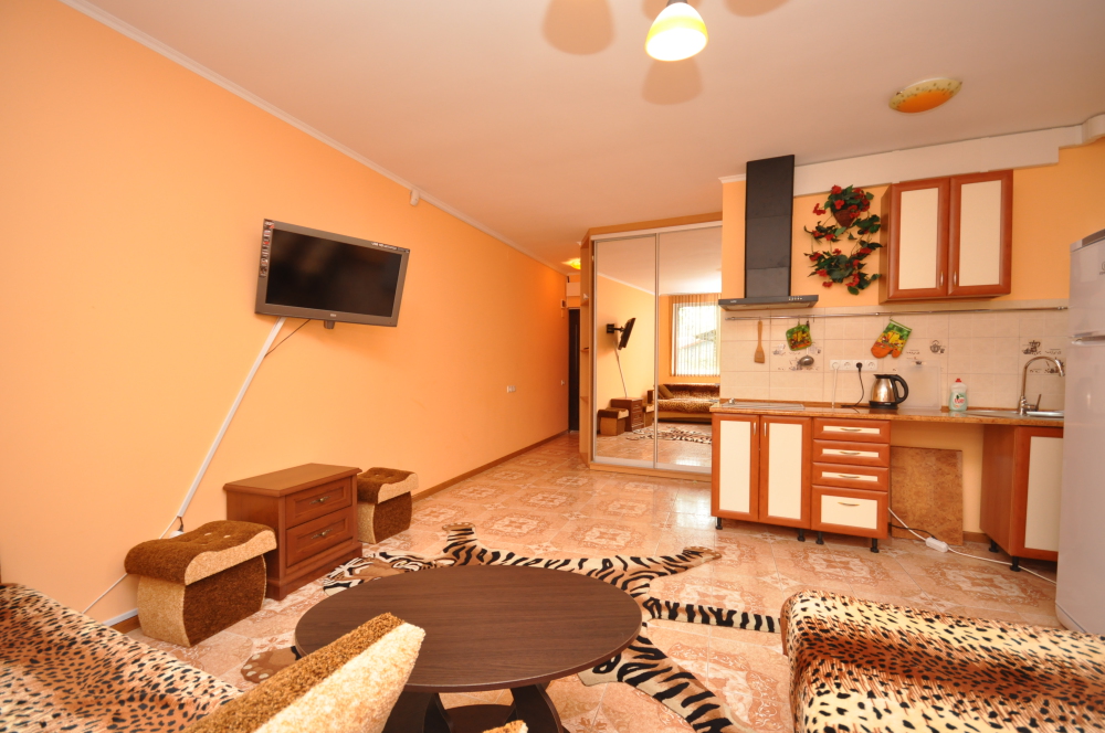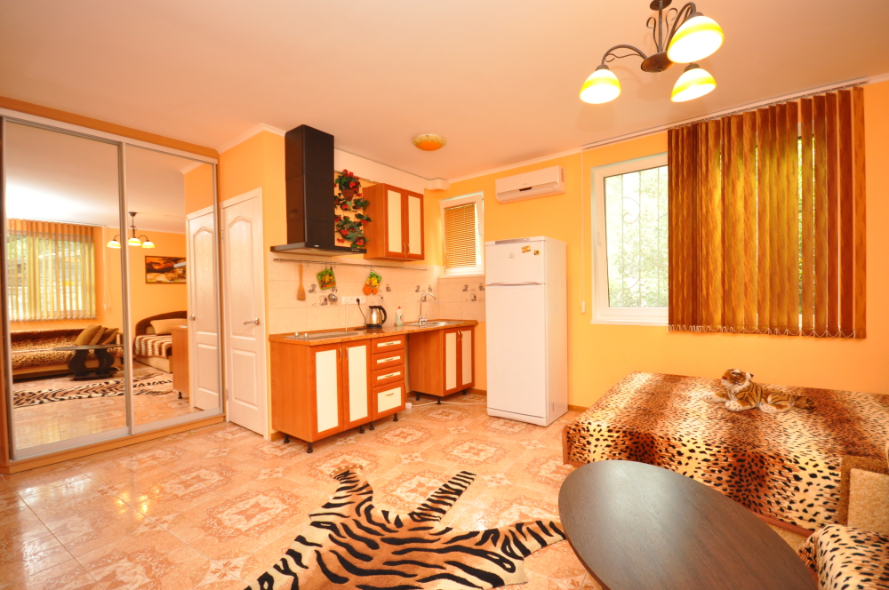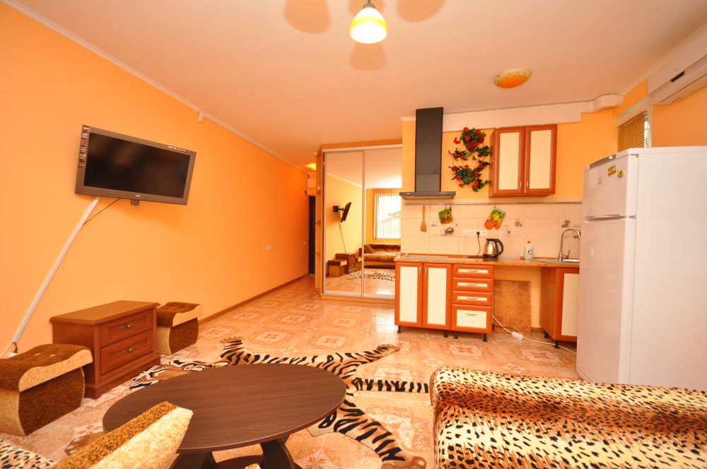 Первая комната - кухня-студио. Она оборудована всем необходимым (плита, холодильник, стиральная машинка, ТВ, новая мебель, кондиционер). Также в комнате установлен двуспальный диван.