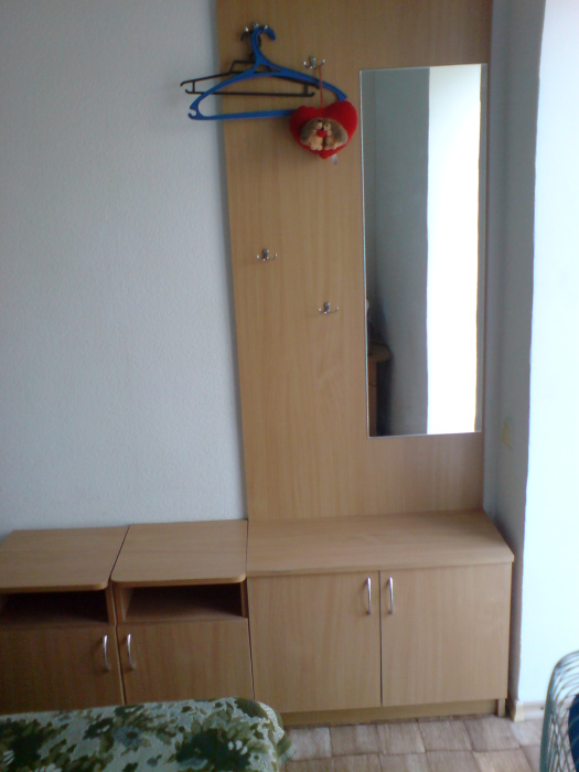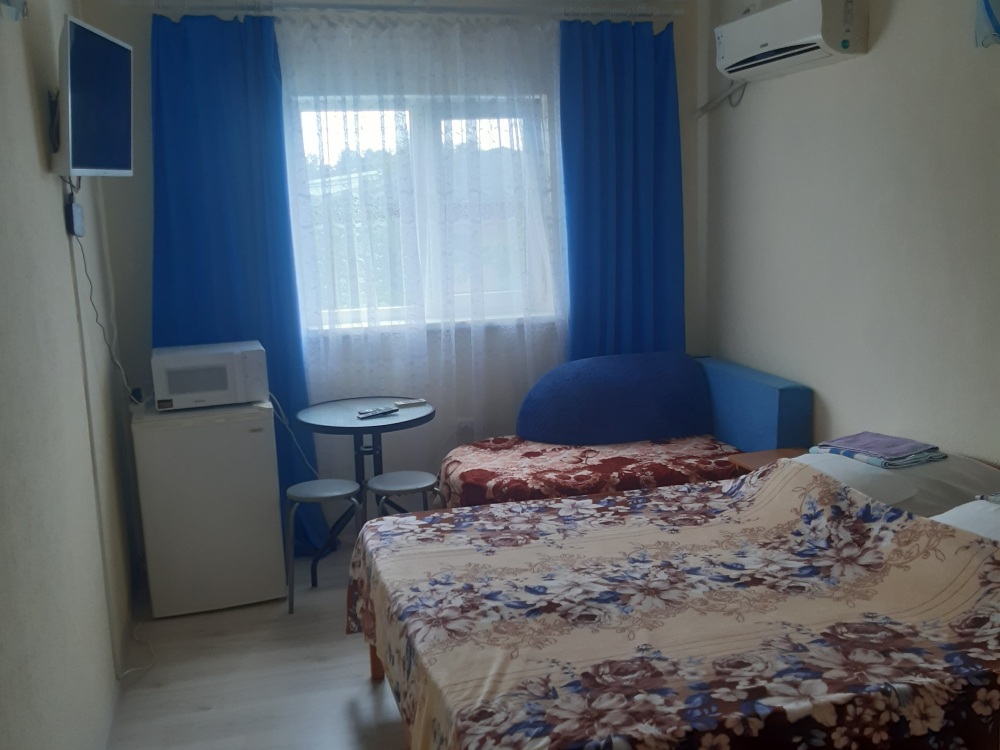 номер со всеми удобствами и встроенной мини-кухней. В Номере две кровати, диван, вешалка для одежды с зеркалом, тумба для обуви, прикроватные тумбочки, журнальный столик, вентилятор, стеклопакеты, москитные сетки. Отделан современными материалами.