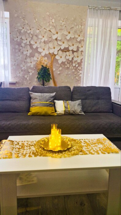 Площадь квартиры почти 62 кв. м, а количество спальных мест 6, из них 3 раздельных, двухспальная кровать, 2 дивана.
