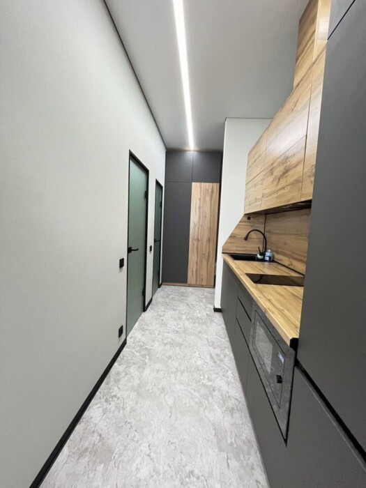 Техника на кухне: встроенный холодильник, индукционная плита, электрочайник, микроволновка.