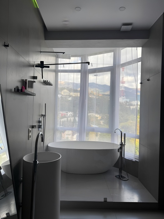 - Эксклюзивный Комфорт: Каменная ванна-чаша с видом на горы, премиальная сантехника (смесители, душевая система с термостатом Abber, тропический душ).