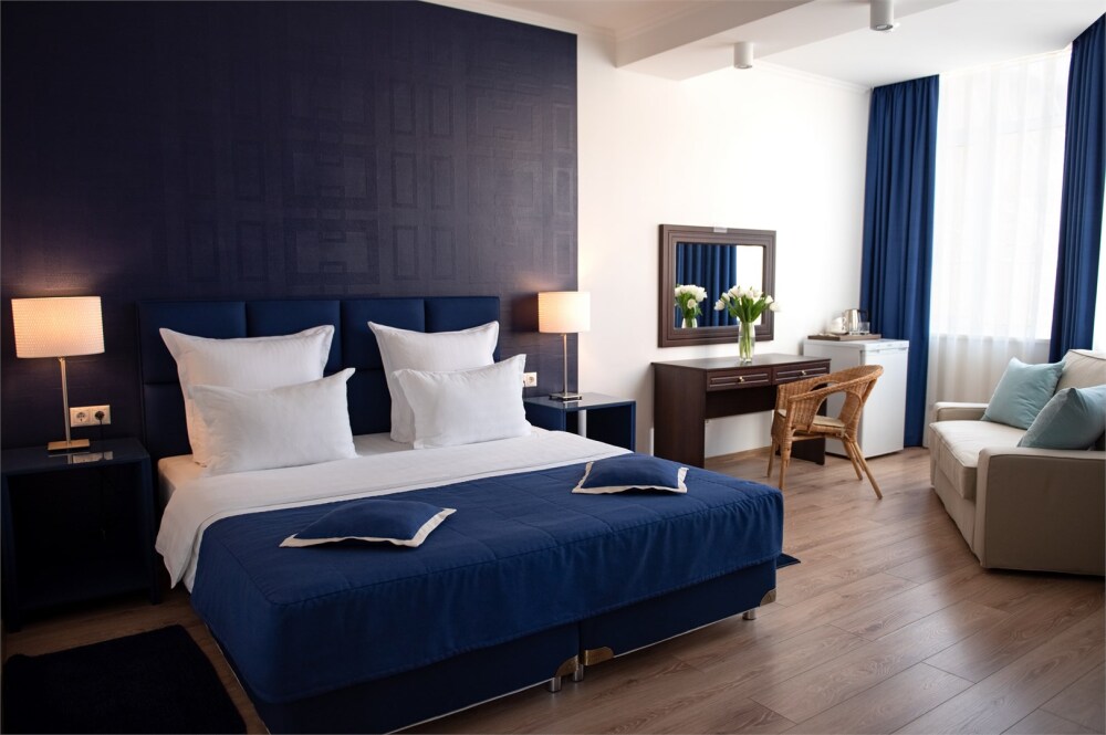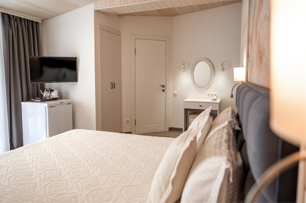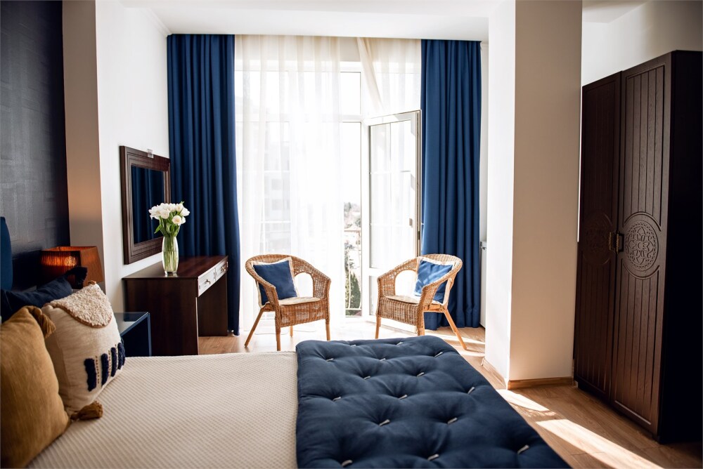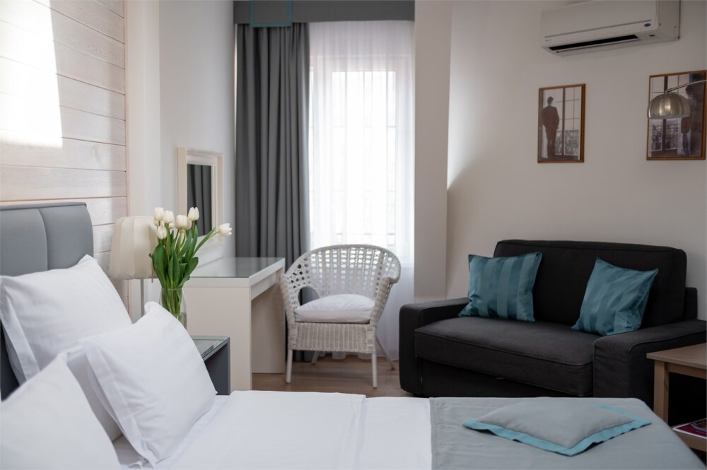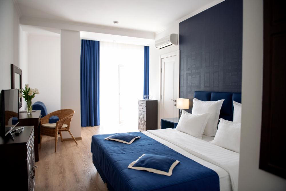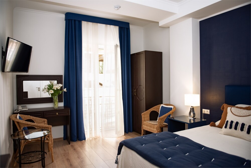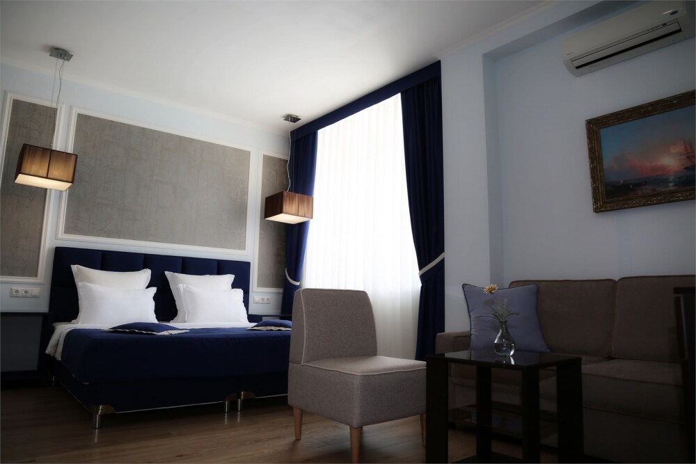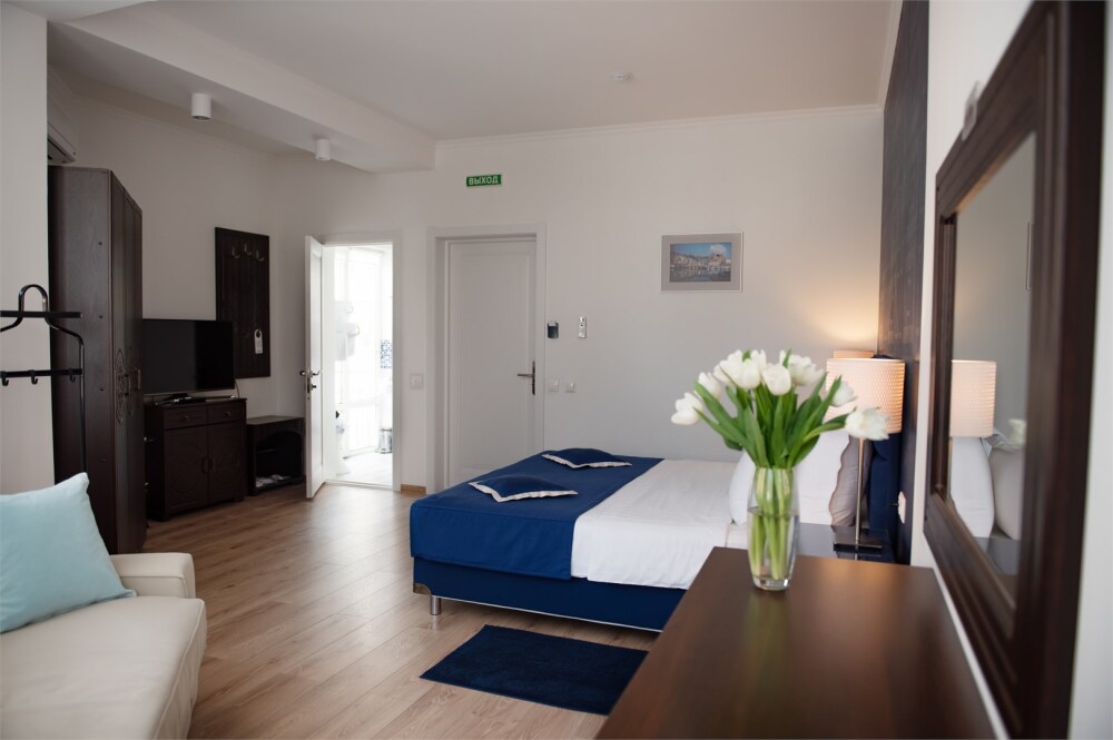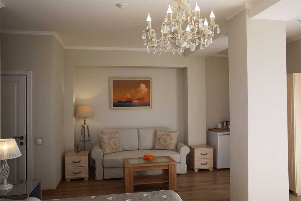 Элегантный и просторный однокомнатный номер площадью 39,5 кв. м. оформлен в классическом стиле и пастельных тонах, с видом на море и горы. Оборудован 1 двуспальной кроватью или 2 односпальными, дополнительным местом (диван), балконом и всем необходимым для комфортного отдыха.