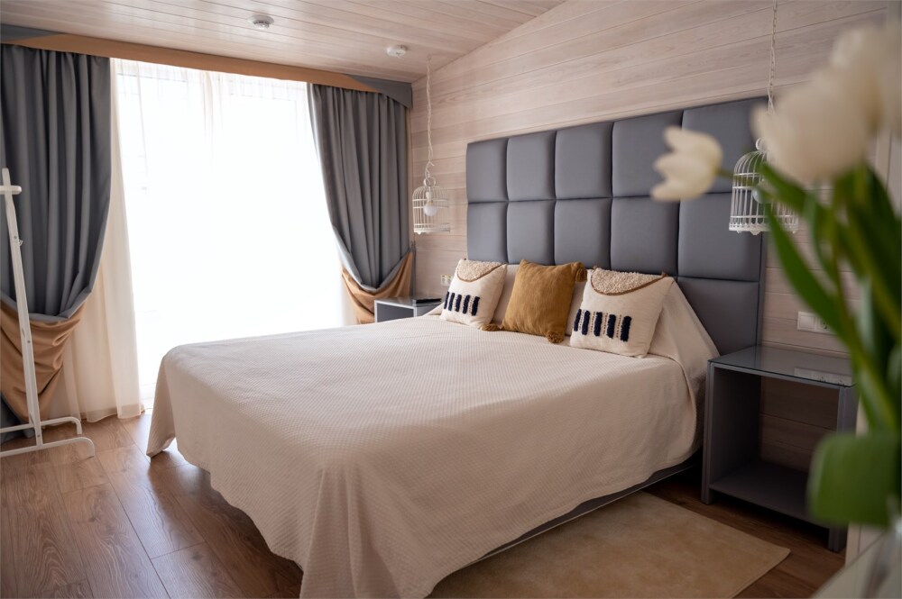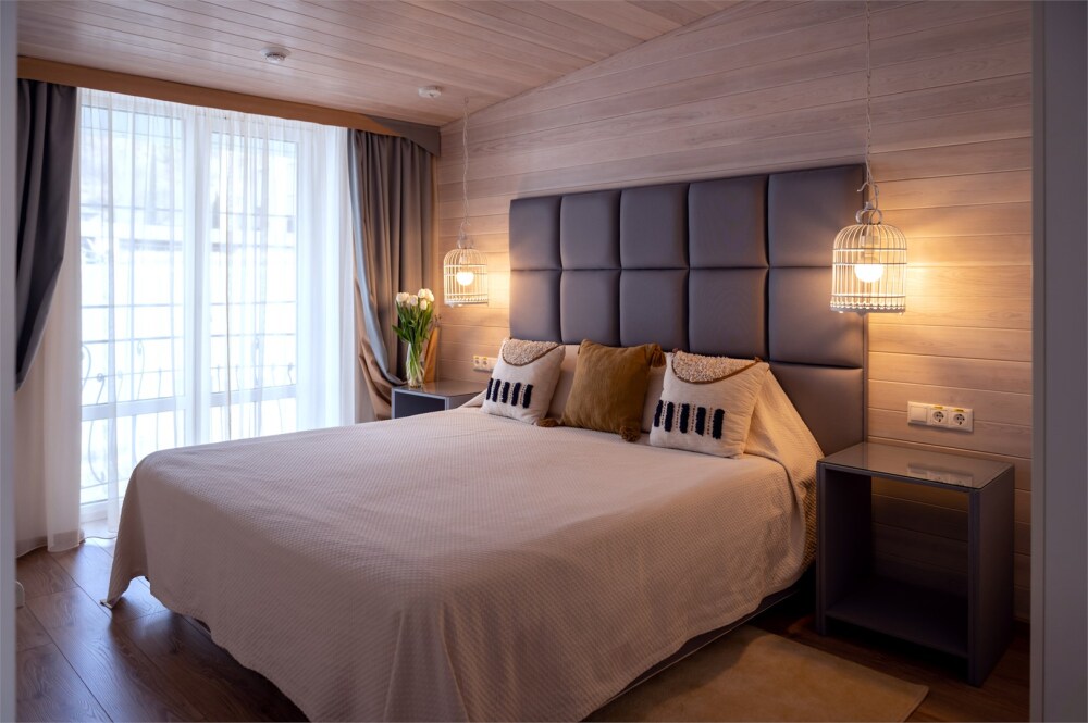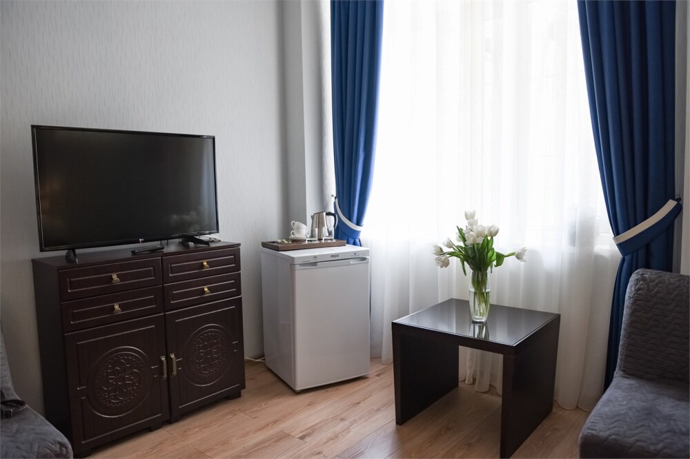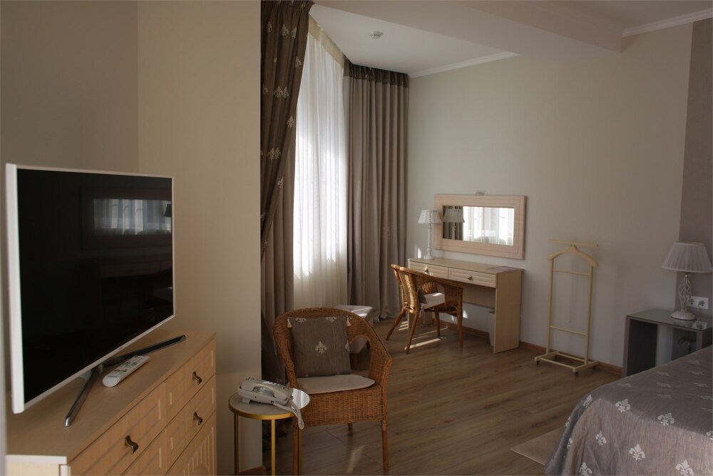Большой комфортабельный 2-х комнатный номер 40,7 кв. м., с видом на горы, оборудован всем необходимым для отдыха, идеально подойдет для большой семьи. В номере: 2 спальни, 2 Балкона, 2 TV, Wi-Fi. По запросу возможно установить детскую кроватку.