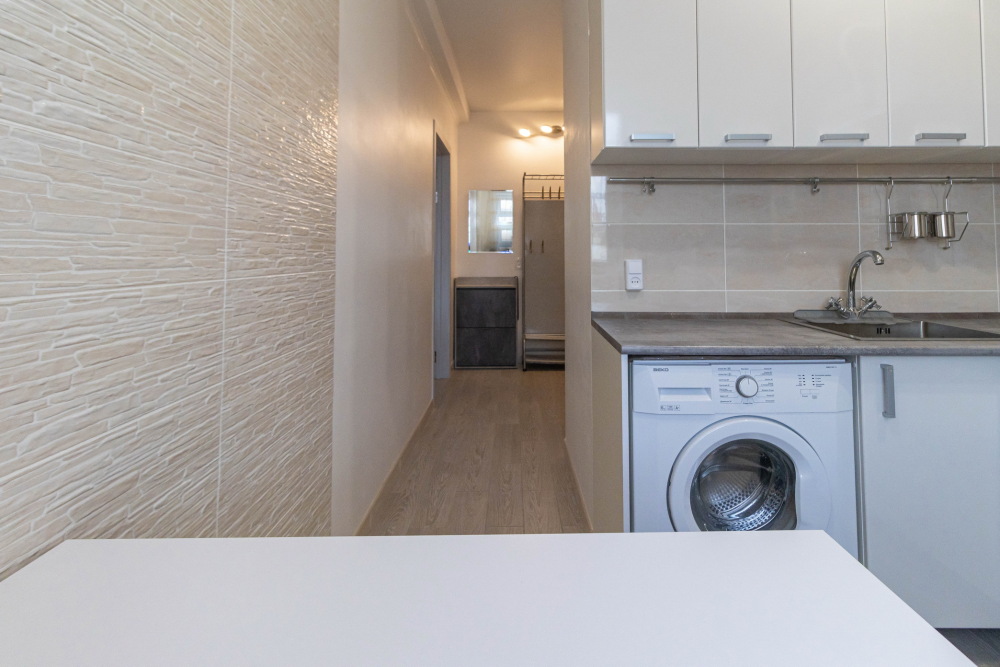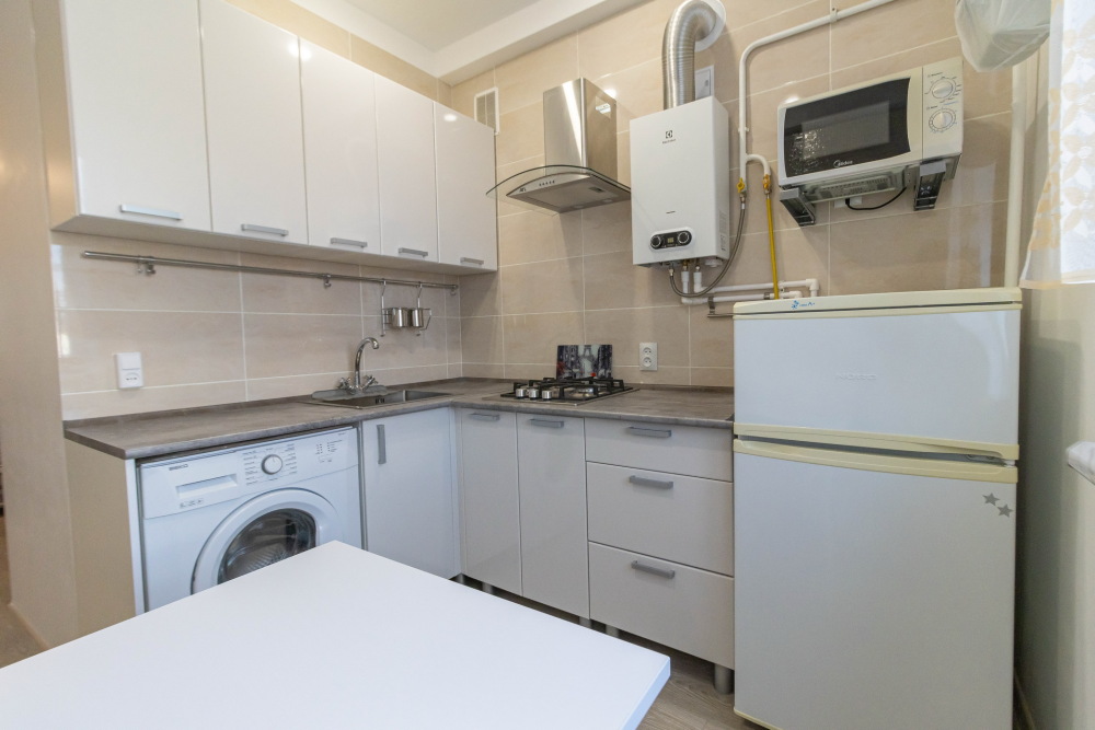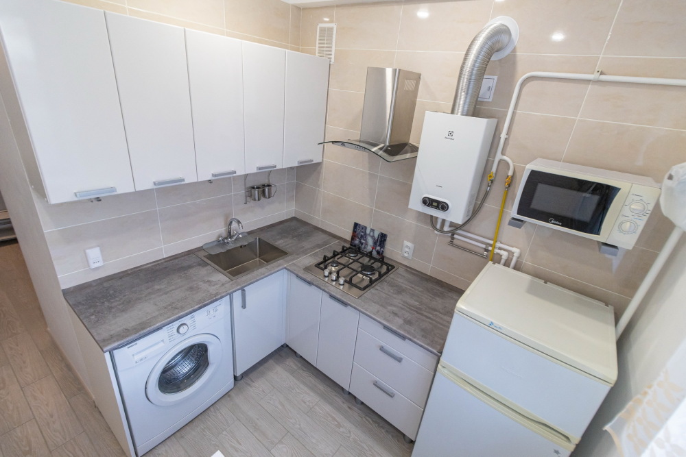 На небольшой уютной кухне разместилось много полезных вещей и приборов: газовая колонка-автомат экономно подогреет воду, мощная вытяжка освежит воздух, в больших ящиках и столах много места для хранения. Ну и, конечно, стиральная машина-автомат, холодильник и микроволновка.