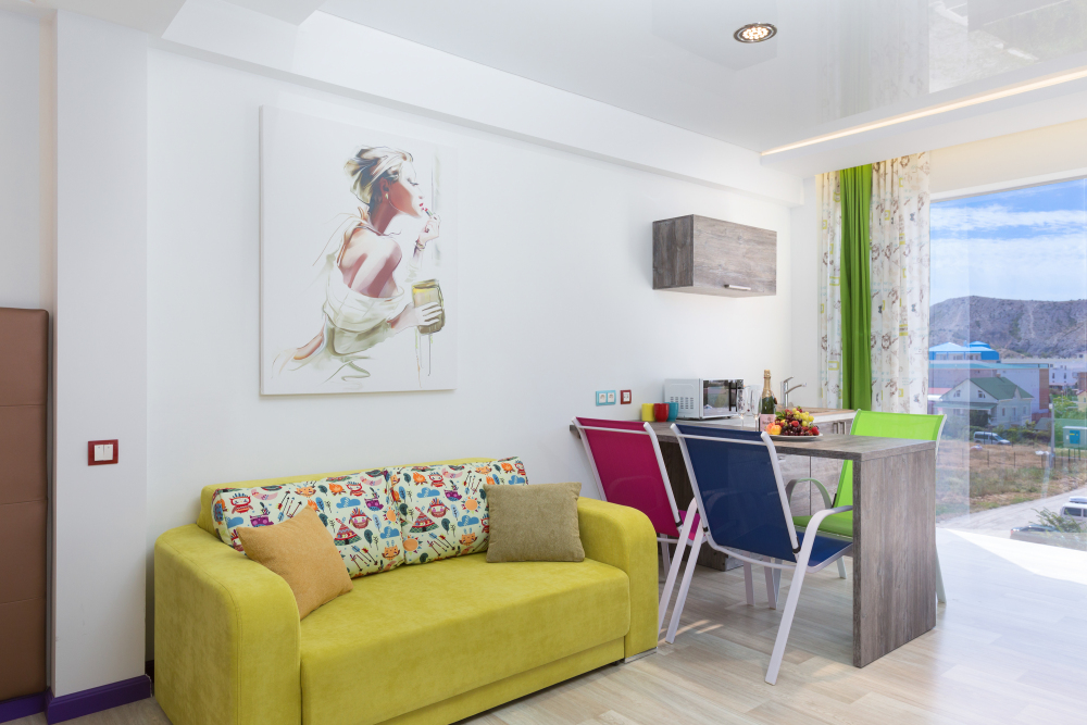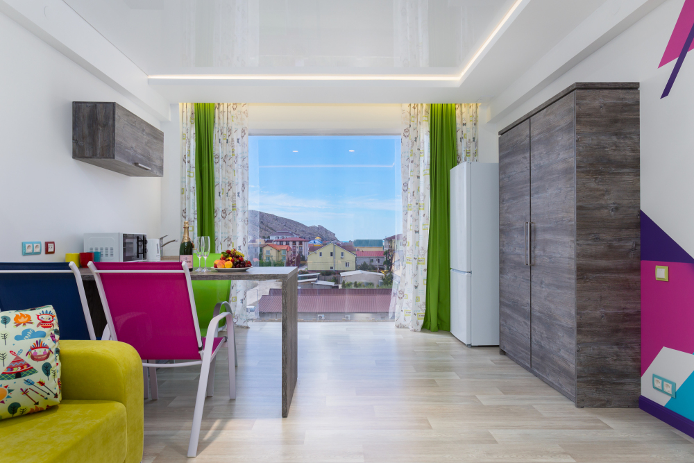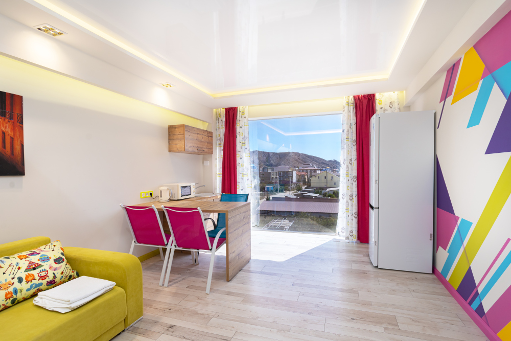 Гармоничное сочетание современного авторского дизайна и особой домашней атмосферы - это просторные номера нашего отеля. Все номера включают спальню с большой двуспальной кроватью, вместительный санузел, оснащённый эксклюзивной душевой кабиной и банными принадлежностями. Большие панорамные окна придают особый летний колорит и делают комнаты более светлыми. Уборка номеров 1 раз в 3 дня. Такие уютные и до мелочей продуманные номера отеля обязательно будут по достоинству оценены взыскательными любителями отдыха в Крыму.