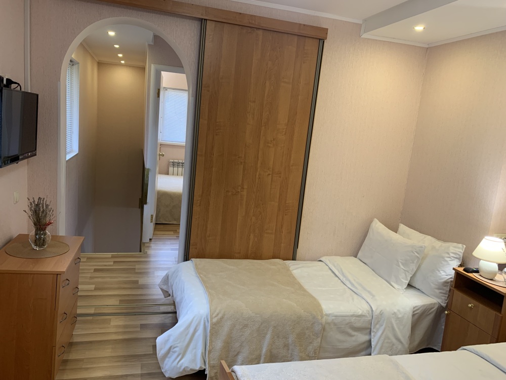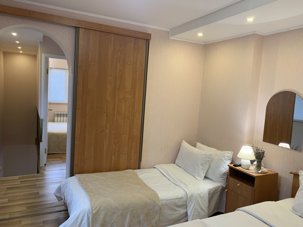 в одной спальне двуспальная и односпальная кровати, в другой спальне двуспальная кровать.