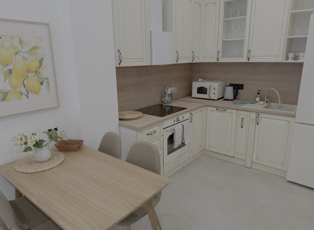 Третья комната сочетает функциональность кухни и гостиной зоны. Здесь установлена стильная встраиваемая техника (электрическая варочная панель с духовкой, посудомоечная машина), микроволновая печь, электрочайник и вместительный двухкамерный холодильник. Уголок с мягким диваном приглашает расслабиться после насыщенного дня, а изящный обеденный стол с удобными стульями позволит насладиться семейным ужином.